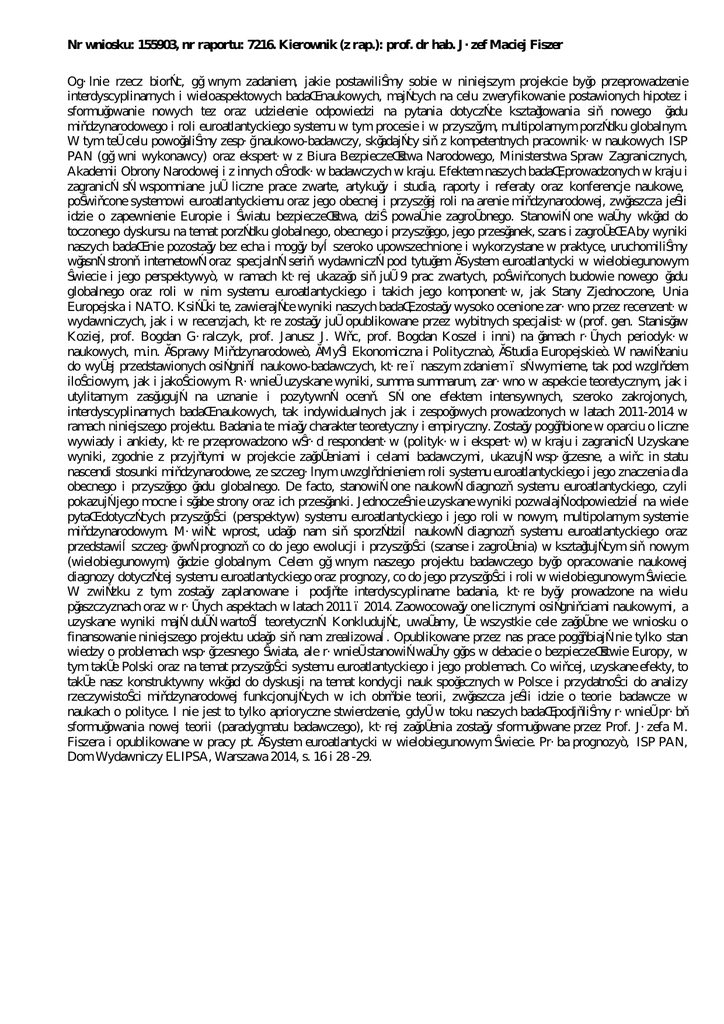 Nr wniosku: 155903, nr raportu: 7216. Kierownik (z rap.): prof. dr hab. Józef Maciej Fiszer Ogólnie rzecz biorąc, głównym zadaniem, jakie postawiliśmy sobie w niniejszym projekcie było przeprowadzenie interdyscyplinarnych i wieloaspektowych badań naukowych, mających na celu zweryfikowanie postawionych hipotez i sformułowanie nowych tez oraz udzielenie odpowiedzi na pytania dotyczące kształtowania się nowego ładu międzynarodowego i roli euroatlantyckiego systemu w tym procesie i w przyszłym, multipolarnym porządku globalnym. W tym też celu powołaliśmy zespół naukowo-badawczy, składający się z kompetentnych pracowników naukowych ISP PAN (główni wykonawcy) oraz ekspertów z Biura Bezpieczeństwa Narodowego, Ministerstwa Spraw Zagranicznych, Akademii Obrony Narodowej i z innych ośrodków badawczych w kraju. Efektem naszych badań, prowadzonych w kraju i zagranicą są wspomniane już liczne prace zwarte, artykuły i studia, raporty i referaty oraz konferencje naukowe, poświęcone systemowi euroatlantyckiemu oraz jego obecnej i przyszłej roli na arenie międzynarodowej, zwłaszcza jeśli idzie o zapewnienie Europie i światu bezpieczeństwa, dziś poważnie zagrożonego. Stanowią one ważny wkład do toczonego dyskursu na temat porządku globalnego, obecnego i przyszłego, jego przesłanek, szans i zagrożeń. Aby wyniki naszych badań nie pozostały bez echa i mogły być szeroko upowszechnione i wykorzystane w praktyce, uruchomiliśmy własną stronę internetową oraz specjalną serię wydawniczą pod tytułem „System euroatlantycki w wielobiegunowym świecie i jego perspektywy”, w ramach której ukazało się już 9 prac zwartych, poświęconych budowie nowego ładu globalnego oraz roli w nim systemu euroatlantyckiego i takich jego komponentów, jak Stany Zjednoczone, Unia Europejska i NATO. Książki te, zawierające wyniki naszych badań, zostały wysoko ocenione zarówno przez recenzentów wydawniczych, jak i w recenzjach, które zostały już opublikowane przez wybitnych specjalistów (prof. gen. Stanisław Koziej, prof. Bogdan Góralczyk, prof. Janusz J. Węc, prof. Bogdan Koszel i inni) na łamach różnych periodyków naukowych, m.in. „Sprawy Międzynarodowe”, „Myśl Ekonomiczna i Polityczna”, „Studia Europejskie”. W nawiązaniu do wyżej przedstawionych osiągnięć naukowo-badawczych, które – naszym zdaniem – są wymierne, tak pod względem ilościowym, jak i jakościowym. Również uzyskane wyniki, summa summarum, zarówno w aspekcie teoretycznym, jak i utylitarnym zasługują na uznanie i pozytywną ocenę. Są one efektem intensywnych, szeroko zakrojonych, interdyscyplinarnych badań naukowych, tak indywidualnych jak i zespołowych prowadzonych w latach 2011-2014 w ramach niniejszego projektu. Badania te miały charakter teoretyczny i empiryczny. Zostały pogłębione w oparciu o liczne wywiady i ankiety, które przeprowadzono wśród respondentów (polityków i ekspertów) w kraju i zagranicą. Uzyskane wyniki, zgodnie z przyjętymi w projekcie założeniami i celami badawczymi, ukazują współczesne, a więc in statu nascendi stosunki międzynarodowe, ze szczególnym uwzględnieniem roli systemu euroatlantyckiego i jego znaczenia dla obecnego i przyszłego ładu globalnego. De facto, stanowią one naukową diagnozę systemu euroatlantyckiego, czyli pokazują jego mocne i słabe strony oraz ich przesłanki. Jednocześnie uzyskane wyniki pozwalają odpowiedzieć na wiele pytań dotyczących przyszłości (perspektyw) systemu euroatlantyckiego i jego roli w nowym, multipolarnym systemie międzynarodowym. Mówiąc wprost, udało nam się sporządzić naukową diagnozę systemu euroatlantyckiego oraz przedstawić szczegółową prognozę co do jego ewolucji i przyszłości (szanse i zagrożenia) w kształtującym się nowym (wielobiegunowym) ładzie globalnym. Celem głównym naszego projektu badawczego było opracowanie naukowej diagnozy dotyczącej systemu euroatlantyckiego oraz prognozy, co do jego przyszłości i roli w wielobiegunowym świecie. W związku z tym zostały zaplanowane i podjęte interdyscyplinarne badania, które były prowadzone na wielu płaszczyznach oraz w różnych aspektach w latach 2011 – 2014. Zaowocowały one licznymi osiągnięciami naukowymi, a uzyskane wyniki mają dużą wartość teoretyczną. Konkludując, uważamy, że wszystkie cele założone we wniosku o finansowanie niniejszego projektu udało się nam zrealizować. Opublikowane przez nas prace pogłębiają nie tylko stan wiedzy o problemach współczesnego świata, ale również stanowią ważny głos w debacie o bezpieczeństwie Europy, w tym także Polski oraz na temat przyszłości systemu euroatlantyckiego i jego problemach. Co więcej, uzyskane efekty, to także nasz konstruktywny wkład do dyskusji na temat kondycji nauk społecznych w Polsce i przydatności do analizy rzeczywistości międzynarodowej funkcjonujących w ich obrębie teorii, zwłaszcza jeśli idzie o teorie badawcze w naukach o polityce. I nie jest to tylko aprioryczne stwierdzenie, gdyż w toku naszych badań podjęliśmy również próbę sformułowania nowej teorii (paradygmatu badawczego), której założenia zostały sformułowane przez Prof. Józefa M. Fiszera i opublikowane w pracy pt. „System euroatlantycki w wielobiegunowym świecie. Próba prognozy”, ISP PAN, Dom Wydawniczy ELIPSA, Warszawa 2014, s. 16 i 28 -29.