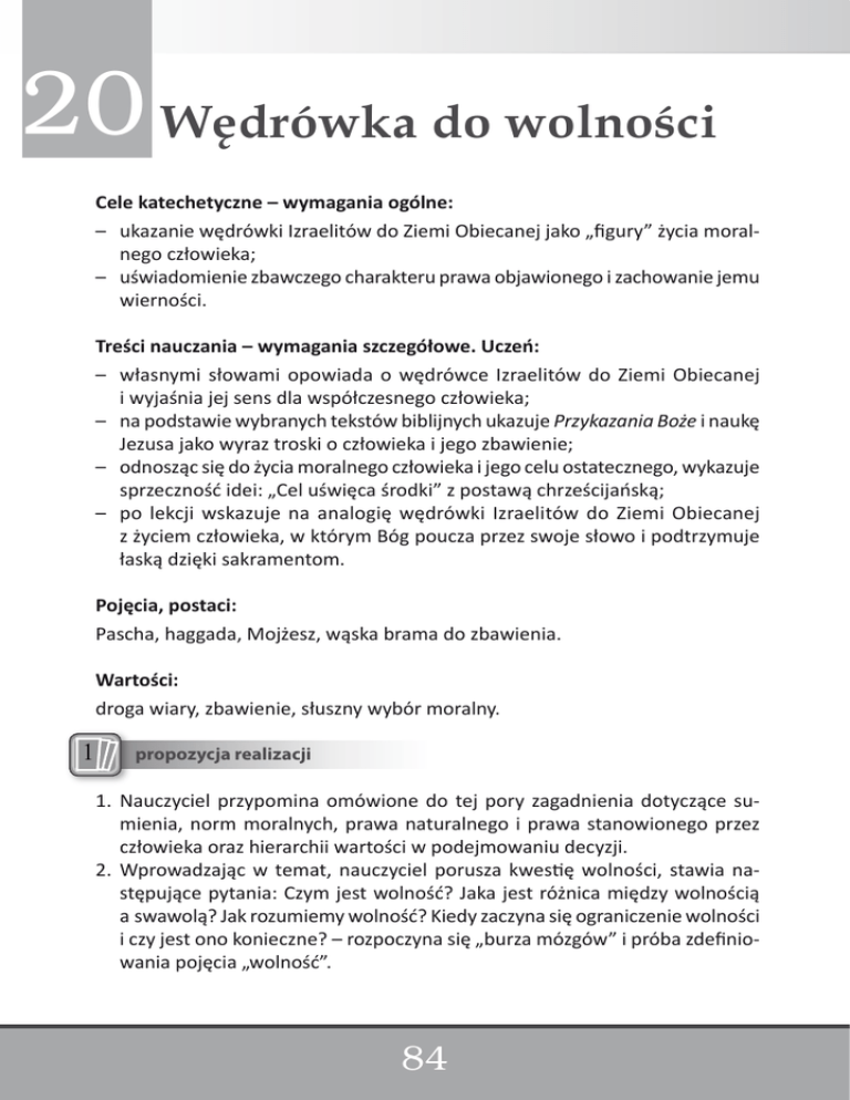 20 Wędrówka do wolności Cele katechetyczne – wymagania ogólne: – ukazanie wędrówki Izraelitów do Ziemi Obiecanej jako „figury” życia moralnego człowieka; – uświadomienie zbawczego charakteru prawa objawionego i zachowanie jemu wierności. Treści nauczania – wymagania szczegółowe. Uczeń: – własnymi słowami opowiada o wędrówce Izraelitów do Ziemi Obiecanej i wyjaśnia jej sens dla współczesnego człowieka; – na podstawie wybranych tekstów biblijnych ukazuje Przykazania Boże i naukę Jezusa jako wyraz troski o człowieka i jego zbawienie; – odnosząc się do życia moralnego człowieka i jego celu ostatecznego, wykazuje sprzeczność idei: „Cel uświęca środki” z postawą chrześcijańską; – po lekcji wskazuje na analogię wędrówki Izraelitów do Ziemi Obiecanej z życiem człowieka, w którym Bóg poucza przez swoje słowo i podtrzymuje łaską dzięki sakramentom. Pojęcia, postaci: Pascha, haggada, Mojżesz, wąska brama do zbawienia. Wartości: droga wiary, zbawienie, słuszny wybór moralny. propozycja realizacji 1 Propozycja realizacji: 1. Nauczyciel przypomina omówione do tej pory zagadnienia dotyczące sumienia, norm moralnych, prawa naturalnego i prawa stanowionego przez człowieka oraz hierarchii wartości w podejmowaniu decyzji. 2. Wprowadzając w temat, nauczyciel porusza kwestię wolności, stawia następujące pytania: Czym jest wolność? Jaka jest różnica między wolnością a swawolą? Jak rozumiemy wolność? Kiedy zaczyna się ograniczenie wolności i czy jest ono konieczne? – rozpoczyna się „burza mózgów” i próba zdefiniowania pojęcia „wolność”. 84 Na zakończenie dyskusji nauczyciel zadaje pytanie: Dlaczego mamy obowiązek przestrzegania zasad ruchu drogowego? Dlaczego w górach chodzimy po szlakach? Czy to nie jest ograniczanie naszej wolności? 3. Uczniowie czytają z podręcznika teksty z ramki Opinie i ze s. 116. Nauczyciel nawiązuje do tego, że życie ludzkie podobne jest do wędrówki w jakimś celu. Tym celem jest wieczne zbawienie. Na tej drodze towarzyszą nam inni ludzie, znaki, zasady i normy postępowania. Następnie nauczyciel zadaje uczniom pytania odnoszące się do porównania: życie – wędrówka: Dlaczego planujemy wycieczkę w góry po szlakach, a nie chodzimy dowolnymi ścieżkami? Czy nasze życie można porównać do wędrówki? Co jest mapą naszego życia? Co jest celem naszego życia? Podsumowując dyskusję, nauczyciel dyktuje notatkę do zeszytu: Droga, która prowadzi do wyznaczonego celu, jest obrazem życia człowieka. Ludzkie życie jest drogą do celu. Tym celem jest ostateczne spełnienie naszego losu, co dokona się po śmierci. Celem życia chrześcijańskiego jest zbawienie. 4. Nauczyciel dzieli uczniów na 4-osobowe zespoły, rozdaje im arkusze A3. Tematem pracy w grupach jest przedstawienie wędrówki Izraela (w odniesieniu do wędrówki każdego z nas). Uczniowie w 4-osobowych grupach szukają podobieństw między wędrówką Izraela opisaną w podręczniku na s. 95–96 a życiem każdego człowieka. Przygotowują odpowiedzi albo w formie plakatu z ilustracjami, albo w formie tabelki. Na zakończenie uczniowie, wraz z nauczycielem, podsumowują prezentowane przez siebie prace, a nauczyciel dyktuje notatkę do zeszytu: Drogę życia chrześcijańskiego można porównać z drogą synów Izraela. Wyszli oni z niewoli egipskiej i chcieli osiągnąć wolność w Ziemi Obiecanej. Na początku tej drogi Bóg zbawił Hebrajczyków, wyrwał ich z rąk prześladowców i wyzwolił z niewoli. Potem, na pustyni, dał im „Przykazania”, zawarł z nimi Przymierze, żywił ich pokarmem z nieba. Bóg dał nam początek zbawienia w sakramencie chrztu, gdy wyrwał nas z mocy szatana. We wspólnocie Kościoła poucza nas swoim Słowem, podtrzymuje nasze życie mocą sakramentów, a w szczególności karmi nas swoim Ciałem i Krwią w Eucharystii. Jest zawsze z nami i przygotował nam mieszkanie w niebie. propozycja pracypracy na lekcji propozycja na lekcji 3 inna 12Inna Przypomnienie wiadomości z klasy I na temat wędrówki Izraelitów przez pustynię oraz ukazanie doniosłości tego wydarzenia, np. w formie gry planszowej, w której uczestniczą niewielkie 5–6-osobowe grupy. Do styropianu przypina się materiał z namalowanym rejonem Egiptu, półwyspu Synaj i Kanaanu wraz 85 z oznaczoną trasą wędrówki Hebrajczyków. Nauczyciel przygotowuje zestawy pytań (ok. 40), na które uczniowie odpowiadają. Jest to warunkiem posuwania się naprzód (lub cofania się). Inna metoda polega na wspólnym uzupełnianiu (w grupach lub na tablicy) następującej tabeli: Wydarzenia z wędrówki Hebrajczyków Moja podobna sytuacja Co jest przedmiotem wyboru? Jakie będą konsekwencje mojego wyboru? Warto zaznaczyć, że metoda ta wymaga od nauczyciela dość dobrego przygotowania pytań, które naprowadzą uczniów na właściwy tor. Skutkiem zastosowania tej metody będzie ukazanie uczniom prawdy, że Biblia mówi o ich życiu i ich problemach oraz że każdy wybór pociąga za sobą jakieś konsekwencje13. Można również rekonstrukcję pielgrzymki do Ziemi Obiecanej przeprowadzić z wykorzystaniem obrazów (fotogramy, taśma, wideo), które uczniom kojarzą się z konkretnymi osobami i wydarzeniami. Uczniowie (w ramach grupy lub klasy) wypełniają następującą tabelę: Wydarzenie (nazwane zgodnie z obrazem) Osoby występujące w tym wydarzeniu Co to dla nas oznacza? W podręczniku jednostkę rozpoczyna list opowiadający o doświadczeniu wycieczek górskich, które uczą, że do wyznaczonego celu prowadzi droga nie zawsze najprostsza. W ten sposób zostaje zawiązana sytuacja egzystencjalna, która ułatwia zrozumienie, na czym polega „pielgrzymka wiary”. Następnie wspomina się, czym dla Hebrajczyków była Pascha oraz ukazuje się działanie Boga, 13 Inne propozycje, związane z osobą Mojżesza, zawarte są w: J. Kurzelewska, Mojżesz – doświadczenie wiary, w: Metod