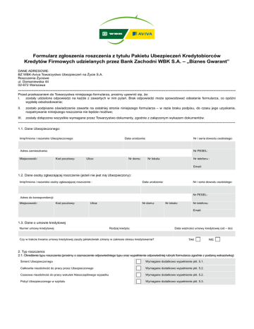 Formularz zgłoszenia roszczenia z tytułu Pakietu Ubezpieczeń Kredytobiorców Kredytów Firmowych udzielanych przez Bank Zachodni WBK S.A. – „Biznes Gwarant” DANE ADRESOWE: BZ WBK-Aviva Towarzystwo Ubezpieczeń na Życie S.A. Roszczenia Życiowe ul. Domaniewska 44 02-672 Warszawa ------------------------------------------------------------------------------------------------------------------------------Przed przekazaniem do Towarzystwa niniejszego formularza, prosimy upewnić się, że: I. zostały udzielone odpowiedzi na każde z zawartych w nim pytań. Brak odpowiedzi może spowodować odesłanie formularza, co opóźni wypłatę odszkodowania; II. zostało podpisane oświadczenie zawarte na ostatniej stronie niniejszego formularza – w razie braku podpisu, do czasu jego uzyskania, rozpatrywanie niniejszego roszczenia nie będzie możliwe; III. zostały dołączone wszystkie wymagane przez Towarzystwo dokumenty, zgodnie z załączonym wykazem dokumentów. --------------------------------------------------------------------------------------------------------------------------------------------------------1.1. Dane Ubezpieczonego: Imię/Imiona i nazwisko Ubezpieczonego: Data urodzenia: Nr i seria dowodu osobistego: Adres zamieszkania: Miejscowość: Nr PESEL: Kod pocztowy: Ulica: Nr domu: Nr lokalu: Nr telefonu : Email: 1.2. Dane osoby zgłaszającej roszczenie (jeżeli nie jest nią Ubezpieczony): Imię/Imiona i nazwisko osoby zgłaszającej roszczenie : Data urodzenia: Nr i seria dowodu osobistego: Nr PESEL: Adres do korespondencji: Miejscowość: Kod pocztowy: Ulica: Nr domu: Nr lokalu: Nr telefonu: Email: 1.3. Dane o umowie kredytowej Numer umowy kredytowej Rodzaj kredytu: Data ważności umowy kredytowej (od – do): Czy w trakcie trwania umowy kredytowej zaszły jakiekolwiek zmiany w zakresie okresu kredytowania? TAK NIE 2. Typ roszczenia: 2.1. Określenie typu roszczenia (prosimy o zaznaczenie odpowiedniego typu oraz wypełnienie odpowiedniej rubryki formularza zgodnie z podaną wskazówką): Śmierć Ubezpieczonego Wymagane dodatkowo wypełnienie pkt. 5.1. Całkowita niezdolność do pracy przez Ubezpieczonego Wymagane dodatkowo wypełnienie pkt. 5.2. Czasowa niezdolność do pracy wskutek Nieszczęśliwego wypadku Wymagane dodatkowo wypełnienie pkt. 5.2. Pobyt Ubezpieczonego w szpitalu Wymagane dodatkowo wypełnienie pkt. 5.3. 3. Dane o dotychczasowym leczeniu – dla każdego ryzyka (rodzaj placówki, adres, imię, nazwisko oraz specjalizacja lekarza prowadzącego leczenie, powód leczenia): 4. Dane o zdarzeniu – dla każdego ryzyka: Data zdarzenia: Miejsce zdarzenia: Opis okoliczności i przebieg zdarzenia: Przyczyna zdarzenia: Data przyczyny zdarzenia: Okoliczności przyczyny zdarzenia: Wypadek komunikacyjny Nieszczęśliwy wypadek Wypadek przy pracy Inny rodzaj wypadku Inna przyczyna: Nazwa choroby: 5. Informacje uzupełniające – ze względu na ryzyko: 5.1. Z tytułu śmierci Ubezpieczonego: 1. Czy w związku z wystąpieniem zdarzenia prowadzone jest/było postępowanie przez prokuraturę lub policję? TAK NIE TAK NIE Jeśli tak, proszę podać adres policji/prokuratury prowadzącej postępowanie: 2. Czy w związku z wystąpieniem zdarzenia sporządzony został protokół BHP? 5.2. Z tytułu Całkowitej niezdolności do pracy Ubezpieczonego oraz Czasowej niezdolności do pracy wskutek Nieszczęśliwego wypadku: 1. Kiedy została stwierdzona Całkowita niezdolność do pracy / Czasowa niezdolność do pracy wskutek Nieszczęśliwego wypadku? 2. Do kiedy została stwierdzona Całkowita niezdolność do pracy / Czasowa niezdolność do pracy wskutek Nieszczęśliwego wypadku? 3. Jakimi dokumentami potwierdzona jest Całkowita niezdolność do pracy / Czasowa niezdolność do pracy wskutek Nieszczęśliwego wypadku? 5.3. Z tytułu Pobytu w szpitalu: 1. Kiedy Ubezpieczony został przyjęty do Szpitala? 2. Do kiedy Ubezpieczony przebywał w Szpitalu (data wypisu ze Szpitala)? 3. Dokumenty potwierdzające Pobyt w szpitalu: 6. Dane do wypłaty świadczenia: Nr rachunku bankowego, na który należy wpłacić kwotę świadczenia: Imię i nazwisko posiadacza rachunku bankowego: 7. Oświadczenie Ubezpieczonego 7.1. Oświadczam, że informacje podane przeze mnie w niniejszym formularzu zgłoszenia roszczenia są kompletne i prawdziwe. 7.2. Upoważniam BZ WBK–Aviva Towarzystwo Ubezpieczeń na Życie S.A. w Poznaniu oraz Aviva Polska Sp. z o.o. z siedzibą w Warszawie do zasięganiaw zakładach opieki zdrowotnej oraz u lekarzy, z których usług korzystam lub korzystałem, informacji dotyczących mojego stanu zdrowia oraz w innych instytucjach celem weryfikacji podanych przeze mnie danych oraz o innych okolicznościach związanych z ustaleniem prawa do świadczeń z tytułu Pakietu Ubezpieczeń Kredytobiorców Kredytów Firmowych udzielanych przez Bank Zachodni WBK S.A. – „Biznes Gwarant” i wysokości tych świadczeń. Niniejsze upoważnienie jest nieodwołalne i nie wygasa w chwili mojej śmierci. 7.3. Oświadczam, że nie jestem/jestem* osobą zajmującą eksponowane stanowisko polityczne mające miejsce zamieszkania poza terytorium Rzeczpospolitej Polskiej. 8. Oświadczenie Uposażonego 8.1. Oświadczam, że informacje podane przeze mnie w niniejszym formularzu zgłoszenia roszczenia są kompletne i prawdziwe. 8.2. Wyrażam zgodę, aby BZ WBK-Aviva Towarzystwo Ubezpieczeń na Życie S.A. z siedzibą w Poznaniu przetwarzało moje dane osobowe zawarte w niniejszym formularzu w celu przeprowadzenia procesu roszczeniowego. 8.3. Oświadczam, że zostałem poinformowany, że administratorem danych, w rozumieniu ustawy z dnia 29 sierpnia 1997 r. o ochronie danych osobowych (tekst jednolity: Dz.U. z 2002 r. Nr 101, poz. 926, z późn. zm.) jest BZ WBK-Aviva Towarzystwo Ubezpieczeń na Życie S.A., adres: Plac Andersa 5, 61-845 Poznań. Zostałem również poinformowany o prawie wglądu do moich danych i ich poprawiania oraz o tym, że złożenie niniejszej deklaracji je