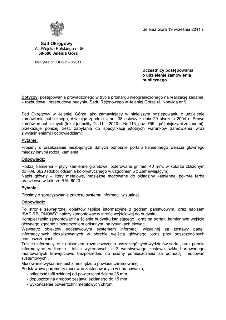 Jelenia Góra 19 września 2011 r. Sąd Okręgowy Al. Wojska Polskiego nr 56 58-500 Jelenia Góra Identyfikator: OG/ZP – 3/2011 Uczestnicy postępowania o udzielenie zamówienia publicznego Dotyczy: postępowania prowadzonego w trybie przetargu nieograniczonego na realizację zadania – rozbudowa i przebudowa budynku Sądu Rejonowego w Jeleniej Górze ul. Norwida nr 9. Sąd Okręgowy w Jeleniej Górze jako zamawiający w niniejszym postępowaniu o udzielenie zamówienia publicznego, działając zgodnie z art. 38 ustawy z dnia 29 stycznia 2004 r. Prawo zamówień publicznych (tekst jednolity Dz. U. z 2010 r. Nr 113, poz. 759 z późniejszymi zmianami), przekazuje poniżej treść zapytania do specyfikacji istotnych warunków zamówienia wraz z wyjaśnieniami i odpowiedziami: Pytanie: Prosimy o przekazanie niezbędnych danych odnośnie portalu kamiennego wejścia głównego między innymi rodzaj kamienia. Odpowiedź: Rodzaj kamienia – płyty kamienne granitowe, polerowane gr min. 40 mm. w kolorze zbliżonym do RAL 6020 (dobór odcienia kolorystycznego w uzgodnieniu z Zamawiającym). Napis główny – litery metalowe, mosiężne mocowane do okładziny kamiennej pokryte farbą proszkową w kolorze RAL 6020. Pytanie: Prosimy o sprecyzowanie zakresu systemu informacji wizualnej. Odpowiedź: Po stronie zewnętrznej obiektów tablice informacyjne z godłem państwowym, oraz napisem “SĄD REJONOWY” należy zamontować w strefie wejściowej do budynku. Komplet tablic zamontować na ścianie budynku istniejącego , oraz na portalu kamiennym wejścia głównego zgodnie z oznaczeniem opisanym na rysunkach elewacji. Wewnątrz obiektów podstawowym systemem informacji wizualnej są zestawy paneli informacyjnych zlokalizowanych w obrębie wejścia głównego, oraz przy poszczególnych pomieszczeniach. Tablice informacyjne z opisaniem rozmieszczenia poszczególnych wydziałów sądu , oraz panele informacyjne w formie tablic wykonanych z 2 warstwowego zestawu szkła hartowanego montowanych krawędziowo bezpośrednio do ściany pomieszczenia za pomocą mocowań systemowych . Mocowanie wykonane jest z mosiądzu o powłoce chromowanej . Podstawowe parametry mocowań zastosowanych w opracowaniu; - odległość tafli szklanej od powierzchni ściany 25 mm. - dopuszczalna grubość zestawu szklanego do 15 mm - wykończenie powierzchni metalowych chrom. - napisy informacyjne drukowane na folii samoprzylepnej montowanej po stronie wewnętrznej tafli szklanych. - ostateczną treść napisów informacyjnych Zamawiający określi w końcowym etapie realizacji inwestycji. Dodatkowymi elementami informacji wizualnej są elektroniczne panele informacyjne zlokalizowane w rejonie sal rozpraw , oraz wizualny system informacji o kierunkach ewakuacji. Pytanie: Proszę o potwierdzenie, że przedmiotem postępowania nie są objęte elementy wyposażenia budynku takie jak żaluzje pionowe wewnętrzne. Odpowiedź: Zamawiający potwierdza, że elementy wyposażenia budynku takie jak żaluzje pionowe wewnętrzne nie są objęte obecnym postępowaniem przetargowym. Pytanie: Proszę o podanie opisu, oraz istotnych parametrów dla wycieraczek zewnętrznych. Odpowiedź: Dla strefy wejściowej /zewnętrzna strona strefy wejściowej do budynku/. Konstrukcja wycieraczek gumowo-aluminiowa w obramowaniu ukrytym w grubości warstw nawierzchniowych podłoża. Dla strefy wejściowej / wewnętrzna strona strefy wejściowej- wiatrołapy / Konstrukcja wycieraczek ; ząbkowana guma z aluminiowymi profilami grzebieniowymi w obramowaniu ukrytym w grubości warstw nawierzchniowych posadzki pomieszczenia. Pytanie: Prosimy o przekazanie niezbędnych danych, parametrów technicznych odnośnie; - wykładziny syntetycznej pcv - wykładziny dywanowej igłowanej - paneli podłogowych syntetycznych pcv Odpowiedź: Podstawowe parametry techniczne dla przyjętych w opracowaniu projektowym materiałów podłogowych: 1. Wykładziny - panele syntetyczne pcv; Wykładzina /panele bezspoinowa/-e przeciwpoślizgowa/-e Ochrona przeciwpożarowa klasy R10 Odporność na ścieranie klasy T Klasyfikacja użytkowa 43 Zabezpieczenie powierzchni Pur Protect Widoczna faktura drewna w warstwie użytkowej Wymagane atesty i certyfikaty CE z zakresie trudnopalności i możliwości zastosowania w obiektach użyteczności publicznej. Wymagane parametry kolorystyczne w zakresie określonym w dokumentacji 2. Wykładziny dywanowe; Wykładzina bezspoinowa igłowana poliamidowa Ochrona przeciwpożarowa klasy R10 Klasyfikacja użytkowa 42 Wymagane atesty i certyfikaty CE z zakresie trudnopalności i możliwości zastosowania w obiektach użyteczności publicznej. Wymagane parametry kolorystyczne w zakresie określonym w dokumentacji Pytanie: W odpowiedzi na pytania z dnia 31.08.2011 r. dotyczącej wiedzy i doświadczenia wymienione jest wykonanie budynków kultury fizycznej nie jest jednak podana klasa to znaczy nie wymieniono PKOIB 1265 obejmującej budynki kultury fizycznej. Wnosimy o uzupełnienie zapisu SIWZ o numer klasy budynku kultury fizycznej tj. PKOIB 1265. Odpowiedź: Zamawiający nie wyraża zgody na wprowadzenie powyższego zapisu. Zamawiający stawiając warunek dotyczący posiadanej przez wykonawców wiedzy i doświadczenia określił rodzaj obiektów odpowiadających swoim rodzajem przedmiotowi zamówienia. W zakresie ogólnodostępnych obiektów kulturalnych, budynków o charakterze edukacyjnym, budynków szpitali i zakładów opieki medycznej oraz budynków kultury fizycznej mieszczą się klasy 1261,1262,1263,1264,1265. Zamawiający uznał za roboty odpowiadające swoim rodzajem przedmiotowi zamówienia w powyższym zakresie, te roboty budowlane, które zostały wykonane przez wykonawcę w klasach 1262, 1263, 1264. Pytanie: Czy Zamawiający dopuszcza możliwość zamiany wymogu ubezpieczenia do wartości kontraktu ryzyka „od skutków nieszczęśliwych wypadków robotników i innych osób zatrudnionych przez Wykonawcę do realizacji zobowiązań wynikając