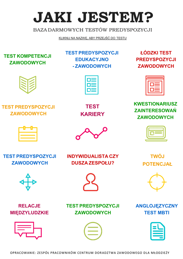 JAKI JESTEM? BAZA DARMOWYCH TESTÓW PREDYSPOZYCJI KLIKNIJ NA NAZWĘ, ABY PRZEJŚĆ DO TESTU TEST KOMPETENCJI ZAWODOWYCH TEST PREDYSPOZYCJI EDUKACYJNO - ZAWODOWYCH ŁÓDZKI TEST PREDYSPOZYCJI ZAWODOWYCH TEST PREDYSPOZYCJI ZAWODOWYCH TEST KARIERY KWESTIONARIUSZ ZAINTERESOWAŃ ZAWODOWYCH TEST PREDYSPOZYCJI ZAWODOWYCH INDYWIDUALISTA CZY DUSZA ZESPOŁU? POTENCJAŁ RELACJE MIĘDZYLUDZKIE TEST PREDYSPOZYCJI ZAWODOWYCH ANGLOJĘZYCZNY TEST MBTI TWÓJ OPRACOWANIE: ZESPÓŁ PRACOWNIKÓW CENTRUM DOR ADZTWA ZAWODOWEGO DLA MŁODZIEŻY KWESTIONARIUSZ POSTAW TWÓRCZYCH vs ODTWÓRCZYCH TEST PREDYSPOZYCJI ZAWODOWYCH ZWIĄZANYCH ZE ŚRODOWISKIEM PRACY QUO-VADIS - TEST ZAINTERESOWAŃ, KOMPETENCJI I UZDOLNIEŃ PRZEDSIĘBIORCZYCH KWESTIONARIUSZ NASTAWIEŃ INTRAI INTERPERSONALNYCH ORAZ NASTAWIEŃ WOBEC ŚWIATA NARZĘDZIA DIAGNOSTYCZNE DLA UCZNIÓW KL. I - III GIMNAZJUM ZAMEK – TEST PREDYSPOZYCJI ZAWODOWYCH OPRACOWANIE: ZESPÓŁ PRACOWNIKÓW CENTRUM DOR ADZTWA ZAWODOWEGO DLA MŁODZIEŻY