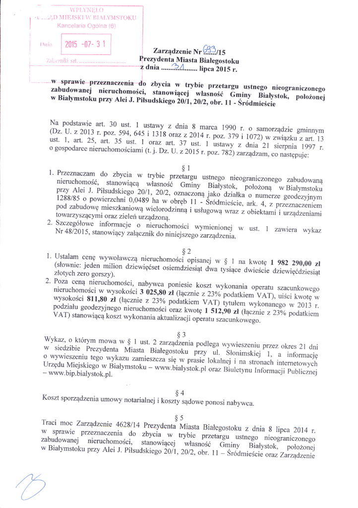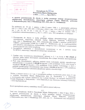 I Zarz4dzenieN"fi?lrs Prerydenta-Miasta Bialegostoku 'z itnia .....124....... tipcal0l5 r. w sprawie przeznrezenia,* w trybie prz€targu ustnego nieograniczonego -fr"rv'..,.o-u", zabudowanej nieruchom-o.ci, *t:rl stanowi.cej wrasnosd c,oi"v w Biagmsroku prry Arei J. pitsudskiego iilozon"; . _ i0 |t,ziltl'ol".ll sr6dmie6cie Na podstawie art. 30 ust. I ustawy z dnia g marca 1990 r. o samorzqdzie gmimym (Dz.u.z20t3r.poz.ss4,64sirtisor;riol;';.-;"..,sir0?'i'#iarku"r,*.,, ust' l' art' 25' ari' 35 ust. I oraz art. :z usi. i'Iro*y z dnia 2r sierpnia 1997 r. o gospodarce nieruchomoSciam i (t. j. Dz. u. , zoli r.'piz. lsil ^riiu;;,##;il., L Przeznaczam do zbycia^w ustnego nieograniczonego zabudowan4 :ylt. .lrr"iJqu nieruchomodi, stanowi4cq wiasnoSi Criny Aiufyrtot, polo2on4 w Bialymstoku przy Alei J. pilsudskieqo 20/1, 20/2, ornui)Jnu iJ" arr"it"""'""#-.'r;#:;rr"r. 1288/85 o powierzchni-0.0489 ark. 4. . prrr.nuc.rn r pod zabudowg mieszkaniow4 wietorodzinn4 i ,rr"g"*e wraz z obiektami i urz*dzeniami towarzysz4cymi ;; ;;il'ii'-'3ila.i.s.ie. oraz zieleh wzqdzon4. ^ Szczeg6lowe informacie o 2' ni.,u"hon.odci wymienionej w ust. . Nr 48/20 I 5, stanowi4cy zatq.r"ik ao ;;;i;j.* si'.'.;;d."niu. I' Ustalam cens wywolawczl..liT:*:i"*lir:-r, w g r 9l:ffiLl:i1,]jlion a'i'*iuiset l na kwots osiemdziesi4t d"wa tvsi4ce a*i"scie zawiera wykaz I eB2 2e0,00 zl a'ie*iieiii"riqt 2' Poza cen4 nieruchomosci, n-abywca poniesie koszt wykonania operatu szacunkowego . nieruchomo.ci w wvsokoici.3 ozlt9o ,t <iii"ii-.'ilNpodarkiem VAT), uisci kwotg w wysokosci 81r,80 zr (r4cznie.z z3olo poiatkiim iyur", *yr"""""g" *^zb,: ,. podzialu geodezvjnego nieruchomosci;;k;;r* iir,so zr z23vo llqcznie podatkiem VAT) stanowi?cq koszt wykonania uktudir;;ji ;;:rltJ rru"unro*"no. vai; i wvkS: * kt6rym mowa g,^,^:*..] .uouiirrupodlega 9. siedzibie prezvdenra Miasta Biaregos*" -J., -"r,wywies zeniu przezokes 2l dni itonimskiej',.o wywieszeniu tego wykazu z.amieszcza" siq w p.i'ri-J roiurn"j i na stronach intemetowych ""'i",i-*ie iulr"''toru - ***iiurylJf r o.u. niur"tyn, r"i".,n*] ii;,ur w yffi i.'*i #Ji',ffi:flof Koszt sporzqdzenia umowy nota.iutn"i i t orr$t4dowe ponosi nabywca. Traci moc Zarz4dzenie 462g/14 r..rya*,u$itiurta Bialegostoku z dnia g ripca 2014 r. sprawie przeznaczenia ,.!11". w. trybje g" ustnego nieograniczonego zabudowanej nieruchomoSci. stanowiqcej wlasno5i GTilV. w Bialvmstoku przv Alei J' Pilsudskiego .Biatystok. polo2onej ioh, zoii,'rai. I .I sr6dmiesci w ;;*!r. - e oraz zarzadzenie 4855/14 Prezydenta Miasta Bialegostoku z dnia 18 wrzesnia 2014 4628/14 Prezydenta Miasta Bialegostoku z dnia 8 lipca 2014 r. $6 Zatz4dzenie wchodzi w Lrycie z dniem podpisania. r. zmieniaj4ce zarzqdzenie WYKAZ Nr 48/2015 2l sierpnia 1997 nieruchomo6ci przeznaczonej do zbycia w trybie ustawy z dnia r. o gospodarce nieruchomoSciami (Dz. U. 22015 r. poz.782) L Omaczenie Opis p nieruchomoici nieruchomoSci I 2 3 I KW. Nr Br r B/00003697/l dz. nr geod.: 12E8/t5, pow. 0,0489 ha, obrQb I l. ark. 4 polozona przy Al. Pilsudskiego 20l1, 20/2 Pfzemaczenre Cena wywolawcza nieruchomo3ci Oplaty jednorazowe 5 6 4 - nicruchomosc Sruntowa zabudowanadwoma budynkarni o numeracji porzqdkowej: 20/l - porv. uzltkoua 263,0 m'? i 2012- pow. uz,lkowa 340 m', o ftnkcji rnieszkalnej. w zabudowae grupowc.j (styczne jedn4 Scian4), murowane, Na elewacja budynku nr 20/l umieszczone tJchwala Nr XXXVII/454/12 Rady Miasta Bialystok z dnia I7 grudnia 2012 r.: 982 290,n0 zr m'powi€rzchni uz),tkowej budynk6w 3 2E7,38 zl) Ll.MW,U. zabudowa wielorodzinna i uslugowa waz obieKami i urz4dzeniami towarz ysz4cymi oraz zieleni4 utzqdzonq, teren wymaczony lini4 jest wielkoformalowc | (l wydzielenia wewnQtrznego Zwolnienie z podatku vAT $ oparciu 43 ust.I pLl l0 w zw. z art, 29 a ust. 8 ustawy z dnia 1l marca 2004 r. o podatku od towar6w i uslug ( Dz. U. z 201| r. Nr 177, poz. 1054 ) 3025$0 7 (l4cz,]te 223Y. podatkiem VAT) - koszt sporzqdz€nia operatu -nicruchomo(C polozona jest granicach strcfy ochrony konser 'atorskiej. zgodnie z decyA4 Wojew6dzkieBo Konser$ atora Zab]'tkow \a' w Bialymstoku Nr K.L. wKz5340D2/7'l z 0l.09.197 7 t. - Budynki przy Al. Pilsudskiego 20/l i 20,2 s4 wpisany do gminncj i wojcw6dzkiej ewidencji zabylk6w. Zbycie w trybie pfzetargu usmego nreogfanrczonego 8 Tcmrin na zlo2enie wniosku poez osoby, kt6rym przysluguj€ pierwszenstwo w nabyciu przedmiotowej nieruchomosci na podstawie szacunkowego; o/o Ell,ao zl (l4cznie 223 podatkiemVAT)-kosd wykonanego w 2013 r. podzialu geodezyjnego nieruchomosci: malowidlo Scienne, wpisane do rcjestru zabltk6w ruchomych wojewddztwa podlaskiego Uwagi Informacja o przeznaczemt) do sprzedazy | 512,90 zl (t4cznie z 23'/. podatkiem VAT) - kosz wykonania aLtualizacj i operatu szacunkowego; art.34 ust. I pkt I i2ust4wyzdnia 2l sierpnia 1997 r. o gospodarce nieruchomosciami (Dz- [] z-2015 r. poz.582 z p62n. zm.) - wynosi 6 tygodni od dnia n1'wi€szenia *ykazu; warunki odplatnej stu2ebnosci przcjScia i przcjazdu na zasadach okreslonych w zarzqdzeniu Nr 4124l14 Prezydenta Miasta Bialegostoku z dnia 29 stycmt 2014 r. N sprawie uslanowienra sluzebnosci gruntowej przcj$cia i pzcjazdu przez nieruchomosci polozone w Bialymstoku prly Alei J6zeth Pilsudskiego. zmienionym z$aqd?Eniem Nr 4818/14 Prezyd€nta Miasta Bialegostoku z dnia 02 wrzesnia 2014 r.