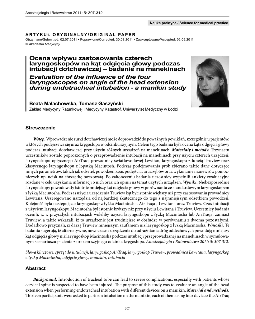 307 Anestezjologia i Ratownictwo 2011; 5: 307-312 Nauka praktyce / Science for medical practice A R T Y K U Ł O R Y G I N A L N Y / O R I G I N A L PA P E R Otrzymano/Submitted: 02.07.2011 • Poprawiono/Corrected: 30.08.2011 • Zaakceptowano/Accepted: 02.09.2011 © Akademia Medycyny Ocena wpływu zastosowania czterech laryngoskopów na kąt odgięcia głowy podczas intubacji dotchawiczej – badanie na manekinach Evaluation of the influence of the four laryngoscopes on angle of the head extension during endotracheal intubation - a manikin study Beata Małachowska, Tomasz Gaszyński Zakład Medycyny Ratunkowej i Medycyny Katastrof, Uniwersytet Medyczny w Łodzi Streszczenie Wstęp. Wprowadzenie rurki dotchawiczej może doprowadzić do poważnych powikłań, szczególnie u pacjentów, u których podejrzewa się uraz kręgosłupa w odcinku szyjnym. Celem tego badania była ocena kąta odgięcia głowy podczas intubacji dotchawiczej przy użyciu różnych urządzeń na manekinach. Materiały i metody. Trzynastu uczestników zostało poproszonych o przeprowadzenie intubacji na manekinach przy użyciu czterech urządzeń: laryngoskopu optycznego AirTraq, prowadnicy światłowodowej Lewitan, laryngoskopu z lunetą Truview oraz klasycznego laryngoskopu z łopatką Macintosh. Podczas podejmowania prób zbierano także dane dotyczące innych parametrów, takich jak odsetek powodzeń, czas podejścia, uraz zębów oraz wykonanie manewrów pomocniczych np. ucisk na chrząstkę tarczowatą. Po zakończeniu badania uczestnicy wypełnili ankiety ewaluacyjne rozdane w celu uzyskania informacji o nich oraz ich opinii na temat użytych urządzeń. Wyniki. Niebezpośrednie laryngoskopy powodowały istotnie mniejszy kąt odgięcia głowy w porównaniu ze standardowym laryngoskopem z łyżką Macintosha. Podczas użycia urządzenia Truview kąt był istotnie większy niż przy zastosowaniu prowadnicy Lewitana. Uszeregowano narzędzia od najbardziej skutecznego do tego z najmniejszym odsetkiem powodzeń. Kolejność była następująca: laryngoskop z łyżką Macintosha, AirTraqa , Lewitana oraz Truview. Czas intubacji z użyciem laryngoskopu Macintosha był istotnie krótszy niż przy użyciu Lewitana i Truview. Uczestnicy badania ocenili, iż w przyszłych intubacjach woleliby użyciu laryngoskopu z łyżką Macintosha lub AirTraqa, zamiast Truview, a także wskazali, iż to urządzenie jest trudniejsze w obsłudze w porównaniu z dwoma pozostałymi. Dodatkowo przyznali, iż darzą Truview mniejszym zaufaniem niż laryngoskop z łyżką Macintosha. Wnioski. Te badania sugerują, iż alternatywne, nowoczesne urządzenia do udrażniania dróg oddechowych powodują mniejszy kąt odgięcia głowy niż laryngoskop Macintosha podczas intubacji przeprowadzanej na manekinach w symulowanym scenariuszu pacjenta z urazem szyjnego odcinka kręgosłupa. Anestezjologia i Ratownictwo 2011; 5: 307-312. Słowa kluczowe: sprzęt do intubacji, laryngoskop AirTraq, laryngoskop Truview, prowadnica Lewitana, laryngoskop z łyżką Macintosha, odgięcie głowy, manekin, intubacja Abstract Background. Introduction of tracheal tube can lead to severe complications, especially with patients whose cervical spine is suspected to have been injured. The purpose of this study was to evaluate an angle of the head extension when performing endotracheal intubation with different devices on a manikin. Material and methods. Thirteen participants were asked to perform intubation on the manikin, each of them using four devices: the AirTraq 307 Anestezjologia i Ratownictwo 2011; 5: 307-312 Nauka praktyce / Science for medical practice optical laryngoscope, the Levitan fiberoptic stylet, laryngoscope with viewtube Truview and classic laryngoscope with Macintosh blade. Whilst the attempts were in progress, other measurements were also taken, such as success rate, time of each approach, dental compression and additional manoeuvres, for example pressure applied to the thyroid cartilage. Following this procedure, the participants completed the evaluation surveys carried out in order to obtain information concerning them and their opinion on the devices used. Results. The indirect laryngoscopes caused significantly smaller head extension angle in comparison with standard- laryngoscope with Macintosh blade. When the used device was Truview, angle was significantly bigger than during usage of the Levitan stylet. The tools were ranked from the most successful to those with the lowest success rate, the order was as follow: the Macintosh laryngoscope, AirTraq, Levitan and Truview. Intubation time for the Macintosh laryngoscope was significantly shorter than for Truview. The participants evaluated that in the future intubations they would prefer to use Macintosh laryngoscope or AirTraq rather than Truview. Moreover, they indicated that this device is more difficult in usage than the last two mentioned. Additionally, the participants admitted that they put less trust in Truview in comparison with the Macintosh laryngoscope. Conclusion. These findings suggest that the alternative, modern device for opening the airways caused smaller head extension angle than the Macintosh laryngoscope in the manikin model intubation in simulated cervical spine injury scenario. Anestezjologia i Ratownictwo 2011; 5: 307-312. Keywords: intubation equipment, AirTraq, Truview, Levitan stylet, laryngoscope with Macintosh blade, head extension, manikin, intubation Wstęp Materiał i metody Pacjenci z uszkodzonym kręgosłupem w odcinku szyjnym lub jedynie z podejrzeniem takiego urazu są pacjentami wyjątkowo trudnymi nawet dla doświadczonego anestezjologa. Podczas intubowania takiego chorego lekarz powinien dążyć do zminimalizowania wystąpienia ruchów w obrębie uszkodzonego odcinka kręgosłupa, gdyż nawet niewielkie pogłębienie istniejącego urazu może doprowadzić do poważnych komplikacji, a nawet śmierci pacjenta. W tym celu, oprócz zastosowania stabilizacji kr