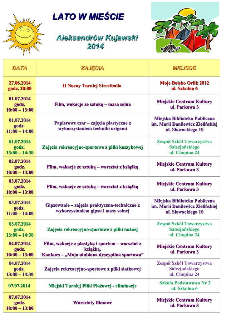LATO W MIEŚCIE Aleksandrów Kujawski 2014 DATA ZAJĘCIA MIEJSCE 27.06.2014 godz. 20:00 II Nocny Turniej Streetballa Moje Boisko Orlik 2012 ul. Szkolna 6 01.07.2014 godz. 10:00 – 13:00 Film, wakacje ze sztuką – masa solna Miejskie Centrum Kultury ul. Parkowa 3 Papierowe czar – zajęcia plastyczne z wykorzystaniem techniki origami Miejska Biblioteka Publiczna im. Marii Danilewicz Zielińskiej ul. Słowackiego 10 01.07.2014 godz. 13:00 – 14:30 Zajęcia rekreacyjno-sportowe z piłki koszykowej Zespół Szkół Towarzystwa Salezjańskiego ul. Chopina 24 02.07.2014 godz. 10:00 – 13:00 Film, wakacje ze sztuką – warsztat z książką Miejskie Centrum Kultury ul. Parkowa 3 03.07.2014 godz. 10:00 – 13:00 Film, wakacje ze sztuką – warsztat z książką Miejskie Centrum Kultury ul. Parkowa 3 Gipsowanie – zajęcia praktyczno-techniczne z wykorzystaniem gipsu i masy solnej Miejska Biblioteka Publiczna im. Marii Danilewicz Zielińskiej ul. Słowackiego 10 03.07.2014 godz. 13:00 – 14:30 Zajęcia rekreacyjno-sportowe z piłki nożnej Zespół Szkół Towarzystwa Salezjańskiego ul. Chopina 24 04.07.2014 godz. 10:00 – 13:00 Film, wakacje z plastyką i sportem – warsztat z książką. Konkurs – „Moja ulubiona dyscyplina sportowa” Miejskie Centrum Kultury ul. Parkowa 3 04.07.2014 godz. 13:00 – 14:30 Zajęcia rekreacyjno-sportowe z piłki siatkowej Zespół Szkół Towarzystwa Salezjańskiego ul. Chopina 24 07.07.2014 Miejski Turniej Piłki Plażowej - eliminacje Szkoła Podstawowa Nr 3 ul. Szkolna 6 07.07.2014 godz. 10:00 – 13:00 Warsztaty filmowe Miejskie Centrum Kultury ul. Parkowa 3 01.07.2014 godz. 11:00 – 14:00 03.07.2014 godz. 11:00 – 14:00 08.07.2014 Miejski Turniej Piłki Plażowej - finały Szkoła Podstawowa Nr 3 ul. Szkolna 6 08.07.2014 godz. 10:00 – 13:00 Film, wakacje ze sportem Miejskie Centrum Kultury ul. Parkowa 3 08.07.2014 godz. 11:00 – 14:00 Regionalia – zajęcia plastyczne, połączone z prezentacja multimedialną i stworzeniem postaci Kujawiaka i Kujawianki Miejska Biblioteka Publiczna im. Marii Danilewicz Zielińskiej ul. Słowackiego 10 08.07.2014 godz. 13:00 – 14:30 Zajęcia rekreacyjno-sportowe z piłki koszykowej Zespół Szkół Towarzystwa Salezjańskiego ul. Chopina 24 09.07.2014 godz. 10:00 – 13:00 Film. Wakacje z plastyką i turystyką „Skarby Aleksandrowa” Miejskie Centrum Kultury ul. Parkowa 3 10.07.2014 godz. 10:00 – 13:00 Film, wakacje ze sztuką – warsztat z książką Warsztaty filmowe Miejskie Centrum Kultury ul. Parkowa 3 Rolowanie – zajęcia praktyczne z wykorzystaniem rolek po papierze Miejska Biblioteka Publiczna im. Marii Danilewicz Zielińskiej ul. Słowackiego 10 10.07.2014 godz. 13:00 – 14:30 Zajęcia rekreacyjno-sportowe z piłki nożnej Zespół Szkół Towarzystwa Salezjańskiego ul. Chopina 24 11.07.2014 godz. 10:00 – 13:00 „Sieciaki na wakacjach”, piknik edukacyjny: film edukacyjny, plastyka, konkursy, rebusy krzyżówki Miejskie Centrum Kultury ul. Parkowa 3 14.07.2014 – 15.07.2014 godz. 10:00 – 13:00 Warsztaty filmowe Miejskie Centrum Kultury ul. Parkowa 3 10.07.2014 godz. 11:00 – 14:00 14.08.2014 – 18.08.2014 godz. 11:00 – 14:00 Artystyczne wariacje – zajęcia plastyczne 14.07.2014 godz. 09:30 – 14:00 Zajęcia integracyjne, spisanie regulaminu zajęć, wykonanie dekoracji, gry i zabawy ruchowe, spotkanie z policjantami z KPP w Aleksandrowie Kujawskim Oratorium św. Jana Bosko przy Parafii NMP Wspomożenia Wiernych ul. Szczygłowskiego 5 15.07.2014 godz. 09:30 – 14:00 „W grupie siła” – drużynowe rozgrywki sprawnościowe Oratorium św. Jana Bosko przy Parafii NMP Wspomożenia Wiernych ul. Szczygłowskiego 5 16.07.2014 godz. 09:30 – 14:00 Konkurs malowania kredą na asfalcie – zajęcia plastyczne o tematyce wakacyjnej Oratorium św. Jana Bosko przy Parafii NMP Wspomożenia Wiernych ul. Szczygłowskiego 5 Miejskie Centrum Kultury ul. Parkowa 3 (Stowarzyszenie na rzecz dzieci i osób niepełnosprawnych „Bądźmy Razem”) (Miejski Ośrodek Pomocy Społecznej ) (Miejski Ośrodek Pomocy Społecznej ) (Miejski Ośrodek Pomocy Społecznej ) 17.07.2014 – 18.07.2014 godz. 10:00 – 13:00 17.07.2014 godz. 09:30 – 14:00 Warsztaty filmowe Miejskie Centrum Kultury ul. Parkowa 3 Podchody – gra terenowa – część I Oratorium św. Jana Bosko przy Parafii NMP Wspomożenia Wiernych ul. Szczygłowskiego 5 (Miejski Ośrodek Pomocy Społecznej ) 18.07.2014 godz. 09:30 – 14:00 Zajęcia muzyczno-taneczne 21.07.2014 godz. 10:00 – 13:00 Warsztaty filmowe Oratorium św. Jana Bosko przy Parafii NMP Wspomożenia Wiernych ul. Szczygłowskiego 5 (Miejski Ośrodek Pomocy Społecznej ) Miejskie Centrum Kultury ul. Parkowa 3 21.08.2014 – 25.08.2014 godz. 11:00 – 14:00 Artystyczne wariacje – zajęcia plastyczne 21.07.2014 godz. 09:30 – 14:00 Zajęcia manualne – masa solna, malowanie twarzy „Sport to zdrowie” – piłka nożna, Sitkówka, gra w zbijaka Oratorium św. Jana Bosko przy Parafii NMP Wspomożenia Wiernych ul. Szczygłowskiego 5 „Lato w plenerze” – spacer do lasu, pikniki, zabawy Oratorium św. Jana Bosko przy Parafii NMP Wspomożenia Wiernych ul. Szczygłowskiego 5 22.07.2014 godz. 09:30 – 14:00 23.07.2014 godz. 09:30 – 14:00 Podchody – gra terenowa – część II (Miejski Ośrodek Pomocy Społecznej ) Oratorium św. Jana Bosko przy Parafii NMP Wspomożenia Wiernych ul. Szczygłowskiego 5 (Miejski Ośrodek Pomocy Społecznej ) Wycieczka do Mega Parku Kansas City w Rudniku 25.07.2014 godz. 09:30 – 14:00 „Mali artyści” – przegląd talentów Uroczyste zakończenie zajęć wakacyjnych Oratorium św. Jana Bosko przy Parafii NMP Wspomożenia Wiernych ul. Szczygłowskiego 5 (Miejski Ośrodek Pomocy Społecznej ) Turniej Piłki Nożnej im. Z. Kokowicza w kategorii wiekowej Żacy 15.08.2013 godz. 10:00 – 15:00 Ogólnopolski Turniej Piłki Nożnej „Summer Cup 2014” w kategorii wiekowej Orlicy 18.08.2014 – 29.08.2014 Zajęcia sportowo-r