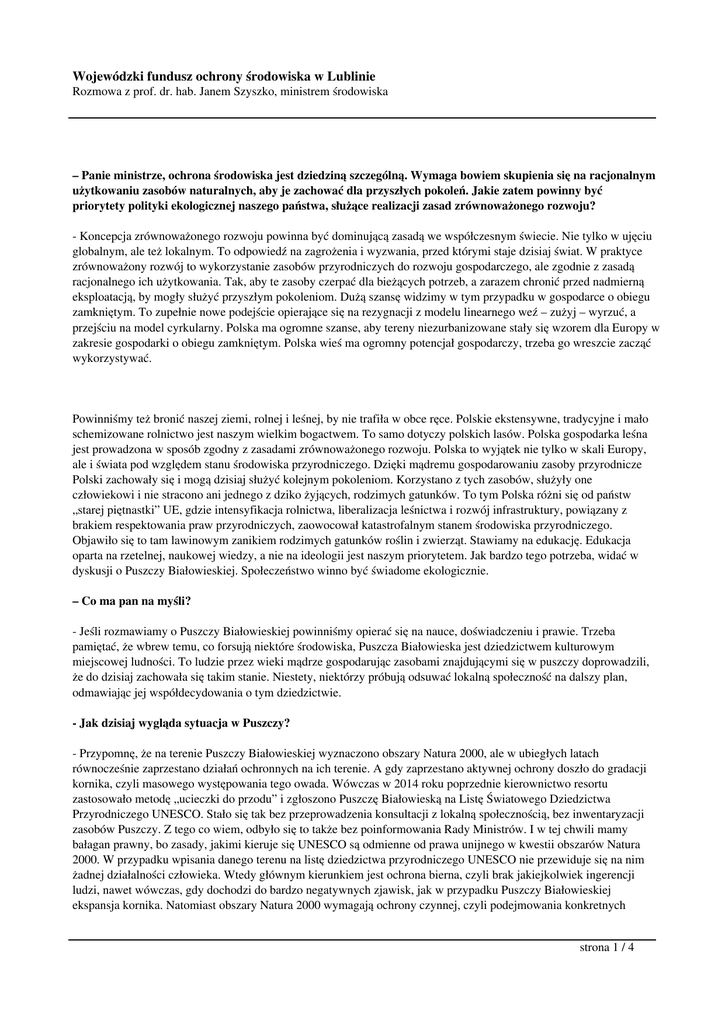 Wojewódzki fundusz ochrony środowiska w Lublinie Rozmowa z prof. dr. hab. Janem Szyszko, ministrem środowiska – Panie ministrze, ochrona środowiska jest dziedziną szczególną. Wymaga bowiem skupienia się na racjonalnym użytkowaniu zasobów naturalnych, aby je zachować dla przyszłych pokoleń. Jakie zatem powinny być priorytety polityki ekologicznej naszego państwa, służące realizacji zasad zrównoważonego rozwoju? - Koncepcja zrównoważonego rozwoju powinna być dominującą zasadą we współczesnym świecie. Nie tylko w ujęciu globalnym, ale też lokalnym. To odpowiedź na zagrożenia i wyzwania, przed którymi staje dzisiaj świat. W praktyce zrównoważony rozwój to wykorzystanie zasobów przyrodniczych do rozwoju gospodarczego, ale zgodnie z zasadą racjonalnego ich użytkowania. Tak, aby te zasoby czerpać dla bieżących potrzeb, a zarazem chronić przed nadmierną eksploatacją, by mogły służyć przyszłym pokoleniom. Dużą szansę widzimy w tym przypadku w gospodarce o obiegu zamkniętym. To zupełnie nowe podejście opierające się na rezygnacji z modelu linearnego weź – zużyj – wyrzuć, a przejściu na model cyrkularny. Polska ma ogromne szanse, aby tereny niezurbanizowane stały się wzorem dla Europy w zakresie gospodarki o obiegu zamkniętym. Polska wieś ma ogromny potencjał gospodarczy, trzeba go wreszcie zacząć wykorzystywać. Powinniśmy też bronić naszej ziemi, rolnej i leśnej, by nie trafiła w obce ręce. Polskie ekstensywne, tradycyjne i mało schemizowane rolnictwo jest naszym wielkim bogactwem. To samo dotyczy polskich lasów. Polska gospodarka leśna jest prowadzona w sposób zgodny z zasadami zrównoważonego rozwoju. Polska to wyjątek nie tylko w skali Europy, ale i świata pod względem stanu środowiska przyrodniczego. Dzięki mądremu gospodarowaniu zasoby przyrodnicze Polski zachowały się i mogą dzisiaj służyć kolejnym pokoleniom. Korzystano z tych zasobów, służyły one człowiekowi i nie stracono ani jednego z dziko żyjących, rodzimych gatunków. To tym Polska różni się od państw „starej piętnastki” UE, gdzie intensyfikacja rolnictwa, liberalizacja leśnictwa i rozwój infrastruktury, powiązany z brakiem respektowania praw przyrodniczych, zaowocował katastrofalnym stanem środowiska przyrodniczego. Objawiło się to tam lawinowym zanikiem rodzimych gatunków roślin i zwierząt. Stawiamy na edukację. Edukacja oparta na rzetelnej, naukowej wiedzy, a nie na ideologii jest naszym priorytetem. Jak bardzo tego potrzeba, widać w dyskusji o Puszczy Białowieskiej. Społeczeństwo winno być świadome ekologicznie. – Co ma pan na myśli? - Jeśli rozmawiamy o Puszczy Białowieskiej powinniśmy opierać się na nauce, doświadczeniu i prawie. Trzeba pamiętać, że wbrew temu, co forsują niektóre środowiska, Puszcza Białowieska jest dziedzictwem kulturowym miejscowej ludności. To ludzie przez wieki mądrze gospodarując zasobami znajdującymi się w puszczy doprowadzili, że do dzisiaj zachowała się takim stanie. Niestety, niektórzy próbują odsuwać lokalną społeczność na dalszy plan, odmawiając jej współdecydowania o tym dziedzictwie. - Jak dzisiaj wygląda sytuacja w Puszczy? - Przypomnę, że na terenie Puszczy Białowieskiej wyznaczono obszary Natura 2000, ale w ubiegłych latach równocześnie zaprzestano działań ochronnych na ich terenie. A gdy zaprzestano aktywnej ochrony doszło do gradacji kornika, czyli masowego występowania tego owada. Wówczas w 2014 roku poprzednie kierownictwo resortu zastosowało metodę „ucieczki do przodu” i zgłoszono Puszczę Białowieską na Listę Światowego Dziedzictwa Przyrodniczego UNESCO. Stało się tak bez przeprowadzenia konsultacji z lokalną społecznością, bez inwentaryzacji zasobów Puszczy. Z tego co wiem, odbyło się to także bez poinformowania Rady Ministrów. I w tej chwili mamy bałagan prawny, bo zasady, jakimi kieruje się UNESCO są odmienne od prawa unijnego w kwestii obszarów Natura 2000. W przypadku wpisania danego terenu na listę dziedzictwa przyrodniczego UNESCO nie przewiduje się na nim żadnej działalności człowieka. Wtedy głównym kierunkiem jest ochrona bierna, czyli brak jakiejkolwiek ingerencji ludzi, nawet wówczas, gdy dochodzi do bardzo negatywnych zjawisk, jak w przypadku Puszczy Białowieskiej ekspansja kornika. Natomiast obszary Natura 2000 wymagają ochrony czynnej, czyli podejmowania konkretnych strona 1 / 4 Wojewódzki fundusz ochrony środowiska w Lublinie Rozmowa z prof. dr. hab. Janem Szyszko, ministrem środowiska działań. Sprzeczność jest oczywista. - Jakie w związku z tym resort podejmie kroki? - Wkrótce otrzymam raport na temat zasiedlenia Puszczy przez kornika drukarza. Z informacji, jakie do mnie docierają, w tym roku zamiera ok. 300 tys. metrów sześc. drzew z gatunku świerka, a w zeszłym roku zamarło o tej porze około 200 tys. metrów. Widać więc, że argumenty aktywistów ekologicznych mówiące, że las sam sobie poradzi ze szkodnikiem są zupełnie nietrafione. Konieczne jest podjęcie działań, aby powstrzymać gradację kornika na tych obszarach, które obejmuje unijna sieć Natura 2000 i które myśmy wyznaczyli jako tereny, gdzie będziemy prowadzili działania ochronne. Bo 1/3 terenu Puszczy w nadleśnictwach gospodarczych, czyli 17 tys. ha, wyłączyliśmy z tych prac, tam nie będziemy prowadzili żadnych zabiegów. Robimy to, żeby pokazać, kto ma rację: czy ci, którzy twierdzą, że ten obiekt jest nietknięty ręką człowieka i ludzie nie powinni tam ingerować w przyrodę, czy też rację mają ci, którzy uważają, że Puszcza jest dziedzictwem kulturowym miejscowej ludności, polskich leśników, bo to dzięki nim powstały te piękne drzewostany. - Zmieńmy temat. Porozumienie Paryskie - przyjęte założenia dotyczące redukcji gazów cieplarnianych na całym świecie są bardzo ambitne. Jednak, aby się z nich wywiązać, wszystkich sygnatar