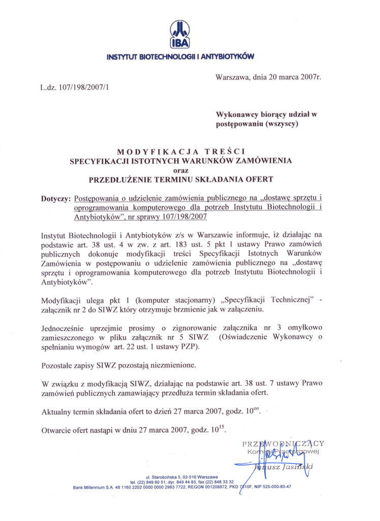 Warszawa, dnia 20 marca 2007r. L.dz.l07/198/2007/1 Wykonawcy