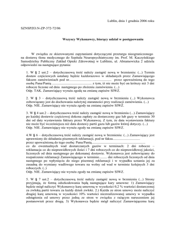 Lublin, dnia 1 grudnia 2006 roku SZNSPZO.N-ZP-372-72/06 Wszyscy Wykonawcy, biorący udział w postępowaniu W związku ze skierowanymi zapytaniami dotyczącymi przetargu nieograniczonego na dostawę tlenu medycznego do Szpitala Neuropsychiatryczny im. Prof. M. Kaczyńskiego Samodzielny Publiczny Zakład Opieki Zdrowotnej w Lublinie, ul. Abramowicka 2 udziela odpowiedzi na następujące pytania: 1. W § 2 ust.2 – dotychczasową treść należy zastąpić nową w brzmieniu: (...) Termin dostaw częściowych ustalany będzie każdorazowo w składanych przez Zamawiającego faksem zamówieniach pod nr................................................ przez upoważnioną do tego osobę Pana/Panią ............................................. z tym, iż nie może być on krótszy niż 3 dni robocze liczone od dnia następnego po złożeniu zamówienia. (...) Odp. TAK. Zamawiający wyraża zgodę na zmianę zapisów SIWZ. 2. W § 3 – dotychczasową treść należy zastąpić nową w brzmieniu (...) Wykonawca zobowiązany jest do dochowania należytej staranności przy realizacji zamówienia. (...) Odp. NIE. Zamawiający nie wyraża zgody na zmianę zapisów SIWZ. 3. W § 4 ust.2 – dotychczasowa treść należy zastąpić nową w brzmieniu (...) Zamawiający po każdej dostawie częściowej dokona zapłaty za dostarczony gaz lub gazy w terminie 30 dni od daty wystawienia faktury przez Wykonawcę. Z tym, że data wystawienia faktury nie może być wcześniejsza niż data dostawy partii gazu lub gazów której dotyczy. (...) Odp. NIE. Zamawiający nie wyraża zgody na zmianę zapisów SIWZ. 4.W § 6 – dotychczasową treść należy zastąpić nową w brzmieniu: (...) Zamawiający jest uprawniony do składania pisemnych reklamacji, pod nr faksu............................... przez upoważnioną do tego osobę: Pana/Panią............................................................. co do ewentualnych wad dostarczanych gazów w terminach: 2 dni robocze – reklamacja co do nieprawidłowych ilości i 7 dni roboczych co do nieprawidłowej jakości, liczonych od dnia następnego po dokonanej dostawie. Wykonawca jest zobowiązany do rozpatrzenie reklamacji Zamawiającego w terminie......... dni roboczych liczonych od dnia następnego po wpłynięciu do niego pisemnej reklamacji i w wypadku uznania jej za zasadną do wymiany wadliwego towaru na wolny od wad w terminie kolejnych 3 dni roboczych. (..) Odp. NIE. Zamawiający nie wyraża zgody na zmianę zapisów SIWZ. 5. W § 7 ust.2 – dotychczasową treść należy zastąpić nową w brzmieniu (...) Strony przyjmują, że formą odszkodowania będą następujące kary umowne: 1) Zamawiający będzie mógł naliczyć Wykonawcy karę umowną w wysokości 0,2 % wartości dostarczonej za zwłoką partii towaru za każdy dzień zwłoki. 2.) Każda ze stron umowy może naliczyć drugiej karę umowną w wysokości 10% wartości niezrealizowanej umowy w wypadku odstąpienia od umowy przez jedną ze stron w związku z rażącym naruszeniem jej postanowień przez drugą. 3) Wykonawca będzie mógł naliczyć Zamawiającemu karę umowną za nieterminową zapłatę w wysokości odsetek ustawowych za każdy rozpoczęty dzień zwłoki. Odp. NIE. Zamawiający nie wyraża zgody na zmianę zapisów SIWZ. 6.W § 7 – dotychczasową treść należy zastąpić nową w brzmieniu (...) Wszelkie spory wynikłe z realizacji niniejszej umowy będą oddawane do rozpatrzenia właściwemu sądowi powszechnemu (...) Odp. NIE. Zamawiający nie wyraża zgody na zmianę zapisów SIWZ. 7. Jednocześnie zwracamy się z prośbą o przełożenie terminu składania ofert na 7.12.2006 Odp. Zamawiający informuje, że ulega termin składania i otwarcia ofert. - termin składania ofert: 07.12.2006 r., godz.10:00 - termin otwarcia ofert: 07.02.2006 r., godz. 10:30