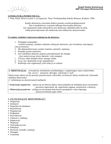 Zespół Kadry Kształcącej ZHP Chorągwi Białostockiej LITERATURA POMOCNICZA: 1. Penc Józef, Motywowanie w zarządzaniu, Wyd. Profesjonalnej Szkoły Biznesu, Kraków 1996. Każdy drużynowy powinien dobrze poznać swoich podopiecznych. Jest to podstawowy warunek dobrego kierowania drużyną: bez znajomości ludzi niemożliwe jest skuteczne oddziaływanie na nich, trafne przewidywanie ich zachowań oraz efektywne motywowanie. Co należy wiedzieć o harcerzu należącym do drużyny: 1. Postępuje racjonalnie (ocenia sytuację z punktu widzenia własnych interesów, jest świadomy otaczającej rzeczywistości). 2. Ma shierarchizowany system wartości, potrzeb i aspiracji. 3. Posiada system interesów. 4. Jest członkiem drużyny poprzez przynależność do zastępu (jest motywowany przez dążenia i cele zastępu). 5. Tworzy sobie dodatni obraz samego siebie. 6. Uczy się i doskonali swoje umiejętności. 7. Realizuje cele organizacji, jeśli uzna je za własne. 2. MOTYWACJA – wewnętrzny mechanizm uruchamiający i organizujący nasze zachowanie. - łac. moveo – poruszać, dźwigać, wprawiać w ruch Motywacja odnosi się do przeżyć psychicznych człowieka, od których zależy możliwość i kierunek ludzkiej aktywności (+ informacje na skserowanych kartkach) motywacja negatywna – opiera się na obawie (lęku), która pobudza do działania przez stwarzanie poczucia zagrożenia, np. zagrożenie naganą, usunięciem z drużyny. Motywacja pozytywna – polega na stwarzaniu harcerzowi perspektyw coraz lepszego urzeczywistnienia jego celów 3. CO TO ZNACZY MOTYWOWAĆ? Namawiać Zachęcać Popychać do działania Stymulować Proponować Podjudzać Prowokować Uderzać w ambicję Inspirować Wspierać Ukierunkowywać Pobudzać Stwarzać warunki, sytuację Pomagać Umacniać 1 Zespół Kadry Kształcącej ZHP Chorągwi Białostockiej Stawiać wyzwania Zaspokajać potrzeby Udoskonalać Rozwijać Wskazywać perspektywy Krzepić wiarę Uwiarygodniać Konstruktywnie krytykować Rozmawiać Dawać informację zwrotną Nagradzać i wyróżniać Chwalić Doceniać Dziękować Zauważać Awansować Słuchać 4. ELEMENTY PROCESU MOTYWOWANIA: Poznanie osobowości, potrzeb, zainteresowań i aspiracji harcerzy Wyznaczenie zadań w sposób umożliwiający samokontrolę postępu Dobra wewnętrzna komunikacja (przepływ informacji) Ustalenie zasad nagradzania Stosowanie środków motywacji Okresowe oceny postępów dokonanych przez harcerzy 5. CO NAS MOTYWUJE? Ludzie (drużynowy, rodzice, przyjaciele) sukces nagroda i prestiż odpowiedzialność wyzwania zaufanie nasze potrzeby lęk przed kara możliwość rozwoju konkretne miejsca marzenia porażki lub ich perspektywa beznadzieja czułość, miłość dobre słowo drobiazgi obowiązki radość i optymizm oczekiwania innych ludzi sukces innych ludzi – bo widzę, że się im udało, wiec dlaczego nie mnie? Wiara, że się uda Chęć osiągnięcia czegoś, udowodnienia czegoś komuś Pozytywne reakcje innych na nasze działania Potkania z fachowcami Świadomość własnego rozwoju Świadomość, że są ludzie, którzy myślą, tak ja Stopnie i sprawności Zbiórki na interesujące nas tematy Wyjazdy na biwaki, obozy, rajdy, kursy Chęć pokazania wiedzy na zbiórkach Satysfakcja, poczucie samorealizacji Dobre oceny Pochwała Krytyka Zaliczone zadanie Zdobycie celu Widok uśmiechniętych dzieci Dobra ewaluacja Konkurencja Rywalizacja Niepowodzenie Poczucie, że jesteśmy potrzebni Praca grupowa Chęć pomagania innym Akceptacja grupy 2 Zespół Kadry Kształcącej ZHP Chorągwi Białostockiej 6. ZASADY MOTYWACJI 1. potrzeby 2. nagroda 3. równowaga 4. oczekiwania 7. PIRAMIDA POTRZEB MASLOWA: (kolejność: od dołu do szczytu piramidy) 1. fizjologiczne 2. bezpieczeństwa 3. przynależności 4. szacunku 5. samorealizacji 8. TECHNIKI MODYFIKACJI ZACHOWAŃ 1. pozytywne wzmacnianie – nagrody – zachęcanie do powtarzania pozytywnych zachowań - bardzo skuteczne - wprowadza dobrą atmosferę - drużynowy zostaje obdarzony pozytywnymi uczuciami 2. uczenie unikania – podopieczny nie robi pewnych rzeczy ze względu na negatywne, przykre konsekwencje, groźba kary 3. wygaszanie – ma na celu redukowanie niepożądanych zachowań - polega na braku reakcji, nagrody lub kary, ze strony drużynowego, ignorowanie zachowania 4. karanie – wywołuje natychmiastowe skutki, ale nie zawsze trwałe - ma negatywne skutki: powoduje urazę, gniew, agresję, hamuje tez działanie pozytywne 9. RODZAJE ŚRODKÓW MOTYWACJI 1. środki przymusu – rozkazy, nakazy, polecenia, zalecenia, rady, a także własne zobowiązania i powinności przyjęte przez siebie, zmuszające do określonego działania i zachowania. Podporządkowanie się woli drużynowego bez względu na potrzeby harcerzy. 2. środki zachęty – obietnice składane harcerzowi w celu zainteresowania go lepszym wykonaniem pracy: materialne – korzyści ekonomiczne (nagrody rzeczowe, pieniądze) niematerialne – dodające harcerzowi powagi, godności (awanse, uznanie, pochwały, możliwość samorozwoju) Są to środki odwołujące się do motywacji zewnętrznej – wpływanie na zachowania. 2. środki perswazji – przekonywanie do określonych zachowań. Może mieć formę negocjacji, konsultacji między motywującym i motywowanym lub też formę wmawiania, sugerowania. Są to środki odwołujące się do motywacji wewnętrznej – wpływają na wewnętrzne odczucia i przekonania harcerzy. Środki motywacji zawsze wywierają duży wpływ na zachowanie się ludzi w drużynie: kształtują ich świadomość, stosunek do zajęć i do przełożonych, a także stosunki między członkami drużyny. Skłaniają one harcerzy do podejmowania ambitniejszych zadań, zaniechania postawy bierności, a przyjmowania postawy zaangażowania i chęci współpracy. 3