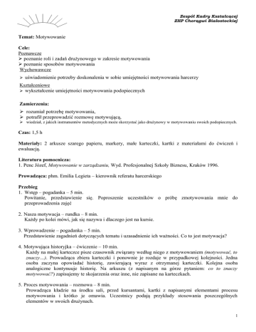 Zespół Kadry Kształcącej ZHP Chorągwi Białostockiej Temat: Motywowanie Cele: Poznawcze poznanie roli i zadań drużynowego w zakresie motywowania poznanie sposobów motywowania Wychowawcze uświadomienie potrzeby doskonalenia w sobie umiejętności motywowania harcerzy Kształceniowe wykształcenie umiejętności motywowania podopiecznych Zamierzenia: rozumiał potrzebę motywowania, potrafił przeprowadzić rozmowę motywującą, wiedział, z jakich instrumentów metodycznych może skorzystać jako drużynowy w motywowaniu swoich podopiecznych. Czas: 1,5 h Materiały: 2 arkusze szarego papieru, markery, małe karteczki, kartki z materiałami do ćwiczeń i ewaluacją. Literatura pomocnicza: 1. Penc Józef, Motywowanie w zarządzaniu, Wyd. Profesjonalnej Szkoły Biznesu, Kraków 1996. Prowadząca: phm. Emilia Legieta – kierownik referatu harcerskiego Przebieg 1. Wstęp – pogadanka – 5 min. Powitanie, przedstawienie się. Poproszenie uczestników o próbę zmotywowania mnie do przeprowadzenia zajęć 2. Nasza motywacja – rundka – 8 min. Każdy po kolei mówi, jak się nazywa i dlaczego jest na kursie. 3. Wprowadzenie – pogadanka – 5 min. Przedstawienie zagadnień dotyczących tematu i uzasadnienie ich ważności. Co to jest motywacja? 4. Motywująca historyjka – ćwiczenie – 10 min. Każdy na małej karteczce pisze czasownik związany według niego z motywowaniem (motywować, to znaczy…). Prowadząca zbiera karteczki i ponownie je rozdaje w przypadkowej kolejności. Jedna osoba zaczyna opowiadać historię, zawierającą wyraz z otrzymanej karteczki. Kolejna osoba analogiczne kontynuuje historię. Na arkuszu (z napisanym na górze pytaniem: co to znaczy motywować?) zapisujemy te skojarzenia oraz inne, nie zapisane na karteczkach. 5. Proces motywowania – rozmowa – 8 min. Prowadząca kładzie na środku sali, przed kursantami, kartki z napisanymi elementami procesu motywowania i krótko je omawia. Uczestnicy podają przykłady stosowania poszczególnych elementów w swoich drużynach. 1 Zespół Kadry Kształcącej ZHP Chorągwi Białostockiej 6. Co należy wiedzieć o harcerzu należącym do drużyny – pogadanka – 5 min. Uczestnicy otrzymują karteczki z informacjami, jakie należy wziąć pod uwagę motywując harcerzy. Krótkie omówienie 7. Podział na grupy – 2 min. Kursanci ustawiają się w rzędzie według numerów swoich drużyn. Prowadząca dzieli ich na 3 grupy. 8. Co nas motywuje – praca w grupach, rozmowa – 10 min. Kursanci mają za zadanie wypisać w ciągu 5 min jak najwięcej rzeczy, czynników, osób, które ich motywują. Prowadząca mówi, że grupa, która wypisze ich najwięcej, zostanie pochwalona, jako pierwsza odczyta swoje czynniki i dostanie czekoladę, a grupa, która wypisze ich najmniej, będzie miała za zadanie przeprowadzić pląs dla wszystkich. Przeczytanie kartek, wyłonienie zwycięzcy i omówienie znaczenia środków motywujących (pochwały, nagrody) w wykonaniu tego ćwiczenia 9. Przerywnik – pląs – 2 min. 10. Piramida Maslowa – pogadanka, dyskusja – 8 min. Prezentacja piramidy Maslowa i omówienie poszczególnych poziomów potrzeb. Omówienie znaczenia potrzeb w procesie motywacji. Kursanci podają przykłady poszczególnych potrzeb. Omówienie zasad motywacji 11.Techniki modyfikacji zachowań – prezentacja, pogadanka – 8 min. Pokazanie planszy z technikami modyfikacji zachowań. Omówienie ich znaczenia i skuteczności razem z kursantami, wybór najlepszej techniki 12. Rodzaje środków motywacji – scenki – 10 min. Każda grupa ma za zadanie przedstawienie scenki dotyczącej jednego z podanych zagadnień (środek przymusu, zachęty lub perswazji) oraz pokazanie sposobu na rozwiązanie zaistniałego w scence problemu wychowawczego. Po każdej scence analizujemy, jakie techniki i środki motywacji były użyte w scenkach i omawiamy ich skuteczność. 13. Instrumenty metodyczne jako środek motywacji – pogadanka – 5 min. Omówienie znaczenia stopni, sprawności i zadań zespołowych w motywowaniu harcerzy. 14. Zmotywuj mnie… - praca w grupach – 5 min. Kursanci dobierają się w pary i, korzystając z pokazanych plansz oraz 10 przykazań dla motywującego, motywują siebie nawzajem. Najpierw jedna osoba mówi o sytuacji ze swojego życia, do której nie jest zmotywowana, druga osoba próbuje ja przekonać. Po 3 min. zamiana. Podsumowanie ćwiczenia: jak kursanci czuli się jako motywujący, a jak jako motywowani? 15. Zakończenie – 5 min. Podsumowanie treści zajęć Wypełnienie ewaluacji MATERIAŁY DO ĆWICZEŃ: (1) MOTYWACJA – wewnętrzny mechanizm uruchamiający i organizujący nasze zachowanie. - łac. moveo – poruszać, dźwigać, wprawiać w ruch Motywacja odnosi się do przeżyć psychicznych człowieka, od których zależy możliwość i kierunek ludzkiej aktywności (+ informacje na skserowanych kartkach) 2 Zespół Kadry Kształcącej ZHP Chorągwi Białostockiej (2) CO TO ZNACZY MOTYWOWAĆ? namawiać zachęcać popychać do działania stymulować proponować konstruktywnie krytykować podjudzać prowokować uderzać w ambicję inspirować + inne czasowniki z kartki ksero (3) ELEMENTY PROCESU MOTYWOWANIA: poznanie osobowości, potrzeb, zainteresowań i aspiracji harcerzy wyznaczenie zadań w sposób umożliwiający samokontrolę postępu dobra wewnętrzna komunikacja (przepływ informacji) ustalenie zasad nagradzania stosowanie środków motywacji okresowe oceny postępów dokonanych przez harcerzy (4) Co należy wiedzieć o harcerzu należącym do drużyny: Postępuje racjonalnie (ocenia sytuację z punktu widzenia własnych interesów, jest świadomy otaczającej rzeczywistości). Ma shierarchizowany system wartości, potrzeb i aspiracji. Posiada system interesów. Jest członkiem drużyny poprzez przynależność do zastępu (jest motywowany przez dążenia i cele zastępu). Tworzy sobie dodatni obraz samego siebie. Uczy się i doskonali swoje umiejętności. Realizuje 