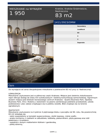 MIESZKANIE na WYNAJEM 1 950 Kraków, Kraków-Śródmieście, Nadrzeczna 83 m2 1411/3923/OMW Secondary LowBlock 83 4 3 Separate Opis Do wynajęcia od zaraz dwupokojowe mieszkanie o powierzchni 83 m2 przy ul. Nadrzecznej! LOKALIZACJA: Mieszkanie usytuowane jest w północnej części Krakowa. Miejsce jest świetnie zlokalizowane rejon oferuje dostęp do wielu linii autobusowych i świetną komunikację samochodową. Ogromnym atutem miejsca jest bliskość biznesowego centrum Krakowa - Quatro Business Park, Opolska Business Park, Vinci. Rodziny z dzieckiem na pewno zainteresuje pobliskie przedszkole, szkoła podstawowa i plac zabaw znajdujące się w pobliżu osiedla. Blok znajduje się na terenie ogrodzonym. Apartament: Mieszkanie usytuowane na 4 pietrze 4 piętrowego bloku z początku lat 90. roku. Na powierzchnię 83 m2 składają się: - salon wyposażony w komplet wypoczynkowy, stolik kawowy, niskie szafki, - aneks kuchenny z meblami w zabudowie, lodówką, piekarnikiem, płytą gazową oraz stół jadalniany z krzesłami, - sypialnia z dużym małżeńskim łóżkiem i garderobą, - pokój dzienny, GAMP s.c. - łazienki wyposażonej w prysznic, umywalkę, WC, pralkę i grzejnik drabinowy, - 2 duże balkony Miejsce parkingowe na terenie zamkniętego osiedla. FINANSE: - 1950 PLN dla właściciela + około 500 PLN czynsz administracyjny (w tym: ogrzewanie, woda zimna, ochrona, śmieci, fundusz remontowy i utrzymanie części wspólnej) + prąd i gaz wg. zużycia - jednorazowa kaucja zwrotna, - prowizja dla biura nieruchomości. UWAGI: - wolne od zaraz - idealne dla rodzin z dzieckiem, - ogrzewanie z sieci miejskiej, - teren ogrodzony, - balkon, For rent immediately one bedroom apartment with an area of 83 m2 Nadrzeczna Street! LOCATION: The flat is located in the northern part of Krakow. The place is well situated - the region offers many bus lines and a great car communication. The biggest advantage of the place is its proximity to the business center of Krakow - Quatro Business Park, Opole Business Park, Vinci. Families with children will surely be interested nearby kindergarten, primary school and playground nearby settlements. The block is located on the fenced ground. Apartment: The apartment located on the 4th floor of 4 storey block of early 90th year. On the surface of 83 m2 comprises: - Living room with sofa, coffee table, low cabinets, - Kitchen with furniture in the building, fridge, oven, gas hob and a dining table with chairs, - Bedroom with a large double bed and wardrobe, - living room, - Bathroom with a shower, sink, toilet, washing machine and radiator ladder. - 2 large balconies Parking on the closed housing estate. FINANCES: - 1950 PLN for the owner + 500 PLN administration fee (including heating, cold water, security, garbage, repair fund and maintenance of common parts) + electricity and gas by. wear - A one-time refundable deposit, - Commission for real estate agency. COMMENTS: - Free immediately - Ideal for families with children, - Heating from the city, - Balcony, Serdecznie polecam! Bardzo proszę o kontakt lub o wypełnienie formularza na stronie: http://www.gamp-krakow.pl/zglos-poszukiwanie/ na pewno znajdziemy idealne mieszkanie, spełniające Państwa preferencje. Zachęcamy również do odwiedzenia naszej strony internetowej: www.gamp-krakow.pl KONTAKT DO AGENTA: Hubert Strugała Tel.: +48 530 900 452 GAMP s.c. Email: [email protected] GAMP Nieruchomości. Nowa jakość. Hubert Strugała tel. +48 530 900 452 email: [email protected] GAMP s.c. Powered by TCPDF (www.tcpdf.org)