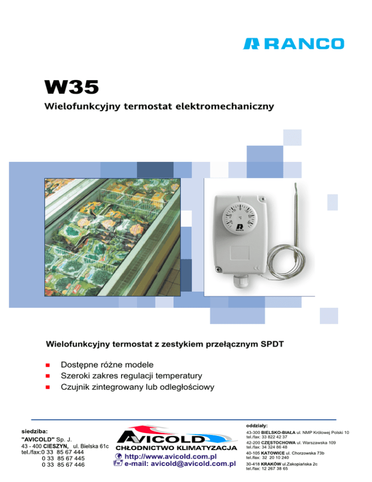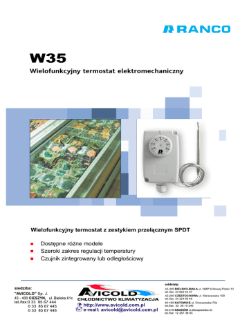 W35 Wielofunkcyjny termostat elektromechaniczny Wielofunkcyjny termostat z zestykiem przełącznym SPDT ■ ■ ■ Dostępne różne modele Szeroki zakres regulacji temperatury Czujnik zintegrowany lub odległościowy 43-300 BIELSKO-BIAŁA ul. NMP Królowej Polski 10 tel./fax: 33 822 42 37 42-200 CZĘSTOCHOWA ul. Warszawska 109 tel./fax: 34 324 86 48 Wielofunkcyjny termostat z zestykiem przełącznym SPDT Termostat automatycznie otwiera (funkcja grzania) lub zamyka (funkcja chłodzenia) główny styk, gdy temperatura odczytana przez bańkę pomiarową osiąga wartość nastawy. Następnie, gdy temperatura spada poniżej wartości różnicy łączeń styk się zwiera (funkcja grzania) lub otworzy (funkcja chłodzenia). Zastosowanie Dane techniczne ■Przekaźnik termostaty chłodzące C-2 15(3)A @ 400VAC C-1 2,5(0,6)A @ 400VAC ■Przekaźnik termostaty grzewcze C-1 15(3)A @ 400VAC C-2 2,5(0,6)A @ 400VAC 100 000 cykli ■Żywotność >100 MOhm ■Rezystancja izolacji ■Maksymalna temp. 90oC (obudowa) ■Wytrzymałość elektryczna AC 2000V 1 min. ■Przyłącza FASTON 6,3x0,8 ENEC03 ■Standardy: IP40 ■Stopień ochrony ■Dostępne są modele ze zintegrowanym lub odległościowym czujnikiem. WK35-1x 53 mm Modele Kod kapilara* zakres Ø6.5x98mm bańka 1500mm -35 ... +35°C W35-10H1150C00 Ø6.5x98mm 1500mm 0 ... +90°C W35-10H3150C00 Ø6.5x98mm 1500mm 0 ... +120°C W35-20C0000C00 Ø7.0x98mm - -35 ... +35°C W35-10C0150C00 *inne modele na zapytanie WK35-2x 56 mm 62 mm 53 mm 96 mm 96 mm Wymiary ! Układy chłodnicze ! Sauny ! Szklarnie ! Urządzenia przemysłowe ! Układy klimatyzacyjne ! Bojlery ! Układy wymagające niezależnego układu regulacji temperatury 56 mm