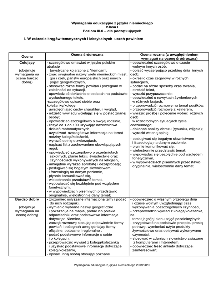 Wymagania edukacyjne z języka niemieckiego Klasa I Poziom III.0 – dla początkujących I. W zakresie kręgów tematycznych i leksykalnych uczeń powinien: Ocena Celujący (obejmuje wymagania na ocenę bardzo dobrą) Bardzo dobry (obejmuje wymagania na ocenę dobrą) Ocena śródroczna Ocena roczna (z uwzględnieniem wymagań na ocenę śródroczną) - szczegółowo omawiać w języku polskim - opowiedzieć szczegółowo o czasie atrakcje wolnym innych osób, turystyczne kojarzone z Niemcami, - opisać wyczerpująco przebieg dnia innych - znać oryginalne nazwy wielu niemieckich miast, osób; gór i rzek, państw europejskich oraz innych - określić czas zegarowy w różnych pojęć geograficznych, sytuacjach, - stosować różne formy powitań i pożegnań w - podać na różne sposoby czas trwania, zależności od sytuacji, - streścić tekst, - opowiedzieć dokładnie o osobach na podstawie - wyrazić przypuszczenie; wysłuchanego tekstu, - opowiedzieć o nawykach żywieniowych -szczegółowo opisać siebie oraz w różnych krajach, koleżankę/kolegę - przeprowadzić rozmowę na temat posiłków, uwzględniając cechy charakteru i wygląd, - przeprowadzić rozmowę z kelnerem, - udzielić wywiadu wcielając się w postać znanej - wyrazić prośbę i polecenie wobec różnych osoby; osób - opowiedzieć szczegółowo o swojej rodzinie, w różnorodnych sytuacjach życia - liczyć od 1 do 100 używając nazewnictwa codziennego; działań matematycznych, - dokonać analizy obrazu (rysunku, zdjęcia); - uzyskiwać szczegółowe informacje na temat - wyrazić własną opinię rodziny kolegi/koleżanki, - posługiwać się bogatym słownictwem - wyrazić opinię o zwierzętach, i frazeologią na danym poziomie, - napisać list z zachowaniem obowiązujących - płynnie komunikować się, reguł; - wielostronnie przedstawić temat, - opowiedzieć szczegółowo o przedmiotach - wypowiadać się bezbłędnie pod względem szkolnych, planie lekcji, świadectwie oraz fonetycznym, czynnościach wykonywanych na lekcjach, - w wypowiedziach pisemnych przedstawić - umiejętnie wyrażać aprobatę i dezaprobatę; oryginalnie, wielostronnie dany temat; - posługiwać się bogatym słownictwem i frazeologią na danym poziomie, - płynnie komunikować się, - wielostronnie przedstawić temat, - wypowiadać się bezbłędnie pod względem fonetycznym, - w wypowiedziach pisemnych przedstawić oryginalnie, wielostronnie dany temat; - zrozumieć usłyszane internacjonalizmy i podać - opowiedzieć o własnym przebiegu dnia do nich rodzajniki, i czasie wolnym uwzględniając czas - wymienić wybrane nazwy geograficzne wykonywania poszczególnych czynności, i pokazać je na mapie, podać ich polskie - przeprowadzić wywiad z kolegą/koleżanką odpowiedniki oraz podstawowe informacje na dotyczące Niemiec, temat jego/jej planu zajęć pozalekcyjnych, - zacząć rozmowę stosując odpowiednie formy - przygotować na podstawie przepisu prostą powitań i pożegnań uwzględniając formy potrawę, wymieniać użyte produkty oficjalne, potoczne i regionalne , żywnościowe oraz opisywać wykonywane - podać podstawowe informacje o sobie czynności, i o kolegach, - stosować w zdaniach słownictwo związane - przeprowadzić wywiad z kolegą/koleżanką z komputerami i Internetem, i uzyskać podstawowe informacje dotyczące - opowiedzieć treść ankiety dotyczącej kolegi/koleżanki, zainteresowań; - opisać inną osobą stosując poznane Wymagania edukacyjne z języka niemieckiego 2009/2010 Dobry (obejmuje wymagania na ocenę dostateczną) czasowniki i przymiotniki określające wygląd i cechy charakteru - opisywać własną rodzinę przy użyciu usłyszanych rzeczowników, - liczyć od 1 do 20, bez dłuższego zastanowienia się, używając nazewnictwa działań matematycznych, - wyszukać w tekście wyrazy służące do opisu powiązań rodzinnych oraz nazwy zawodów, - liczyć samodzielnie i zapisywać liczebniki od 1 do 100, - wykorzystać usłyszane wiadomości na temat rodziny, cech charakteru, wykonywanego zawodu podczas rozmowy, - samodzielnie przeczytać i przetłumaczyć tekst o rodzinie oraz opowiadać o własnej rodzinie(na podstawie zdjęć), - znać niemieckie przysłowia o rodzinie, - samodzielnie opowiadać o swoich zwierzętach lub innej osoby oraz posługiwać się zwrotami frazeologicznymi dot. świata zwierząt, - samodzielnie przeczytać, przetłumaczyć oraz napisać list z użyciem określonych reguł i zwrotów, bez problemów władać słownictwem dot. rodziny i hobby; - bez problemów posługiwać się nazwami przedmiotów szkolnych oraz wykorzystać je w krótkich dialogach, - wyrażać w swych wypowiedziach aprobatę i dezaprobatę, - dokładnie opowiedzieć o swoim planie lekcji oraz planie kolegi/koleżanki i czynnościach wykonywanych na lekcjach, - bez problemów przeczytać, przetłumaczyć i opowiedzieć tekst dotyczący szkoły, - opowiedzieć o swoim świadectwie i ocenach; - wykazać się bardzo dobrą znajomością słownictwa, - wypowiadać się poprawnie, bez większych błędów w wymowie i intonacji; - zrozumieć i przetłumaczyć usłyszane internacjonalizmy, - wymienić wybrane nazwy geograficzne i pokazać je na mapie oraz podać ich polskie odpowiedniki, - dobierać odpowiednie formy powitania i pożegnania stosownie do sytuacji, - podać podstawowe informacje o sobie, - zrozumieć przeczytany wywiad, - ułożyć proste zdania z zastosowaniem poznanych czasowników i przymiotników; - wymienić usłyszane rzeczowniki i przymiotniki służące do opisywania innych osób, - liczyć od 1 do 20, lecz wymaga to zastanowienia się, używając nazewnictwa działań matematycznych, - podać oficjalnie i potocznie czas zegarowy, - zapytać o czas trwania, - opowiedzieć o przebiegu swojego dnia i innej osoby, - napisać dłuższą wypowiedź na temat przebiegu własnego dnia powszedniego, - opisać przyrodę i zjawiska pogodowe, - opowiedzieć o nawykach żywieniowych 