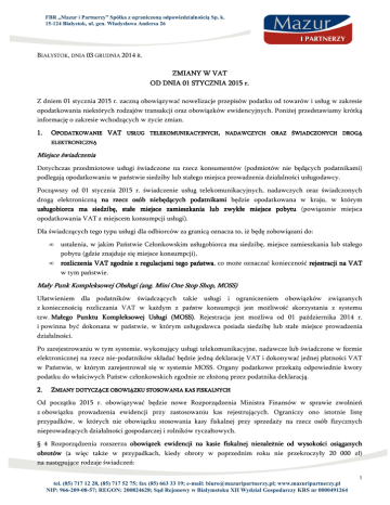 BIAŁYSTOK, DNIA 03 GRUDNIA 2014 R. ZMIANY W VAT OD DNIA 01 01 STYCZNIA 2015 r. Z dniem 01 stycznia 2015 r. zaczną obowiązywać nowelizacje przepisów podatku od towarów i usług w zakresie opodatkowania niektórych rodzajów transakcji oraz obowiązków ewidencyjnych. Poniżej przedstawiamy krótką informację o zakresie wchodzących w życie zmian. 1. OPODATKOWANIE PODATKOWANIE VAT USŁUG TELEKOMUNIKACYJNYCH TELEKOMUNIKACYJNYCH, NADAWCZYCH ORAZ ŚWIADCZONYCH ŚWIADCZONYCH DROGĄ ELEKTRONICZNĄ Miejsce świadczenia Dotychczas przedmiotowe usługi świadczone na rzecz konsumentów (podmiotów nie będących podatnikami) podlegają opodatkowaniu w państwie siedziby lub stałego miejsca prowadzenia działalności usługodawcy. Począwszy od 01 stycznia 2015 r. świadczenie usług telekomunikacyjnych, nadawczych oraz świadczonych drogą elektroniczną na rzecz osób niebędących podatnikami będzie opodatkowana w kraju, w którym usługobiorca ma siedzibę, stałe miejsce zamieszkania lub zwykłe miejsce pobytu (powiązanie miejsca opodatkowania VAT z miejscem konsumpcji usługi). Dla świadczących tego typu usługi dla odbiorców za granicą oznacza to, iż będę zobowiązani do: • • ustalenia, w jakim Państwie Członkowskim usługobiorca ma siedzibę, miejsce zamieszkania lub stałego pobytu (gdzie znajduje się miejsce konsumpcji), państwa, co może oznaczać konieczność rejestracji na VAT rozliczenia VAT zgodnie z regulacjami tego państwa w tym państwie. Mały Punk Kompleksowej Obsługi (ang. Mini One Stop Shop, MOSS) Ułatwieniem dla podatników świadczących takie usługi i ograniczeniem obowiązków związanych z koniecznością rozliczania VAT w każdym z państw konsumpcji jest możliwość skorzystania z systemu tzw. Małego Punktu Kompleksowej Usługi (MOSS). (MOSS) Rejestracja jest możliwa od 01 października 2014 r. i powinna być dokonana w państwie, w którym usługodawca posiada siedzibę lub stałe miejsce prowadzenia działalności. Po zarejestrowaniu w tym systemie, wykonujący usługi telekomunikacyjne, nadawcze lub świadczone w formie elektronicznej na rzecz nie-podatników składać będzie jedną deklarację VAT i dokonywać jednej płatności VAT w Państwie, w którym zarejestrował się w systemie MOSS. Organy podatkowe przekażą odpowiednie kwoty podatku do właściwych Państw członkowskich zgodnie ze złożoną przez podatnika deklaracją. 2. ZMIANY DOTYCZĄCE OBOWIĄZKU OBOWIĄZKU STOSOWANIA KAS FISKALNYCH Od początku 2015 r. obowiązywać będzie nowe Rozporządzenia Ministra Finansów w sprawie zwolnień z obowiązku prowadzenia ewidencji przy zastosowaniu kas rejestrujących. Ograniczy ono istotnie listę przypadków, w których nie obowiązku stosowania kasy fiskalnej przy sprzedaży na rzecz osób fizycznych nieprowadzących działalności gospodarczej i rolników ryczałtowych. § 4 Rozporządzenia rozszerza obowiązek ewidencji na kasie fiskalnej niezależnie od wysokości osiąganych obrotów (a więc także w przypadkach, kiedy obroty w poprzednim roku nie przekroczyły 20 000 zł) na następujące rodzaje świadczeń: 1 • • • • • • • • • • dostawy nośników danych cyfrowych bądź analogowych w przypadku braku zapisania na tych nośnikach danych, dostawy perfum i wód toaletowych (PKWiU 20.42.11.0), usługi naprawy pojazdów silnikowych oraz motorowerów (w tym naprawy opon, ich zakładania, bieżnikowania i regenerowania), usługi w zakresie wymiany opon lub kół, usługi w zakresie badań i przeglądów technicznych pojazdów, usługi w zakresie opieki medycznej świadczonej przez lekarzy i lekarzy dentystów usługi prawnicze, z wyjątkiem czynności notarialnych, usługi doradztwa podatkowego, usługi związane z wyżywieniem (PKWiU 56) świadczone przez stacjonarne placówki gastronomiczne (również sezonowo) oraz catering, usługi fryzjerskie, kosmetyczne i kosmetologiczne. Obowiązku ewidencji tych świadczeń na kasie nie będzie jednak w przypadku: • • świadczenia usług przez podatnika na rzecz jego pracowników oraz przez spółdzielnie mieszkaniowe na rzecz członków lub innych wskazanych w załączniku osób, ale tylko w odniesieniu do usług nabytych w imieniu i na rzecz pracowników/członków spółdzielni i im odsprzedawanych, świadczenia usług związanych z wyżywieniem, świadczonych na pokładach samolotów lub w sposób określony w poz. 45 Załącznika do Rozporządzenia (stołówki). Zmianie ulegnie również treść Załącznika do Rozporządzenia, w który wymieniane są kategorie dostaw towarów i usług zwolnionych z obowiązku ewidencji na kasie fiskalnej. W porównaniu z obecnie obowiązującymi przepisami usunięto z niego zwolnienia dla: • • świadczenia usług udokumentowanych w każdym przypadku fakturą, jeśli liczba usług i ich odbiorców w poprzednim roku podatkowym nie przekroczyła określonych wartości, sprzedaży biletów i rezerwacji miejsc przy przewozach rozkładowych pasażerskich. Załącznik do nowego Rozporządzenia będzie też zawierał nowe zwolnienia ze stosowania kasy dla: • • usług nadawczych i elektronicznych objętych procedurą rozliczania podatku MOSS, pod warunkiem świadczenia również usług telekomunikacyjnych dostawy towarów i świadczenia usług, które na podstawie przepisów o podatku dochodowym są zaliczane przez podatnika do środków trwałych oraz wartości niematerialnych i prawnych podlegających amortyzacji. Obrót z tytułu zrealizowanych lub przewidywanych dostaw nieruchomości, sprzedaży środków trwałych i wartości niematerialnych i prawnych nie będzie uwzględniany również w kalkulacji limitu dla zwolnienia z obowiązku stosowania kasy ze względu na obroty nieprzekraczające 20 000 zł. 3. LIKWIDACJA OBOWIĄZKU UZYSKIWANIA ZAŚWIADCZENIA VATVAT-25 Ustawa, która wprowadziła od kwietnia 2014 nowe zasady odliczania VAT od wydatków związanych z samochodami, uchyla również z dniem 1 stycznia 2015