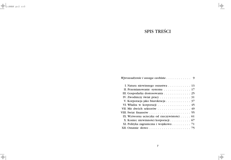 j:AMAK p:2 c:0 SPIS TREŚCI Wprowadzenie i uwaga osobista . . . . . . . . . . . . 9 I. Natura niewinnego oszustwa . . . . . . II. Przemianowanie systemu . . . . . . . . III. Gospodarka dostosowania . . . . . . . . IV. Zwodniczy świat pracy . . . . . . . . . . V. Korporacja jako biurokracja . . . . . . . VI. Władza w korporacji . . . . . . . . . . . VII. Mit dwóch sektorów . . . . . . . . . . . VIII. Świat finansów . . . . . . . . . . . . . . . IX. Wytworna ucieczka od rzeczywistości X. Koniec niewinności korporacji . . . . . XI. Polityka zagraniczna i wojskowa . . . . XII. Ostatnie słowo . . . . . . . . . . . . . . . 7 . . . . . . . . . . . . . . . . . . . . . . . . . . . . . . . . . . . . . . . . . . . . . . . . . . . . . . . . . . . . 13 17 25 31 37 45 49 55 61 67 71 75 j:AMAK p:3 c:0 WPROWADZENIE I UWAGA OSOBISTA O d jakichś siedemdziesięciu lat moje życie zawodowe było związane z gospodarką, obok nierzadkich epizodów działalności publicznej i politycznej, które miały pewien aspekt ekonomiczny, oraz jednej wycieczki w dziedzinę dziennikarstwa. Nauczyłem się przez ten czas, że aby mieć słuszność i wykazać się użytecznością, trzeba zaakceptować utrzymującą się rozbieżność pomiędzy przyjmowanym przekonaniem – co gdzie indziej nazwałem konwencjonalną wiedzą – a rzeczywistością. Ostatecznie zaś, co nie może dziwić, liczy się właśnie rzeczywistość. Ta niewielka książka jest wynikiem wielu lat dostrzegania, doceniania i wykorzystywania tego rozróżnienia, a moja konkluzja głosi, że w ekonomii i polityce rzeczywistość bardziej niż w jakiejkolwiek innej dziedzinie jest zaciemniana przez społeczne czy nawykowe preferencje oraz osobiste czy grupowe korzyści finan9 j:AMAK p:4 c:0 Gospodarka niewinnego oszustwa Wprowadzenie i uwaga osobista sowe. Nic bardziej nie zajmowało mojego umysłu, a dalszy tekst jest przemyślanym ujęciem tej różnicy. Sprawa pomniejsza: centralne znaczenie dla przedstawionej tu argumentacji ma dominująca w nowoczesnym społeczeństwie ekonomicznym rola korporacji oraz przekazanie władzy w tej jednostce przez jej właścicieli, akcjonariuszy, obecnie bardziej uprzejmie nazywanych inwestorami, kierownictwu. Taka jest dynamika życia korporacji. Kierownictwo musi być górą. Kiedy pracowałem nad tymi stronami, doszło do wielkiej eksplozji władzy korporacji oraz kradzieży przy nieoczekiwanym wsparciu chętnych do współpracy i zepsutych firm księgowych. Jako przykład w mojej argumentacji wzmiankowałem Enron; w tytułach gazet miało się pokazać więcej. Powinienem może być wdzięczny; rzadko się zdarza, by autor mógł dysponować takim potwierdzeniem tego, co napisał. Skandale korporacyjne, jak się je obecnie nazywa, zdominowały wiadomości ze względu na wyjątkowo kompetentne i drobiazgowe ich przedstawienie. Rezygnuję z powtarzania tego tutaj. Odnoszę się natomiast do ograniczeń, jakie narzucono dziś na władzę kierownictw, lecz jest to tylko niewielka część całej historii. Więcej trzeba powiedzieć o bardziej długotrwałym i dalej sięgającym odejściu aprobowanych w świecie gospodarki i wpojonych przekonań od rzeczywistości. W eseju niniejszym zająłem się tym, jak w wyniku finansowych i politycznych czynników presji oraz mód naszych czasów gospodarka oraz szersze systemy ekonomiczne i polityczne kultywują swą własną wersję prawdy. Ta natomiast niekoniecznie musi być powiązana z rze- czywistością. Nikt nie ponosi za to szczególnej winy; generalnie preferuje się to, w co wygodnie jest wierzyć. Jest to coś, czego powinni być świadomi wszyscy, którzy studiowali ekonomię, wszyscy, którzy obecnie są jej studentami i wszyscy, którzy w jakiś sposób interesują się życiem gospodarczym i politycznym. To coś, co służy wpływowym interesom gospodarczym, politycznym i społecznym albo się im nie przeciwstawia. Większość twórców tego, co zamierzam tu wskazać jako niewinne oszustwo, nie służy mu świadomie. Nie zdają sobie sprawy, jak zostały ukształtowane ich poglądy, oni sami. Nie ma tu żadnej jednoznacznej kwestii prawnej. Rzecz bowiem ujawnia się nie tyle w pogwałceniu prawa, ile w osobistych i społecznych przekonaniach. Nie ma istotnego poczucia winy; bardziej prawdopodobne jest samozadowolenie. Esej ten nie jest przedsięwzięciem absolutnie poważnym. Wykrywanie samolubnych przekonań i naciąganego nonsensu może zapewnić niezłą rozrywkę. Dało ją autorowi, który ma nadzieję, że podobnie będzie w przypadku czytelnika. 10 11 j:AMAK p:5 c:0 I NATURA NIEWINNEGO OSZUSTWA T raktat ten musi od samego początku uporać się z uderzającą i poważną sprzecznością: Jak oszustwo może być niewinne? Jak niewinność może być oszukańcza? Odpowiedź nie jest pozbawiona znaczenia, bowiem niewinne, nie naruszające prawa oszustwo pełni niewątpliwą rolę w życiu prywatnym i dyskursie publicznym. Ani jednak ci, którzy w nie wierzą, ani ci, którzy się go dopuszczają, nie uznają głośno tego faktu. Nie ma tu – podkreślmy – poczucia winy ani odpowiedzialności. Oszustwo to wynika po części z tradycyjnej ekonomii i jej nauczania, po części zaś z rytualnych poglądów na życie gospodarcze. Mogą one silnie wspierać interes indywidualny i grupowy, zwłaszcza – jak można oczekiwać – ludzi mających więcej szczęścia, bardziej wymownych i zajmujących w społeczeństwie miejsca politycznie bardziej prominentne; mogą też zdobyć szacunek i auto13 j:AMAK p:6 c:0 Gospodarka niewinnego oszustwa I. Natura niewinnego oszustwa rytet przysługujące potocznej wiedzy. Nie chodzi tu o wymysł jakiejś jednostki czy grupy, lecz o naturalny, nawet słuszny pogląd na to, co najlepiej służy interesom osobistym i szerzej pojętym. Elokwentna wspólnota – liberalna w Stanach Zjednoczonych, socjaldemokratyczna czy socjalistyczna w Europie i Japonii – rzeczywiście przypisuje poglądowi, który służy zaspoko