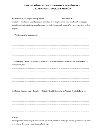 WSTĘPNE OŚWIADCZENIE JEDNOSTEK BRANŻOWYCH O ZAPEWNIENIU DOSTAWY MEDIÓW Oświadczam, że projektowany obiekt ................................ na działce nr. .................................. może być zasilany z sieci będącej własnością przedsiębiorstwa oraz możliwe będzie jego przyłączenie do sieci (przy zachowaniu ew. niżej podanych warunków) oraz możliwy będzie dojazd. 1. Wodociągi oświadczają, że: .................................................................................................................................................. .................................................................................................................................................. .................................................................................................................................................. .................................................................................................................................................. .................................................................................................................................................. .................................................................................................................................................. 2. Rejonowy Zakład Gazowniczy Tarnów – Rozdzielnia Gazu Gromnik ul. Zakładowa 12 oświadcza, że:: .................................................................................................................................................. .................................................................................................................................................. .................................................................................................................................................. .................................................................................................................................................. .................................................................................................................................................. .................................................................................................................................................. 3. Zakład Energetyczny Tarnów – Oddział Sieci i Rozwoju ul. Wodna 6, oświadcza, że: .................................................................................................................................................. .................................................................................................................................................. .................................................................................................................................................. .................................................................................................................................................. .................................................................................................................................................. .................................................................................................................................................. Uwaga: Po uzyskaniu stosownych oświadczeń inwestor powinien dołączyć niniejszy druk do wniosku o wydanie decyzji o warunkach zabudowy.