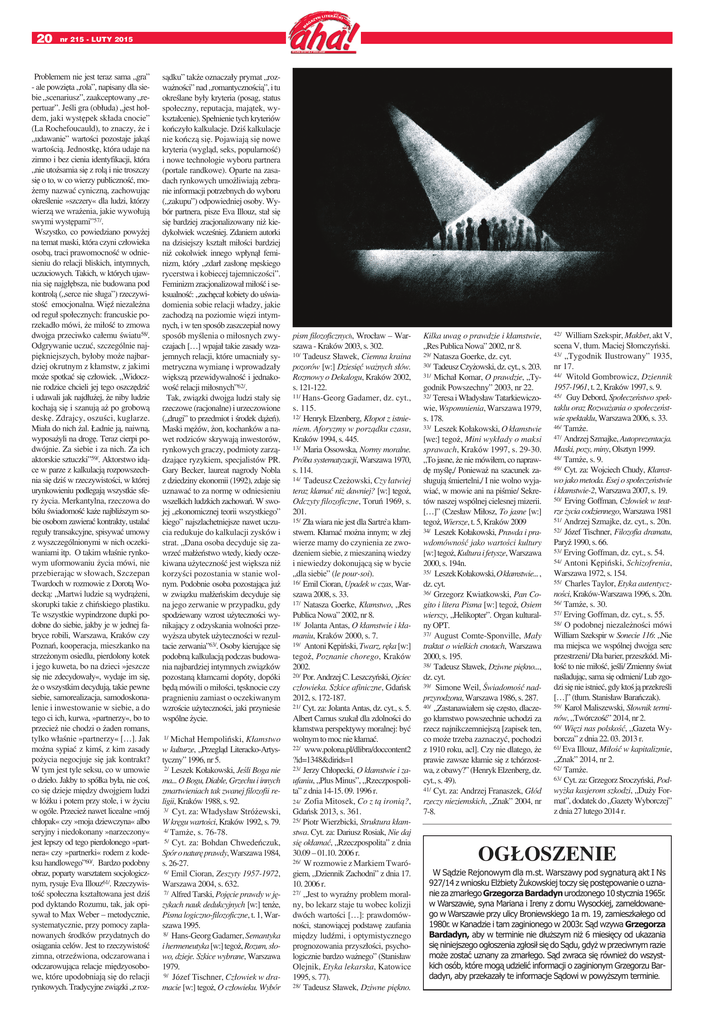 20 nr 215 - LUTY 2015 Problemem nie jest teraz sama „gra” - ale powzięta „rola”, napisany dla siebie „scenariusz”, zaakceptowany „repertuar”. Jeśli gra (obłuda) „jest hołdem, jaki występek składa cnocie” (La Rochefoucauld), to znaczy, że i „udawanie” wartości pozostaje jakąś wartością. Jednostkę, która udaje na zimno i bez cienia identyfikacji, która „nie utożsamia się z rolą i nie troszczy się o to, w co wierzy publiczność, możemy nazwać cyniczną, zachowując określenie »szczery« dla ludzi, którzy wierzą we wrażenia, jakie wywołują swymi występami”57/. Wszystko, co powiedziano powyżej na temat maski, która czyni człowieka osobą, traci prawomocność w odniesieniu do relacji bliskich, intymnych, uczuciowych. Takich, w których ujawnia się najgłębsza, nie budowana pod kontrolą („serce nie sługa”) rzeczywistość emocjonalna. Więź niezależna od reguł społecznych: francuskie porzekadło mówi, że miłość to zmowa dwojga przeciwko całemu światu58/. Odgrywanie uczuć, szczególnie najpiękniejszych, byłoby może najbardziej okrutnym z kłamstw, z jakimi może spotkać się człowiek. „Widocznie rodzice chcieli jej tego oszczędzić i udawali jak najdłużej, że niby ludzie kochają się i szanują aż po grobową deskę. Zdrajcy, oszuści, kuglarze. Miała do nich żal. Ładnie ją, naiwną, wyposażyli na drogę. Teraz cierpi podwójnie. Za siebie i za nich. Za ich aktorskie sztuczki”59/. Aktorstwo idące w parze z kalkulacją rozpowszechnia się dziś w rzeczywistości, w której urynkowieniu podlegają wszystkie sfery życia. Merkantylna, rzeczowa do bólu świadomość każe najbliższym sobie osobom zawierać kontrakty, ustalać reguły transakcyjne, spisywać umowy z wyszczególnionymi w nich oczekiwaniami itp. O takim właśnie rynkowym uformowaniu życia mówi, nie przebierając w słowach, Szczepan Twardoch w rozmowie z Dorotą Wodecką: „Martwi ludzie są wydrążeni, skorupki takie z chińskiego plastiku. Te wszystkie wypindrzone dupki podobne do siebie, jakby je w jednej fabryce robili, Warszawa, Kraków czy Poznań, kooperacja, mieszkanko na strzeżonym osiedlu, pierdolony kotek i jego kuweta, bo na dzieci »jeszcze się nie zdecydowały«, wydaje im się, że o wszystkim decydują, takie pewne siebie, samorealizacja, samodoskonalenie i inwestowanie w siebie, a do tego ci ich, kurwa, »partnerzy«, bo to przecież nie chodzi o żaden romans, tylko właśnie »partnerzy« […]. Jak można sypiać z kimś, z kim zasady pożycia negocjuje się jak kontrakt? W tym jest tyle seksu, co w umowie o dzieło. Jakby to spółka była, nie coś, co się dzieje między dwojgiem ludzi w łóżku i potem przy stole, i w życiu w ogóle. Przecież nawet licealne »mój chłopak« czy »moja dziewczyna« albo seryjny i niedokonany »narzeczony« jest lepszy od tego pierdolonego »partnera« czy »partnerki« rodem z kodeksu handlowego”60/. Bardzo podobny obraz, poparty warsztatem socjologicznym, rysuje Eva Illouz61/. Rzeczywistość społeczna kształtowana jest dziś pod dyktando Rozumu, tak, jak opisywał to Max Weber – metodycznie, systematycznie, przy pomocy zaplanowanych środków przydatnych do osiągania celów. Jest to rzeczywistość zimna, otrzeźwiona, odczarowana i odczarowująca relacje międzyosobowe, które upodobniają się do relacji rynkowych. Tradycyjne związki „z roz- sądku” także oznaczały prymat „rozważności” nad „romantycznością”, i tu określane były kryteria (posag, status społeczny, reputacja, majątek, wykształcenie). Spełnienie tych kryteriów kończyło kalkulacje. Dziś kalkulacje nie kończą się. Pojawiają się nowe kryteria (wygląd, seks, popularność) i nowe technologie wyboru partnera (portale randkowe). Oparte na zasadach rynkowych umożliwiają zebranie informacji potrzebnych do wyboru („zakupu”) odpowiedniej osoby. Wybór partnera, pisze Eva Illouz, stał się się bardziej zracjonalizowany niż kiedykolwiek wcześniej. Zdaniem autorki na dzisiejszy kształt miłości bardziej niż cokolwiek innego wpłynął feminizm, który „zdarł zasłonę męskiego rycerstwa i kobiecej tajemniczości”. Feminizm zracjonalizował miłość i seksualność: „zachęcał kobiety do uświadomienia sobie relacji władzy, jakie zachodzą na poziomie więzi intymnych, i w ten sposób zaszczepiał nowy sposób myślenia o miłosnych zwyczajach […] wpajał takie zasady wzajemnych relacji, które umacniały symetryczna wymianę i wprowadzały większą przewidywalność i jednakowość relacji miłosnych”62/. Tak, związki dwojga ludzi stały się rzeczowe (racjonalne) i urzeczowione („drugi” to przedmiot i środek dążeń). Maski mężów, żon, kochanków a nawet rodziców skrywają inwestorów, rynkowych graczy, podmioty zarządzające ryzykiem, specjalistów PR. Gary Becker, laureat nagrody Nobla z dziedziny ekonomii (1992), zdaje się uznawać to za normę w odniesieniu wszelkich ludzkich zachowań. W swojej „ekonomicznej teorii wszystkiego” kiego” najszlachetniejsze nawet uczucia redukuje do kalkulacji zysków i strat. „Dana osoba decyduje się zawrzeć małżeństwo wtedy, kiedy oczekiwana użyteczność jest większa niż korzyści pozostania w stanie wolnym. Podobnie osoba pozostająca już w związku małżeńskim decyduje się na jego zerwanie w przypadku, gdy spodziewany wzrost użyteczności wynikający z odzyskania wolności przewyższa ubytek użyteczności w rezultacie zerwania”63/. Osoby kierujące się podobną kalkulacją podczas budowania najbardziej intymnych związków pozostaną kłamcami dopóty, dopóki będą mówili o miłości, tęsknocie czy pragnieniu zamiast o oczekiwanym wzroście użyteczności, jaki przyniesie wspólne życie. Michał Hempoliński, Kłamstwo w kulturze, „Przegląd Literacko-Artystyczny” 1996, nr 5. 2/ Leszek Kołakowski, Jeśli Boga nie ma... O Bogu, Diable, Grzechu i innych zm