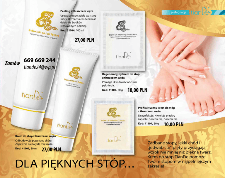 Peeling z tłuszczem węża pielęgnacja Usuwa zrogowaciała warstwę skóry. Wzmacnia skuteczność działania środków stosowanych później. Kod: 31104, 100 ml 27,00 PLN Regeneracyjny krem do stóp Pomaga likwidować odciski i pęknięcia. Kod: 41103, 30 g 10,00 PLN Dezynfekuje. Niweluje przykry zapach i pocenie się, pocenie się. Kod: 41104, 30 g 10,00 PLN Krem do stóp z tłuszczem węża Odbudowuje popękaną skórę. Zapewnia niezwykłą miękkość. Kod: 41101, 80 ml 27,00 PLN DLA PIĘKNYCH STÓP… Zadbane stopy, lekki chód i „jedwabiste” pięty przyciągają wzrok nie mniej niż piękna twarz. Krem do stóp TianDe pomoże Twoim stopom w najpełniejszym zakresie!