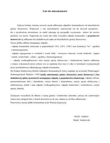 List do mieszkańców Upływa kolejny miesiąc nowych zasad odbierania odpadów komunalnych od mieszkańców gminy Stoszowice. Większość z nas mieszkańców zastosowała się do nowych przepisów, ale z przykrością stwierdzam, że nadal zdarzają się przypadki wyrzucania śmieci do rowów, potoków czy lasów. Naprawdę nie warto tak robić wszystkie odpady komunalne z gospodarstw domowych są odbierane bez dodatkowych opłat od mieszkańców gminy Stoszowice. Nasza spółka odbiera następujące odpady: - odpady komunalne zmieszane w pojemnikach 110 l, 120 l, 1100 l oraz kontenery 7m3 - zgodnie z harmonogramem - odpady segregowane w workach ( worek żółty - tworzywa sztuczne, worek niebieski - papier i metal, worek biały - szkło) - zgodnie z harmonogramem - odpady wielkogabarytowe oraz zużyty sprzęt elektryczny i elektroniczny będzie odbierany z miejsc wskazanych przez sołtysa wsi co najmniej dwa razy w roku w terminach wyznaczonych przez przedsiębiorcę odbierającego odpady komunalne. Do Punktu Selektywnej Zbiórki Odpadów Komunalnych, który znajduje się na terenie Wodociągów Srebrnogórskich Budzów 178D każdy mieszkaniec gminy Stoszowice może dostarczyć i bez dodatkowej opłaty pozostawić następujące odpady z gospodarstwa domowego: odpady zielone, przeterminowane leki i chemikalia, zużyte baterie i akumulatory, zużyty sprzęt elektryczny i elektroniczny, meble i inne odpady wielkogabarytowe, odpady budowlane i rozbiórkowe, zużyte opony, ubrania. Zachęcam wszystkich do dbania o naszą gminę i środowisko naturalne, proszę nie zostawiajcie śmieci przy drogach lub w lasach dowieźcie je do nas, chętnie je od Was odbierzemy. Pracownicy naszej spółki komunalnej są do Waszej dyspozycji. WÓJT GMINY Marek Janikowski