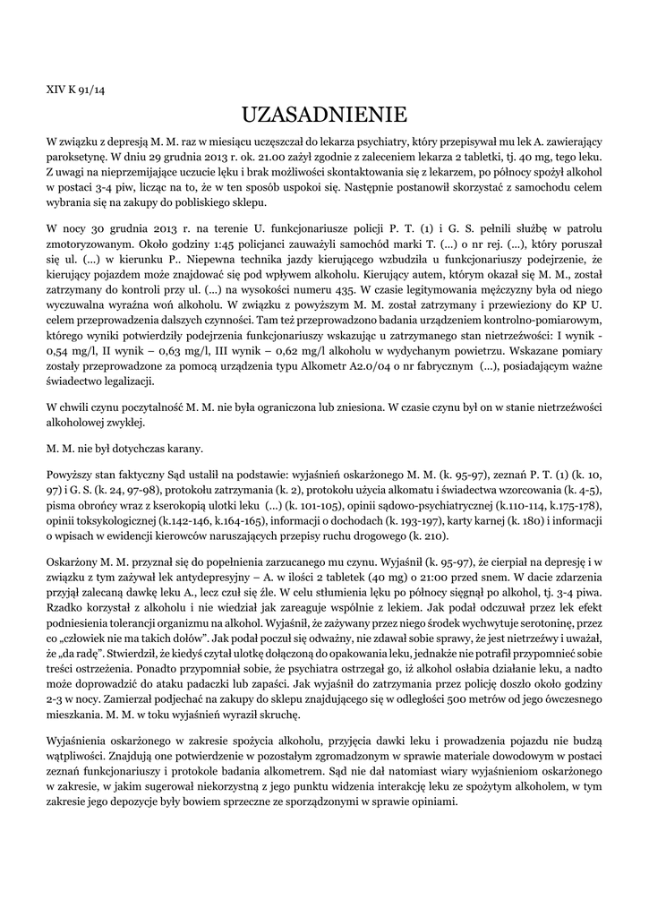 XIV K 91/14 UZASADNIENIE W związku z depresją M. M. raz w miesiącu uczęszczał do lekarza psychiatry, który przepisywał mu lek A. zawierający paroksetynę. W dniu 29 grudnia 2013 r. ok. 21.00 zażył zgodnie z zaleceniem lekarza 2 tabletki, tj. 40 mg, tego leku. Z uwagi na nieprzemijające uczucie lęku i brak możliwości skontaktowania się z lekarzem, po północy spożył alkohol w postaci 3-4 piw, licząc na to, że w ten sposób uspokoi się. Następnie postanowił skorzystać z samochodu celem wybrania się na zakupy do pobliskiego sklepu. W nocy 30 grudnia 2013 r. na terenie U. funkcjonariusze policji P. T. (1) i G. S. pełnili służbę w patrolu zmotoryzowanym. Około godziny 1:45 policjanci zauważyli samochód marki T. (...) o nr rej. (...), który poruszał się ul. (...) w kierunku P.. Niepewna technika jazdy kierującego wzbudziła u funkcjonariuszy podejrzenie, że kierujący pojazdem może znajdować się pod wpływem alkoholu. Kierujący autem, którym okazał się M. M., został zatrzymany do kontroli przy ul. (...) na wysokości numeru 435. W czasie legitymowania mężczyzny była od niego wyczuwalna wyraźna woń alkoholu. W związku z powyższym M. M. został zatrzymany i przewieziony do KP U. celem przeprowadzenia dalszych czynności. Tam też przeprowadzono badania urządzeniem kontrolno-pomiarowym, którego wyniki potwierdziły podejrzenia funkcjonariuszy wskazując u zatrzymanego stan nietrzeźwości: I wynik 0,54 mg/l, II wynik – 0,63 mg/l, III wynik – 0,62 mg/l alkoholu w wydychanym powietrzu. Wskazane pomiary zostały przeprowadzone za pomocą urządzenia typu Alkometr A2.0/04 o nr fabrycznym (...), posiadającym ważne świadectwo legalizacji. W chwili czynu poczytalność M. M. nie była ograniczona lub zniesiona. W czasie czynu był on w stanie nietrzeźwości alkoholowej zwykłej. M. M. nie był dotychczas karany. Powyższy stan faktyczny Sąd ustalił na podstawie: wyjaśnień oskarżonego M. M. (k. 95-97), zeznań P. T. (1) (k. 10, 97) i G. S. (k. 24, 97-98), protokołu zatrzymania (k. 2), protokołu użycia alkomatu i świadectwa wzorcowania (k. 4-5), pisma obrońcy wraz z kserokopią ulotki leku (...) (k. 101-105), opinii sądowo-psychiatrycznej (k.110-114, k.175-178), opinii toksykologicznej (k.142-146, k.164-165), informacji o dochodach (k. 193-197), karty karnej (k. 180) i informacji o wpisach w ewidencji kierowców naruszających przepisy ruchu drogowego (k. 210). Oskarżony M. M. przyznał się do popełnienia zarzucanego mu czynu. Wyjaśnił (k. 95-97), że cierpiał na depresję i w związku z tym zażywał lek antydepresyjny – A. w ilości 2 tabletek (40 mg) o 21:00 przed snem. W dacie zdarzenia przyjął zalecaną dawkę leku A., lecz czuł się źle. W celu stłumienia lęku po północy sięgnął po alkohol, tj. 3-4 piwa. Rzadko korzystał z alkoholu i nie wiedział jak zareaguje wspólnie z lekiem. Jak podał odczuwał przez lek efekt podniesienia tolerancji organizmu na alkohol. Wyjaśnił, że zażywany przez niego środek wychwytuje serotoninę, przez co „człowiek nie ma takich dołów”. Jak podał poczuł się odważny, nie zdawał sobie sprawy, że jest nietrzeźwy i uważał, że „da radę”. Stwierdził, że kiedyś czytał ulotkę dołączoną do opakowania leku, jednakże nie potrafił przypomnieć sobie treści ostrzeżenia. Ponadto przypomniał sobie, że psychiatra ostrzegał go, iż alkohol osłabia działanie leku, a nadto może doprowadzić do ataku padaczki lub zapaści. Jak wyjaśnił do zatrzymania przez policję doszło około godziny 2-3 w nocy. Zamierzał podjechać na zakupy do sklepu znajdującego się w odległości 500 metrów od jego ówczesnego mieszkania. M. M. w toku wyjaśnień wyraził skruchę. Wyjaśnienia oskarżonego w zakresie spożycia alkoholu, przyjęcia dawki leku i prowadzenia pojazdu nie budzą wątpliwości. Znajdują one potwierdzenie w pozostałym zgromadzonym w sprawie materiale dowodowym w postaci zeznań funkcjonariuszy i protokole badania alkometrem. Sąd nie dał natomiast wiary wyjaśnieniom oskarżonego w zakresie, w jakim sugerował niekorzystną z jego punktu widzenia interakcję leku ze spożytym alkoholem, w tym zakresie jego depozycje były bowiem sprzeczne ze sporządzonymi w sprawie opiniami. Nie budziły zastrzeżeń zeznania funkcjonariuszy policji sierż. szt. P. T. (2) (k. 10, 97) oraz st. post. G. S. (k. 24, 97-98), którzy z przedmiotową sprawą mieli wyłącznie służbowy kontakt. Zeznania te są wyważone i spójne, tworząc logiczną całość, znajdują także odzwierciedlenie w treści innych dowodów. Sąd dał w całości wiarę sporządzonej w sprawie opinii sądowo-psychiatrycznej (k.110-114, 175-178) i opinii toksykologicznej (k.142-146, k.164-165). W ocenie Sądu obie opinie są one wyczerpujące, jasne i bezsprzeczne, zostały sporządzone przez uprawnionych biegłych, posiadających potrzebne wiadomości specjalne, w sposób w pełni rzetelny i profesjonalny. Opinie te nie były kwestionowane przez strony. Sąd zważył, co następuje: Wina oskarżonego i okoliczności popełnienia zarzucanego mu czynu nie budzą wątpliwości. Sam oskarżony przyznał się do popełnienia zarzucanego mu czynu i nie kwestionował wyników badań na zawartość alkoholu w wydychanym powietrzu. Oskarżony wyjaśnił, że wypił alkohol po północy w postaci 3 – 4 piw. Jak wynika z treści protokołu badania trzeźwości (k.4) oskarżony nie żądał przeprowadzenia badania krwi, nie zgłaszał również uwag co do prawidłowości zabezpieczenia ustnika alkomatu. Jak wynika z zeznań udzielonych przez biorących udział w zdarzeniu funkcjonariuszy policji sierż. szt. P. T. (1) (k. 10, 97) oraz st. post. G. S. (k. 24, 97-98) w dniu z 29/30 grudnia 2013 r. pełnili wspólnie służbę radiowozem oznakowanym. Około godziny 1:45 jadąc ul. (...) uwagę policjantów zwrócił poruszający się ul. (...) w kierunku P. pojazd marki T. (...) o nr rej. (...). Kie