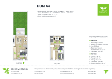 DOM A4 POWIERZCHNIA MIESZKANIA: 74,53 m2 Ogród o powierzchni: 45,17 m2 Liczba miejsc postojowych: 2 Wykaz pomieszczeń: 7 PARTER 6 4 10 9 2 3 1. Wiatrołap: 2,93 m2 2. Klatka schodowa: 2,67 m2 3. Hol: 3,50 m2 4. Salon z aneksem kuchennym: 27,22 m2 5. Łazienka: 3,27 m2 PIĘTRO 5 6. Pokój: 7,66 m2 7. Pokój: 7,96 m2 8. Pokój: 11,27 m2 9. Łazienka: 3,85 m2 10. Komunikacja: 4,20 m2 8 1 PARTER PIĘTRO Niniejsza karta nie stanowi oferty w rozumieniu przepisów Kodeksu Cywilnego i ma charakter poglądowy. ul. Starołęcka 57d [email protected] 616 698 567 www.tefrahouse.pl 61-361 Poznań www.zielonekamionki.pl 616 698 568 N Sp. z o.o. Sp. k.