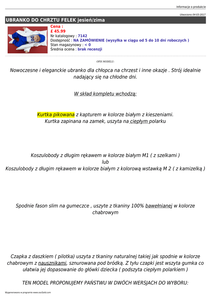 Informacje o produkcie Utworzono 04-03-2017 UBRANKO DO CHRZTU FELEK jesień/zima Cena : £ 45.99 Nr katalogowy : 7142 Dostępność : NA ZAMÓWIENIE (wysyłka w ciągu od 5 do 10 dni roboczych ) Stan magazynowy : < 0 Średnia ocena : brak recenzji OPIS MODELU: Nowoczesne i eleganckie ubranko dla chłopca na chrzest i inne okazje . Strój idealnie nadający się na chłodne dni. W skład kompletu wchodzą: Kurtka pikowana z kapturem w kolorze białym z kieszeniami. Kurtka zapinana na zamek, uszyta na ciepłym polarku Koszulobody z długim rękawem w kolorze białym M1 ( z szelkami ) lub Koszulobody z długim rękawem w kolorze białym z kolorową wstawką M 2 ( z kamizelką ) Spodnie fason slim na gumeczce , uszyte z tkaniny 100% bawełnianej w kolorze chabrowym Czapka z daszkiem ( pilotka) uszyta z tkaniny naturalnej takiej jak spodnie w kolorze chabrowym z nausznikami, sznurowana pod bródką. Z tyłu czapki jest wszyta gumka co ułatwia jej dopasowanie do główki dziecka ( podszyta ciepłym polarkiem ) TEN MODEL PROPONUJEMY PAŃSTWU W DWÓCH WERSJACH DO WYBORU: Wygenerowano w programie www.oscGold.com 1 Z efektownymi szelkami w kolorową kratkę z zapięciami wykonanymi ze skóry naturalnej w kolorze brązowym LUB 2 Z kamizelką akrylową w kolorze białym Proszę napisać w komentarzu do zamówienia którą wersję Państwo wybieracie !!! PO ZAKUPIE PROSZĘ NAPISAĆ JAKI MODEL PAŃSWO WYBIERAJĄ Do kompletu należy mucha jak na zdjęciu i podpinka polarowa pod spodnie. Całość ubranka uszyta z wysokiej jakości materiałów Rozmiary: 1. roz.62 (2-4 m) 2. roz.68 (4-6 m) 3. roz.74 (6-10m) 4. roz.80 (10-16m) 5. roz.86 (16-22m) 6. roz.92 (2-2,5 latka) Przed zakupem proszę nas poinformować o rozmiarze ubranka oraz spytać o termin realizacji !!! Dostępne opcje UBRANKO DO CHRZTU FELEK jesień/zima » ROZMIAR: roz. 62, roz. 68, roz. 74, roz. 80, roz. 86, roz. 92.