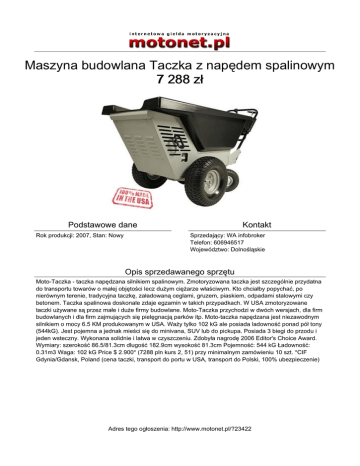 Maszyna budowlana Taczka z napędem spalinowym 7 288 zł Podstawowe dane Rok produkcji: 2007, Stan: Nowy Kontakt Sprzedający: WA infobroker Telefon: 606946517 Województwo: Dolnośląskie Opis sprzedawanego sprzętu Moto-Taczka - taczka napędzana silnikiem spalinowym. Zmotoryzowana taczka jest szczególnie przydatna do transportu towarów o małej objętości lecz dużym ciężarze właściwym. Kto chciałby popychać, po nierównym terenie, tradycyjna taczkę, załadowaną ceglami, gruzem, piaskiem, odpadami stalowymi czy betonem. Taczka spalinowa doskonale zdaje egzamin w takich przypadkach. W USA zmotoryzowane taczki używane są przez małe i duże firmy budowlane. Moto-Taczka przychodzi w dwóch wersjach, dla firm budowlanych i dla firm zajmujących się pielęgnacją parków itp. Moto-taczka napędzana jest niezawodnym silnikiem o mocy 6.5 KM produkowanym w USA. Waży tylko 102 kG ale posiada ladowność ponad pół tony (544kG). Jest pojemna a jednak mieści się do minivana, SUV lub do pickupa. Posiada 3 biegi do przodu i jeden wsteczny. Wykonana solidnie i latwa w czyszczeniu. Zdobyła nagrodę 2006 Editor's Choice Award. Wymiary: szerokość 86.5/81.3cm dlugość 182.9cm wysokość 81.3cm Pojemność: 544 kG Ładowność: 0.31m3 Waga: 102 kG Price $ 2.900* (7288 pln kurs 2, 51) przy minimalnym zamówieniu 10 szt. *CIF Gdynia/Gdansk, Poland (cena taczki, transport do portu w USA, transport do Polski, 100% ubezpieczenie) Adres tego ogłoszenia: http://www.motonet.pl/?23422