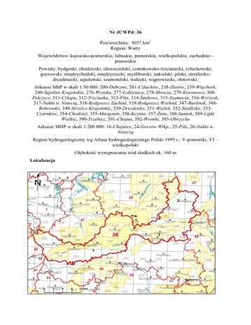 Nr JCWPd: 36 Powierzchnia: 5037 km2 Region: Warty Województwo: kujawsko-pomorskie, lubuskie, pomorskie, wielkopolskie, zachodnio pomorskie Powiaty: bydgoski. chodzieski, choszczeński, czarnkowsko-trzcianecki, człuchowski, gorzowski, międzychodzki, międzyrzecki, myśliborski, nakielski, pilski, strzeleckodrezdenecki, sępoleński, szamotulski, wałecki, wągrowiecki, złotowski, Arkusze MhP w skali 1:50 000: 200-Debrzno, 201-Człuchów, 238-Złotów, 239-Więcbork, 240-Sępólno Krajeńskie, 276-Wysoka, 277-ŁobŜenica, 278-Mrocza, 279-Koronowo, 308Pełczyce, 311-Człopa, 312-Trzcianka, 313-Piła, 314-Śmiłowo, 315-Szamocin, 316-Wyrzysk, 317-Nakło n. Notecią, 318-Bydgoszcz Zachód, 319-Bydgoszcz Wschód, 347-Barlinek, 348Bobrówko, 349-Strzelce Krajeńskie, 350-Drezdenko, 351-Wieleń, 352-Siedlisko, 353Czarnków, 354-ChodzieŜ, 355-Margonin, 356-Kcynia, 357-śnin, 388-Santok, 389-Lipki Wielkie, 390-Trzebicz, 391-Chojno, 392-Wronki, 393-Obrzycko Arkusze MHP w skali 1:200 000: 16-Chojnice, 24-Gorzów Wlkp., 25-Piła, 26-Nakło n. Notecią Region hydrogeologiczny wg Atlasu hydrogeologicznego Polski 1995 r.: V-pomorski, VI – wielkopolski Głębokość występowania wód słodkich ok. 160 m Lokalizacja Profile m n.p.m. 2 150 100 Q 1 50 Q 0 M -50 M -100 Cr -150 - warstwy wodonośne - warstwy słabo przepuszczalne Symbol całej JCWPd uwzględniający wszystkie profile: Q, M Opis symbolu: W utworach czwartorzędowych występuje jeden poziom wodonośny związany głównie z pradoliną toruńsko-eberswaldzką. Poziom mioceński stanowi jedna warstwa wodonośna dobrze izolowana od poziomu czwartorzędowego. Q – wody porowe w utworach piaszczystych M - wody porowe w utworach piaszczystych Cecha szczególna JCWPd: brak GZWP występujące w obrębie JCWPd: 125 - Qm, 127 - Tr, 133 – Qm, 138 - Qp, 139 - Qk