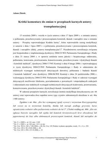 e-Czasopismo Prawa Karnego i Nauk Penalnych 3/2011 Adam Złotek Krótki komentarz do zmian w przepisach karnych ustawy transplantacyjnej 15 września 2009 r. weszła w życie ustawa z dnia 17 lipca 2009 r. o zmianie ustawy o pobieraniu, przechowywaniu i przeszczepianiu komórek, tkanek i narządów oraz o zmianie ustawy – Przepisy wprowadzające Kodeks karny 1, która wprowadziła szereg modyfikacji w ustawie z dnia 1 lipca 2005 r. o pobieraniu, przechowywaniu i przeszczepianiu komórek, tkanek i narządów (dalej „ustawa transplantacyjna”) 2. Przedmiotowa nowelizacja związana jest bezpośrednio z implementacją dyrektywy 2004/23/WE Parlamentu Europejskiego i Rady z dnia 31 marca 2004 r. w sprawie ustalenia norm jakości i bezpiecznego oddawania, pobierania, testowania, przetwarzania, konserwowania, przechowywania i dystrybucji tkanek i komórek ludzkich 3, dyrektywy 2006/17/WE Komisji z dnia 8 lutego 2006 r. wprowadzającej w życie dyrektywę 2004/23/WE Parlamentu Europejskiego i Rady w odniesieniu do niektórych wymagań technicznych dotyczących dawstwa, pobierania i badania tkanek i komórek ludzkich 4 oraz dyrektywy 2006/86/WE Komisji z dnia 24 października 2006 r. wykonującej dyrektywę 2004/23/WE Parlamentu Europejskiego i Rady w zakresie wymagań dotyczących możliwości śledzenia, powiadamiania o poważnych i niepożądanych reakcjach i zdarzeniach oraz niektórych wymagań technicznych dotyczących kodowania, przetwarzania, konserwowania, przechowywania i dystrybucji tkanek i komórek ludzkich 5. W zakresie przepisów karnych, nowelizacja istotnie modyfikuje dotychczasowy art. 44 ustawy oraz wprowadza dwa zupełnie nowe typy czynów zabronionych określone w art. 46a i 46b ustawy. Zgodnie z art. 46a: „Kto bez wymaganej zgody wywozi z terytorium Rzeczypospolitej lub wwozi na to terytorium komórkę, tkankę lub narząd, podlega grzywnie, karze ograniczenia wolności albo pozbawienia wolności do lat 3”. Z kolei według art. 46b: „Kto nie zgłasza biorców narządów lub szpiku lub komórek krwiotwórczych krwi obwodowej lub pępowinowej do listy albo dokonanych przeszczepień komórek, tkanek lub narządów do 1 Dz. U. z 2009 r., nr 141, poz. 1149 Dz. U. z 2005 r., nr 169, poz. 1411 ze zm. 3 Dz. Urz. WE L 102 z 7.04.2004, s. 48; Dz. Urz. UE Polskie wydanie specjalne, rozdz. 15, t. 8, s. 291 4 Dz. Urz. UE L 38 z 9.02.2006, s. 40 5 Dz. Urz. UE L 294 z 25.10.2006, s. 32 2 Artykuł ze strony e-Czasopisma Prawa Karnego i Nauk Penalnych http://www.czpk.pl 1 e-Czasopismo Prawa Karnego i Nauk Penalnych 3/2011 rejestru przeszczepień albo pozyskanych potencjalnych dawców szpiku lub komórek krwiotwórczych krwi obwodowej do rejestru szpiku i krwi pępowinowej, podlega grzywnie albo karze ograniczenia wolności”. Interpretacja obu przepisów nie budzi większych wątpliwości. Art. 46a jest bezpośrednio związany z regulacjami zawartymi w art. 37a ustawy transplantacyjnej. Zgodnie z tym przepisem podmiotami uprawnionymi do wywozu lub przywozu komórek, tkanek i narządów, w zależności od ich rodzaju oraz pochodzenia (od żywego dawcy lub ze zwłok ludzkich), są zakłady opieki zdrowotnej lub banki tkanek i komórek. Transport do kraju i za granicę może zostać dokonany tylko za zgodą odpowiednio dyrektora Centrum Organizacyjno – Koordynacyjnego do Spraw Transplantacji „Poltransplant” lub dyrektora Krajowego Centrum Bankowania Tkanek i Komórek. Organem odwoławczym od decyzji obu dyrektorów jest minister właściwy do spraw zdrowia. Odpowiedzialność karna z art. 46a ustawy transplantacyjnej wchodzi w grę w sytuacji, gdy wywozu oraz przywozu komórek, tkanek i narządów dokonuje podmiot w ogóle nie uprawniony do tego typu czynności albo gdy co prawda jest on uprawniony, ale nie posiada odpowiedniej zgody na transport. Art. 46b wymienia trzy alternatywne formy popełnienia czynu zabronionego przejawiające się jako: a) brak zgłoszenia biorców narządów lub szpiku lub komórek krwiotwórczych krwi obwodowej lub pępowinowej do listy b) brak zgłoszenia dokonanych przeszczepów do rejestru przeszczepień c) brak zgłoszenia potencjalnych dawców szpiku lub komórek krwiotwórczych krwi obwodowej do rejestru szpiku i krwi pępowinowej W pkt a chodzi o listę, o której mowa w art. 17 ustawy transplantacyjnej. Jest to lista zawierająca spis osób oczekujących na przeszczep szpiku, komórek lub narządów. Podmiotem prowadzącym listę jest, zgodnie z art. 17 ust. 7, Centrum Organizacyjno – Koordynacyjne do Spraw Transplantacji „Poltransplant”. Osobą odpowiedzialną za zgłoszenie biorcy na listę jest lekarz kierujący zespołem lekarskim działającym w ramach tzw. ośrodka kwalifikującego (patrz art. 17a ust. 1 w zw. z art. 17a ust. 4 w zw. z art. 17 ust. 2 ustawy). Tego typu ośrodki działają wyłącznie przy zakładach opieki zdrowotnej dokonujących przeszczepów. Rejestr przeszczepień (pkt b) zawiera dane na temat przebiegu dokonanego już przeszczepu oraz dane personalne biorcy. Służy do celów monitorowania dokonanych transplantacji (patrz art. 18 ustawy transplantacyjnej). Podmiotem zobligowanym do Artykuł ze strony e-Czasopisma Prawa Karnego i Nauk Penalnych http://www.czpk.pl 2 e-Czasopismo Prawa Karnego i Nauk Penalnych 3/2011 przekazania odpowiednich informacji jest zakład opieki zdrowotnej, który sprawuje aktualnie opiekę nad biorcą przeszczepu. Rejestr szpiku i krwi pępowinowej (pkt c) jest bazą danych na temat potencjalnych dawców allogenicznego szpiku, komórek krwiotwórczych krwi obwodowej i pępowinowej (patrz art. 16 ust. 1a ustawy). Obowiązek przekazywania danych do powyższego rejestru spoczywa na zakładach opieki zdrowotnej oraz na fundacjach, które uzyskały pozwolenia ministra właściwego do spraw zdrowia, aby prowadzić czynności polegające na pozyskiwaniu potencjalnych dawców. Podmioty uprawnione do tego typu działalności zostały określone w ustawie jako „ośrodki dawców szpiku” (pat