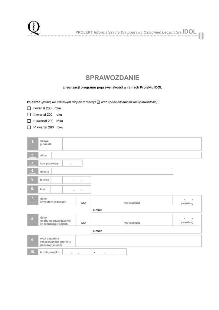 PROJEKT Informatyzacja Dla poprawy Osiągnięć Lecznictwa IDOL SPRAWOZDANIE z realizacji programu poprawy jakości w ramach Projektu IDOL za okres (proszę we właściwym miejscu zaznaczyć oraz wpisać odpowiedni rok sprawozdania): I kwartał 200 roku II kwartał 200 roku III kwartał 200 roku IV kwartał 200 roku 1. nazwa jednostki 2. ulica 3. kod pocztowy 4. miasto 5. telefon - - 6. faks - - 7. dane Dyrektora jednostki - (tytuł) - (imię i nazwisko) (nr telefonu) (imię i nazwisko) (nr telefonu) e-mail: 8. dane osoby odpowiedzialnej za realizację Projektu (tytuł) e-mail: 9. 10. tytuł aktualnie realizowanego projektu poprawy jakości termin projektu . . - . . - 11. etapy projektu realizowane w danym kwartale 12. etapy projektu planowane na kolejny kwartał 13. , czas zakończenia 1. 1. . . 2. 2. . . 3. 3. . . 4. 4. . . 5. 5. . . 6. 6. . . 7. 7. . . planowany termin zakończenia projektu . . załączniki: szczegółowy harmonogram projektu skład zespołu projektowego analiza problemu (w tym: określenie danych, źródeł, narzędzi, ocena wstępna, propozycja rozwiązania) diagram przyczynowo - skutkowy schemat blokowy dane dotyczące wdroŜenia projektu i jego monitorowania ocena projektu (analiza danych, wnioski) opracowanie projektu w wersji końcowej prezentacja wyników w programie Power Point W przypadku, gdy realizacja projektu dobiega końca proszę o wpisanie poniŜej tytułu i terminu kolejnego projektu: 14. tytuł planowanego projektu poprawy jakości 15. termin projektu . . - . . sprawozdanie przygotował: (imię i nazwisko) , . . miejsce i data sporządzenia sprawozdania (dd.mm.rrrr) .................................................................... (podpis i pieczęć Dyrektora jednostki) Jednak jeśli realizacja programu poprawy jakości w ramach Projektu IDOL dobiega końca, a nie są Państwo zainteresowani dalszym udziałem w Projekcie, proszę do sprawozdania dołączyć następujące oświadczenie: pieczęć jednostki ...................................................... miejsce i data (dd.mm.rrrr) Oświadczenie Oświadczam, iŜ .................................................................................................................................................. ........................................ ................................................................................................................. (nazwai adres jednostki) NIE jest zainteresowana dalszym udziałem w realizacji Projektu IDOL i deklaruje zwrot uŜyczonego w ramach tego Projektu sprzętu. .................................................................... (podpis i pieczęć Dyrektora jednostki)