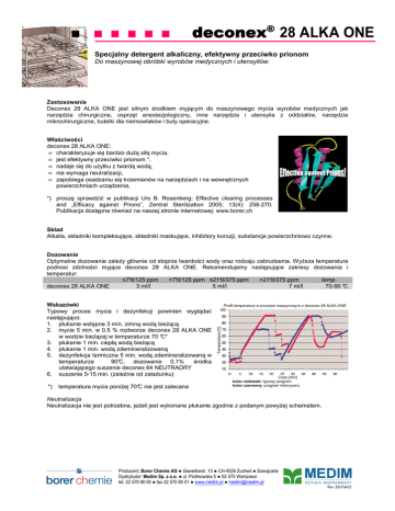 ■ ■ ■ ■ ■ ■ deconex® 28 ALKA ONE Specjalny detergent alkaliczny, efektywny przeciwko prionom Do maszynowej obróbki wyrobów medycznych i utensyliów. Zastosowanie Deconex 28 ALKA ONE jest silnym środkiem myjącym do maszynowego mycia wyrobów medycznych jak narzędzia chirurgiczne, osprzęt anestezjologiczny, inne narzędzia i utensylia z oddziałów, narzędzia mikrochirurgiczne, butelki dla niemowlaków i buty operacyjne. Właściwości deconex 28 ALKA ONE: • charakteryzuje się bardzo duŜą siłą mycia, • jest efektywny przeciwko prionom *, • nadaje się do uŜytku z twardą wodą, • nie wymaga neutralizacji, • zapobiega osadzaniu się krzemianów na narzędziach i na wewnętrznych powierzchniach urządzenia, *) proszę sprawdzić w publikacji Urs B. Rosenberg: Effective clearing processes and „Efficacy against Prions”, Zentral Sterilization 2005; 13(4): 258-270. Publikacja dostępna równieŜ na naszej stronie internetowej: www.borer,ch Skład Alkalia, składniki kompleksujące, składniki maskujące, inhibitory korozji, substancje powierzchniowo czynne. Dozowanie Optymalne dozowanie zaleŜy głównie od stopnia twardości wody oraz rodzaju zabrudzenia. WyŜsza temperatura podnosi zdolności myjące deconex 28 ALKA ONE. Rekomendujemy następujące zakresy dozowania i temperatur: ≤7°d/125 ppm >7°d/125 ppm ≤21°d/375 ppm >21°d/375 ppm temp. deconex 28 ALKA ONE 3 ml/l 5 ml/l 7 ml/l 70-90 °C *) temperatura mycia poniŜej 70°C nie jest zalecana Profil temperatury w procesie maszynowym z deconex 28 ALKA ONE Temperatura [°C] Wskazówki Typowy proces mycia i dezynfekcji powinien wyglądać następująco: 1. płukanie wstępne 3 min. zimną wodą bieŜącą 2. mycie 5 min. w 0.5 % roztworze deconex 28 ALKA ONE w wodzie bieŜącej w temperaturze 70 °C* 3. płukanie 1 min. ciepłą wodą bieŜącą 4. płukanie 1 min. wodą zdemineralizowaną 5. dezynfekcja termiczna 5 min. wodą zdemineralizowaną w temperaturze 90°C, dozowanie 0,1% środka ułatwiającego suszenie deconex 64 NEUTRADRY 6. suszenie 5-15 min. (zaleŜnie od załadunku) Czas [min] kolor niebieski: typowy program kolor czerwony: program intensywny Neutralizacja Neutralizacja nie jest potrzebna, jeŜeli jest wykonane płukanie zgodnie z podanym powyŜej schematem. Producent: Borer Chemie AG ● Gewerbestr. 13 ● CH-4528 Zuchwil ● Szwajcaria Dystrybutor: Medim Sp. z o.o. ● ul. Piotrkowska 5 ● 02-375 Warszawa tel. 22 570 90 00 ● fax 22 570 90 01 ● www.medim.pl ● [email protected] Rev. 2007/04/23 ■ ■ ■ ■ ■ ■ deconex® 28 ALKA ONE Kompatybilność materiałowa deconex 28 ALKA ONE moŜna stosować do: stali nierdzewnej, materiałów chromowanych, materiałów syntetycznych, gumy, lateksu, szkła i ceramiki. deconex 28 ALKA ONE nie naleŜy stosować do: kontenerów sterylizacyjnych i ich pokryw wykonanych z anodyzowanego aluminium. Do kontenerów powinny być uŜywane neutralne środki myjące, jak np. deconex TWIN BASIC lub deconex 23 NEUTRAZYM. Inne przedmioty z anodyzowanego aluminium powinny być sprawdzone na kompatybilność materiałową. NaleŜy zwrócić szczególną uwagę na informacje dotyczące sposobu obróbki wyrobów medycznych dostarczonych przez ich producenta (stosownie do wymogów EN ISO 17664). Dane fizyko-chemiczne pH gęstość wygląd 1 % roztwór w wodzie demi koncentrat koncentrat około 12.0 1.40 g/ml przezroczysty do lekko mętnego, bezbarwny do lekko Ŝółtawego Dostępność Proszę pytać lokalnego dystrybutora o dostępne wielkości opakowań. Pojemniki, zakrętki i etykiety są wykonane z polietylenu podlegającemu recyklingowi. Dodatkowe informacje Informacje dotyczące bezpieczeństwa pracy, przechowywania, usuwania odpadów znajdują się w karcie charakterystyki substancji niebezpiecznej. Proszę skorzystać z naszego know-how ! Proszę się z nami skontaktować, aby zastosować nasze produkty do Państwa specyficznych zastosowań. Wszystkie powyŜsze informacje są oparte na naszej aktualnej wiedzy i nie mogą stanowić zabezpieczenia specyficznych właściwości produktu. Producent: Borer Chemie AG ● Gewerbestr. 13 ● CH-4528 Zuchwil ● Szwajcaria Dystrybutor: Medim Sp. z o.o. ● ul. Piotrkowska 5 ● 02-375 Warszawa tel. 22 570 90 00 ● fax 22 570 90 01 ● www.medim.pl ● [email protected] Rev. 2007/04/23