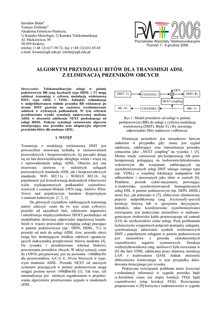 Jarosław Bułat1) Tomasz Zieliński2) Akademia Górniczo-Hutnicza, 1) Katedra Metrologii, 2) Katedra Telekomunikacji Al. Mickiewicza 30 30-059 Kraków telefon: (+48 12) 617-39-72, fax: (+48 12) 633-85-65 e-mail: [email protected], [email protected] 2006 Poznańskie Warsztaty Telekomunikacyjne Poznań 7 - 8 grudnia 2006 ALGORYTM PRZYDZIAŁU BITÓW DLA TRANSMISJI ADSL Z ELIMINACJĄ PRZENIKÓW OBCYCH Streszczenie: Telekomunikacyjne usługi w paśmie podstawowym BB (ang. baseband) typu HDSL i T1 mogą zakłócać transmisję z cyfrową modulacją wielotonową DMT, typu ADSL i VDSL. Jednakże redundancja w nadpróbkowanym widmie przeniku BB widzianym po stronie DMT pozwala na częściowe wyeliminowanie zakłóceń w wybranych podkanałach. W tym referacie przedstawiono wyniki symulacji numerycznej modemu ADSL w obecności zakłócenia NEXT pochodzącego od usługi HDSL. Podczas symulacji zastosowano algorytm zmniejszający moc przeniku oraz adaptacyjny algorytm przydziału bitów dla modemu ADSL. 1. WSTĘP Transmisja z modulacją wielotonową DMT jest powszechnie stosowaną techniką w zastosowaniach przewodowych i bezprzewodowych. Jej początki datują się na lata dziewięćdziesiąte ubiegłego wieku i wiążą się z wprowadzeniem usługi ADSL. Obecnie jest ona stosowana zarówno w niektórych usługach przewodowych standardu xDSL jak i bezprzewodowych standardu: WiFi 802.11a i WiMAX 802.16. Jej popularność jest konsekwencją doskonałych właściwości wielu wąskopasmowych podkanałów częstotliwościowych z szumem bliskim AWN (ang. Additive White Noise) nad pojedynczym kanałem dyspersyjnym z szumem kolorowym. [1, 2, 3]. Do głównych czynników zakłócających transmisję należy zaliczyć: szum tła (w tym szum cyfrowy), przeniki od sąsiednich linii, zakłócenia impulsowe i interferencje międzysymbolowe ISI/ICI pochodzące od niedokładnie skróconej odpowiedzi impulsowej kanału. Jeżeli w wiązce przewodów występują usługi pracujące w paśmie podstawowym (np.: ISDN, HDSL, T1) to przeniki od nich do usługi ADSL (tzw. przeniki obce) mogą być dominującym źródłem zakłóceń ograniczających maksymalną przepływność bitową modemu [4]. Na rysunku 1 przedstawiono schemat blokowy powstawania przeników obcych. W takiej sytuacji, szum tła (AWN) przyjmowany jest na poziomie -140dBm/Hz dla przetworników A/C/A 8...10-cio bitowych w typowym modemie ADSL. Przeniki NEXT od starszych systemów pracujących w paśmie podstawowym mogą osiągać poziom nawet -100dBm/Hz [1]. Tak więc, ich minimalizacja jest istotnym zagadnieniem w projektowaniu algorytmów przetwarzania sygnału w modemach xDSL. Rys 1. Model przeników od usługi w paśmie podstawowym (BB) do usługi z cyfrową modulacją wielotonową (DMT). Bloki Tx i Rx zawierają odpowiednio filtry nadawcze i odbiorcze. Eliminacja przeników jest stosunkowo łatwym zadaniem w przypadku gdy: znany jest sygnał zakłócany, zakłócający oraz transmitancja przeniku oznaczona jako ,,NEXT coupling'' na rysunku 1 [5]. Można wtedy zastosować pre-kompensację lub postkompensację polegającą na kodowaniu/dekodowaniu wektorowym dla wzajemnie zakłócających się zsynchronizowanych usług DMT takiego samego typu (np. VDSL) o wspólnej lokalizacji nadajników lub odbiorników i sterowanych jako zbiór w centrali [6]. Podobnie, przenik cyklo-stacjonarny powstający w środowisku synchronizowanych homogenicznych usług DSL w paśmie podstawowym (np. ISDN, HDSL) może być, jak pokazano w [7], efektywnie eliminowany poprzez nadpróbkowaną (ang. fractionally-spaced) korekcję liniową lub w sprzężeniu decyzyjnym. Jednakże, takie koordynowane (synchronizowane) rozwiązanie jest praktycznie niemożliwe w niehomogenicznym środowisku kabla przenoszącego od centrali (CO) do użytkowników różne usługi. Poza problemami technicznymi wzajemnych połączeń pomiędzy usługami, synchronizacja taktowania symboli wielotonowych DMT z popularnymi usługami w paśmie podstawowym jest niemożliwa z powodu niekoherentnych częstotliwości zegarów systemowych. Detekcja wieloużytkownikowa (ang. multiuser) była rozważana w [8] dla linii VDSL zakłócanej przez domową instalację LAN z kodowaniem QAM. Jednak złożoność obliczeniowa koniecznego w tym przypadku dekodowania iteracyjnego jest wysoka. Praktyczne rozwiązanie problemu może korzystać z redundancji informacji w sygnale przeniku bądź w dziedzinie czasu (na etapie korekcji TEQ) bądź częstotliwości (etap korekcji FEQ). Rozwiązanie proponowane w [9] korzysta z nadmiarowości w sygnale przeniku obecnego w odbiorniku DMT w dwóch postaciach: sygnału wspólnego i różnicowego. Układ eliminacji przeniku estymuje sygnał zakłócający z sygnału wspólnego i eliminuje go w sygnale różnicowym w dziedzinie czasu z użyciem adaptacyjnej struktury FIR. Wadą takiego podejścia jest konieczność pomiaru sygnału wspólnego. Alternatywne podejście częstotliwościowe, korzystające z nadmiarowości szumu resztowego podkanałów DMT po elemencie decyzyjnym, zostało przedstawione w [10]. W tym szumie znajduje się interesujący nas sygnał zawierający wynik dyskretnej transformaty Furiera wielu wolniej taktowanych pulsów BB przeniesionych przez transmitancję przeniku i nałożonych na symbol (ramkę) DMT. Jeżeli te zakłócenia przenikowe są nadpróbkowane, jak to ma miejsce w przypadku usług HDSL i ISDN zakłócających system ADSL lub usługi T1 zakłócającej system VDSL to przenik w podkanałach DMT odpowiadających pasmu nadmiarowemu BB (ang. excess band) będzie skorelowany z przenikiem w podkanałach odpowiadających pasmu podstawowemu BB. Ogólna idea wykorzystania zjawiska korelacji szumu resztkowego w budowie eliminatora przeniku jest pokazana na rysunku 2 (sugerujemy [1, 2] jako opis struktury odbiornika DMT). Rys 2. Struktura eliminatora przeniku opartego na korelacji szumu resztkowego. Wąska strzałka reprezentuje możliwe dostrajanie sterowane skoryg