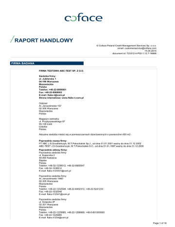 RAPORT HANDLOWY © Coface Poland Credit Management Services Sp. z o.o. email: [email protected] 14.04.2015 document id: 723312-4-P02-1.12.7-16666 FIRMA BADANA FIRMA TESTOWA ABC-TEST SP. Z O.O. Siedziba firmy: ul. Jubilerska 1 04-190 Warszawa Mazowieckie Polska Telefon: +48-22-0000001 Fax: +48-22-0000002 E-mail: [email protected] Strona internetowa: www.ftabc-t.com.pl Oddział: Al. Jerozolimskie 157 02-305 Warszawa Mazowieckie Polska Magazyn centralny: ul. Przybyszewskiego 97 93-126 Łódź Łódzkie Polska Aktualna siedziba mieści się w pomieszczeniach dzierżawionych o powierzchni 450 m2 Poprzednie nazwy firmy: FT ABC J.S.Grzebieńczyk, M.T.Pokochalski Sp.J., od dnia 01.01.2001 ważny do dnia 31.12.2002 ABC-TEST J.S.Grzebieńczyk, M.T.Pokochalski S.C., od dnia 01.01.1997 ważny do dnia 31.12.2000 Poprzednie adresy firmy: Poprzednia siedziba firmy: ul. Kopernika 2 40-064 Katowice Śląskie Polska Telefon: +48-32-1238512, +48-32-5665547 Fax: +48-32-1238512 E-mail: [email protected] Poprzednia siedziba firmy: Al. Jerozolimskie 159D 02-305 Warszawa Mazowieckie Polska Telefon: +48-22-1232548, +48-22-8452312, +48-22-5241233 Fax: +48-22-1232548 E-mail: [email protected] Poprzednia siedziba firmy: ul. Grójecka 2F 02-301 Warszawa Mazowieckie Polska Telefon: +48-22-1225685, +48-22-1288989, +48-0-601000000 Fax: +48-22-1225685 E-mail: [email protected] Page 1 of 16 Numer ICON: 83784290 NIP: 1111111111 REGON: 000000000 Status rejestrowy: 01.01.2003 - forma prawna firmy została zmieniona Status działalności: 01.01.1997 - firma aktywna Data ostatniego badania: 10.03.2015 OCENA ZDOLNOŚCI KREDYTOWEJ Niewypłacalność: Informacje o toczącym się postępowaniu związanym z niewypłacalnością firmy badanej. 22.10.2005 - Dłużnik złożył wniosek o otwarcie postępowania upadłościowego Data postanowienia sądu: 22.10.2005 Sygnatura akt: X GU 198/05 Sąd: Sąd Rejonowy Warszawa 25.10.2005 - Wycofano wniosek o otwarcie postępowania upadłościowego (umorzenie wobec cofnięcia) Data postanowienia sądu: 25.10.2005 Sygnatura akt: X GU 198/08 Sąd: Sąd Rejonowy Warszawa Kredyt maksymalny: EUR 2.500.000,00 (PLN 10.049.000,00) Kredyt maksymalny powinien być rozumiany jako najwyższa możliwa wartość kredytu kupieckiego, jaki może zostać udzielony firmie badanej przez jednego dostawcę towarów lub usług na okres średnio do 60 dni, przy założeniu, że firma badana posiada średnio pięciu dostawców, dostarczających towary lub świadczących usługi w tym samym czasie. Ocena firmy: @rating: 6 - Dopuszczalny poziom ryzyka Proces upadłościowy w toku 0 Wysoki Poziom Ryzyka Średni Poziom Ryzyka 1 4 2 3 5 Niski Poziom Ryzyka 6 7 8 9 10 ▲ Ocena firmy przedstawiana jest jako @rating zawierający się w przedziale od 0 (oznaczającego niewypłacalność firmy badanej) do 10 (wskazującego na minimalne ryzyko w kontaktach z tą firmą). @rating określa prawdopodobieństwo utraty wypłacalności firmy badanej w ciągu kolejnych 12 miesięcy. Page 2 of 16 Historia @rating-u: Ocena płatności: Płatności najczęściej regulowane zgodnie z ustalonymi warunkami. Komentarz do oceny firmy: Firma badana została zakwalifikowana do grupy dużych przedsiębiorstw. W roku 31.03.2015 firma osiągnęła przychód w wysokości PLN 106.209.000 Doświadczenia windykacyjne Firma badana nie była windykowana przez Coface Poland Credit Management Services Sp. z o.o. . WIERZYTELNOŚCI NA SPRZEDAŻ: Na dzień 2015-03-12 na listach Giełd Wierzytelności sprawdzanych przez Coface Poland Credit Management Services Sp. z o.o. występowały przeterminowane zobowiązania firmy badanej na łączną kwotę: PLN 3180,2 DANE REJESTROWE Rok założenia: 1997 Rejestracja: Nr KRS 0000022345 01.01.2003 Sąd Rejonowy Warszawa, Polska Mazowieckie Poprzednia rejestracja: Nr KRS 0000001234 01.01.2001 Sąd Rejonowy Katowice, Polska Nr 1234, 1235 01.01.1997 Urząd Miasta Katowice, Polska Forma prawna: 01.01.2003 spółka z ograniczoną odpowiedzialnością Poprzednia forma prawna: spółka jawna od dnia: 01.01.2001 spółka cywilna od dnia: 01.01.1997 Page 3 of 16 Kapitał: Kapitał podstawowy: PLN 50.000,00 od dnia 01.01.2004 Liczba Udziały: 1.000 Wartość udziału Udziały: PLN 50,00 Zmiana z: Struktura własności: Poprzednia struktura własności: PLN 25.000,00 od dnia 01.01.2003 Imię i nazwisko Funkcja Adres ABC-TEST-KLIENT Sp. z o.o. Rejestracja: Nr KRS 0000152489, 23.02.2003, Sąd Rejonowy Warszawa, Polska Udziałowiec 02.02.2004 Aktualny ul. Zielona 12 01-950 Warszawa Polska POKOCHALSKI Marcin Teodor Udziałowiec 10.02.2003 Aktualny Udział PLN 25.000,00 PLN 25.000,00 Imię i nazwisko Funkcja Adres Udział Przedsiębiorstwo Handlowo-Usługowe ABC-TEST 1 S.A. Rejestracja: Nr KRS 0000021212, 08.03.2007, Sąd Rejonowy Warszawa, Polska Poprzedni udziałowiec 01.01.2003 - 02.02.2004 (w wyniku wykreślenia z rejestru handlowego (lub ewidencji działalności gospodarczej)) ul. PLN Poprzeczna 20.000,00 25 04-603 Warszawa Mazowieckie Polska GRZEBIEŃCZYK Janina Sabina Poprzedni udziałowiec 01.01.2003 - 10.02.2003 (w wyniku wykreślenia z rejestru handlowego (lub ewidencji działalności gospodarczej)) PLN 5.000,00 GRZEBIEŃCZYK Janina Sabina Poprzedni wspólnik 01.01.1997 - 31.12.2002 (z powodu zmiany formy prawnej) POKOCHALSKI Marcin Teodor Kierownictwo firmy: Poprzedni wspólnik 01.01.1997 - 31.12.2002 (z powodu zmiany formy prawnej) Imię i nazwisko Funkcja GRZEBIEŃCZYK Janina Sabina Dyrektor Zarządzający POKOCHALSKI Marcin Teodor 10.02.2003 - Aktualny Prezes Zarządu NOWACZEWSKI Wacław Marian 01.01.2009 - Aktualny Wiceprezes Zarządu SZEINDER Marek 01.01.2009 - Aktualny Członek Zarządu SŁOMKA Irena Martyna 01.01.2009 - Aktualny Członek Zarządu Adres Page 4 of 16 Poprzednie kierownictwo: Funkcje pełnione w innych firmach: Imię i nazwisko Funkcja GRZEBIEŃCZYK Janina Sabina 01.01.1997 - 31.12.2002 (z powodu zmiany formy prawnej) Poprzedni Dyrektor Zarządzający GRZEBIEŃCZYK Janina Sabina 01.01.2003 - 10.02.2003