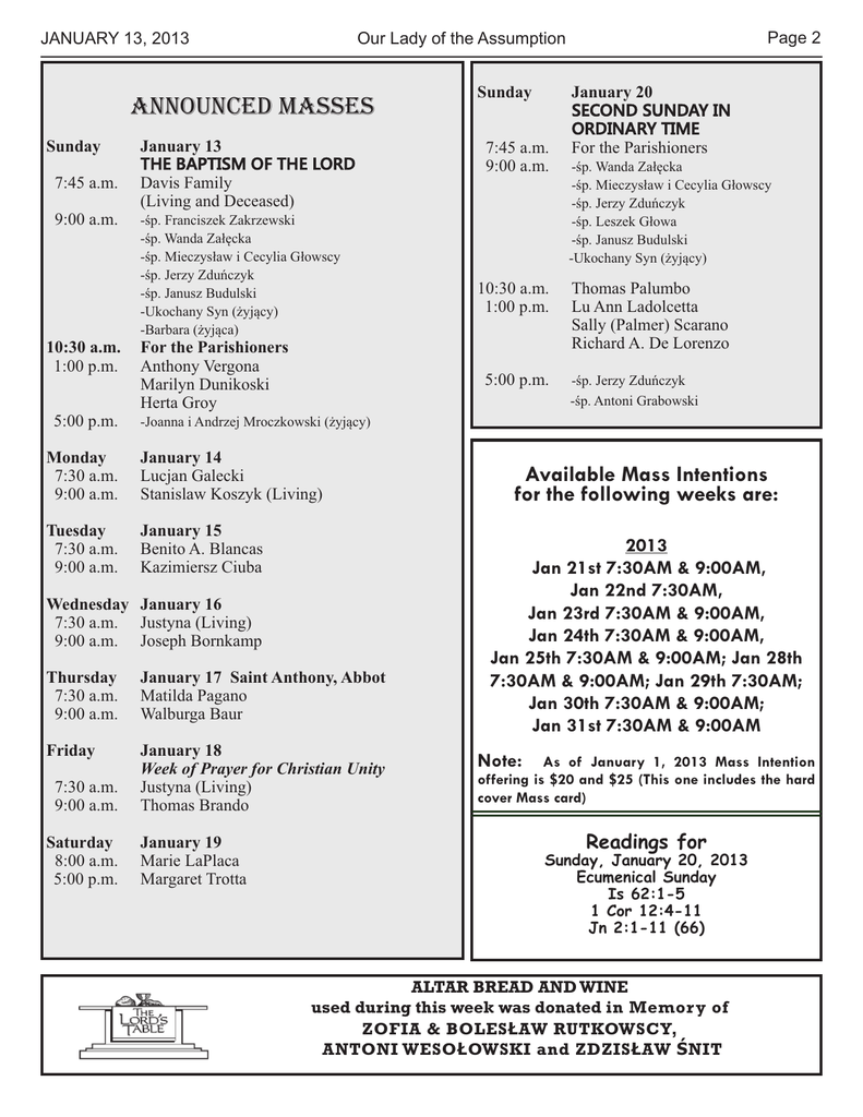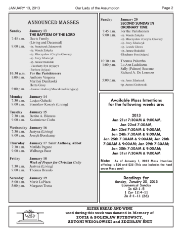 JANUARY 13, 2013 Sunday 7:45 a.m. 9:00 a.m. 10:30 a.m. 1:00 p.m. 5:00 p.m. Monday 7:30 a.m. 9:00 a.m. ANNOUNCED MASSES January 13 THE BAPTISM OF THE LORD Davis Family (Living and Deceased) -śp. Franciszek Zakrzewski -śp. Wanda Załęcka -śp. Mieczysław i Cecylia Głowscy -śp. Jerzy Zduńczyk -śp. Janusz Budulski -Ukochany Syn (żyjący) -Barbara (żyjąca) For the Parishioners Anthony Vergona Marilyn Dunikoski Herta Groy January 14 Lucjan Galecki Stanislaw Koszyk (Living) Thursday 7:30 a.m. 9:00 a.m. January 17 Saint Anthony, Abbot Matilda Pagano Walburga Baur Wednesday January 16 7:30 a.m. Justyna (Living) 9:00 a.m. Joseph Bornkamp Saturday 8:00 a.m. 5:00 p.m. 7:45 a.m. 9:00 a.m. 10:30 a.m. 1:00 p.m. -Joanna i Andrzej Mroczkowski (żyjący) January 15 Benito A. Blancas Kazimiersz Ciuba 7:30 a.m. 9:00 a.m. Sunday 5:00 p.m. Tuesday 7:30 a.m. 9:00 a.m. Friday January 18 Week of Prayer for Christian Unity Justyna (Living) Thomas Brando January 19 Marie LaPlaca Margaret Trotta Page 2 Our Lady of the Assumption January 20 SECOND SUNDAY IN ORDINARY TIME For the Parishioners -śp. Wanda Załęcka -śp. Mieczysław i Cecylia Głowscy -śp. Jerzy Zduńczyk -śp. Leszek Głowa -śp. Janusz Budulski -Ukochany Syn (żyjący) Thomas Palumbo Lu Ann Ladolcetta Sally (Palmer) Scarano Richard A. De Lorenzo -śp. Jerzy Zduńczyk -śp. Antoni Grabowski Available Mass Intentions for the following weeks are: 2013 Jan 21st 7:30AM & 9:00AM, Jan 22nd 7:30AM, Jan 23rd 7:30AM & 9:00AM, Jan 24th 7:30AM & 9:00AM, Jan 25th 7:30AM & 9:00AM; Jan 28th 7:30AM & 9:00AM; Jan 29th 7:30AM; Jan 30th 7:30AM & 9:00AM; Jan 31st 7:30AM & 9:00AM Note: As of January 1, 2013 Mass Intention offering is $20 and $25 (This one includes the hard cover Mass card) Readings for Sunday, January 20, 2013 Ecumenical Sunday Is 62:1-5 1 Cor 12:4-11 Jn 2:1-11 (66) ALTAR BREAD AND WINE used during this week was donated in Memor y of ZOFIA & BOLESŁAW RUTKOWSCY, ANTONI WESOŁOWSKI and ZDZISŁAW ŚNIT JANUARY 13, 2013 Sacrificial Giving Our Lady of the Assumption Parish Financial Summary Week of January 6,2013 Weekly Budget $10,000 Collection $11,269 +/- $10,000 +$ 1,269 Year to date +$ 1,269 Mass Attendance 2516 Same week last year $10,366 Christmas to date $27,694 New Year’s Day $ 5,995 Please remember in your prayers parishioners who are sick, especially: Brianna Fitzpatrick, Ruth DiBernardi, Richard Besemer, Rosa M. Fuentes, Carmella Hufnagel, Luisaury Collado, Josephine Giarraffa, , Paul Steiger, Paulene Del Prete, Tina Giarraffa, Joseph O’Shea, Sr. Mary Pia, O.S.B., Luis Collado, Dominic Szczech, Tina Giarraffa, Geraldine Necco, Zoila Quezada, Buddy Catropa, Meghan Roach, and Mary Finey. COPIAGUE FIRE DEPARTMENT Winter Wishes Blood Drive Monday, January 21, 2013 3:30pm-9:30pm 320 Great Neck Rd, Copiague PROTECTING GOD’S CHILDREN VIRTUS TRAINING for OLA Volunteers, will be offered on January 24, 2013, in the Outreach Building Room from 6:45pm - 9:45pm. Register on-line at www.drvc.org Virtus On-line. Please contact Pam Fitzgerald at (516) 551-2494 for more information. As a reminder, all NEW parish volunteers must have a background screening check. Forms are available in the Rectory Office. National Vocation Awareness Week January 13-19, 2013 “National Vocation Awareness Week will be celebrated in our country January 13-19, 2013. Please ask Our Lord for more dedicated, holy priests, deacons and consecrated men and women. May they be inspired by Jesus Christ, supported by our faith community, and respond generously to God’s gift of a vocation.” RELIGIOUS EDUCATION Page 3 EIGHTH GRADE RETREAT The 8th grade retreat is Saturday, January 19, 2013. The children will meet here at OLA at 9:00am for departure to the Missionary Sisters of St. Benedicts in Huntington. Please be advised that you must be here ON TIME. The buses will be returning to OLA at approximately 3:30pm. Make sure you have someone to meet you here for pickup. TEACHERS NEEDED...The 2012-2013 Religious Education program is still looking for volunteers to help teach. While we still need teachers for all grades, we have an URGENT need for a 5th, 6th and 7th grade teacher. If you are interested in sharing your faith, please contact Lou Mocci, Religious Education Director, at (631) 842-3545. SCHOOL IS IN SESSION Due to hurricane Sandy, the Copiague and Lindenhurst school districts will both have classes during winter recess in February 2013. Religious Education classes will also be open the week of February 19th-21st. Our next Family Mass is Sunday, January 27, 2013, at 10:30AM, in the Church FAMILY MASS ADULT VOLUNTEERS We are looking for adults to help with hospitality once a month after Family Mass. In addition, we are also looking for volunteers to donate either store bought or home baked goods for these family masses. If you are interested in volunteering either your time or baking talents, please contact Dcn. Phil at 631-842-5211 ext 29. Lou Mocci, Director REST IN PEACE: We extend sympathy to the family of Rocco Joseph Peretta, Marguerite Tetro and Donna Borish. May the souls of all the faithful departed rest in peace. AMEN. JANUARY 13, 2013 Our Lady of the Assumption Celebrating the Sacraments Baptism First, Second and Third Saturday of every month (English, Spanish and Polish respectively) , at 12:00pm. Pre-registration is required at least two months before baptism. There is a required Baptismal Preparation Class which is going to be scheduled by the priest or deacon. Please contact the Rectory before hand. Matrimony Please make an appointment with one of our Priests or Deacons at least six months prior to your wedding date and before finalizing reception plans. Confession Saturdays from 4:00pm to 4:45pm in the Church. You may also make an appointment with one of our Priests. Communion for the Homebound Please call the Rectory to arrange a visit for one of our Priests, Deacons or Eucharist Ministers. Anointing of the Sick First Saturday of every month after the 