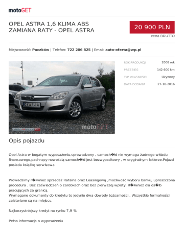 OPEL ASTRA 1,6 KLIMA ABS ZAMIANA RATY - OPEL ASTRA 20 900 PLN cena BRUTTO Miejscowość: Paczków | Telefon: 722 206 825 | Email: [email protected] 2008 rok 142 600 km Używany 27-10-2016 Opis pojazdu Opel Astra w bogatym wyposażeniu,sprowadzony , samoch�łd nie wymaga żadnego wkładu finansowego,pachnący nowością samoch�łd jest bezwypadkowy , w oryginalnym lakierze.Pojazd posiada książkę serwisowa Prowadzimy r�łwnież sprzedaż Ratalna oraz Leasingową ,możliwość wyboru banku, uproszczona procedura . Bez zaświadczeń o zarobkach oraz bez pierwszej wpłaty. R�łwnież dla os�łb pracujących za granicą. Wymagane dokumenty do kredytu to jedynie dwa dowody tożsamości . Wszystkie formalności załatwiane są na miejscu. Najkorzystniejszy kredyt na rynku 7,9 % Pełna informacja o wyposażeniu Marka: Opel Astra Ilość drzwi 5 Ilość miejsc: 5 Wariant wyposażenia: Cosmo Model: 2008 Data pierwszej rejestracji: 10.01.2008 Rok Produkcji 2007 Silnik: 1,6 Rodzaj paliwa: Benzyna Rodzaj skrz,biegow: Manualna (5) Standard emisji CO2: EU4 Przebieg: 142000 km Lakier: Srebrny metalik Kolor wnętrza Czarny Ilość kluczyk�łw: 2 Tapicerka: Materiał Najważniejsze elementy wyposażenia Klimatyzacja automatyczna klimatronic Elektryczne 4 szyby Lakier metalik Tempomat Alufelgi 17 Czujnik zmierzchu oraz deszczu Wyposażenie dodatkowe ABS Komputer pokładowy Centralny zamek Kierownica wielofunkcyjna 8 poduszek Centralny podłokietnik Centralny zamek z pilotem w kluczyku Kontrola stabilności (ESP) Czujnik deszczu Podana cena jest ceną brutto. Wystawiam F.VAT-marża Informacje dotyczące samochodu. Tel. 722 206 825 Informacje dotyczące kredytu lub Leasingu Tel. 660 467 212 - bezwypadkowy - garażowany - serwisowany - kierownica wielofunkcyjna - czujnik deszczu - ESP - ABS - alarm - alufelgi - centr. zamek - el. lusterka - el. szyby - immobiliser - klimatyzacja automatyczna - komputer - poduszki - radio z CD - wsp. kierownicy - tempomat