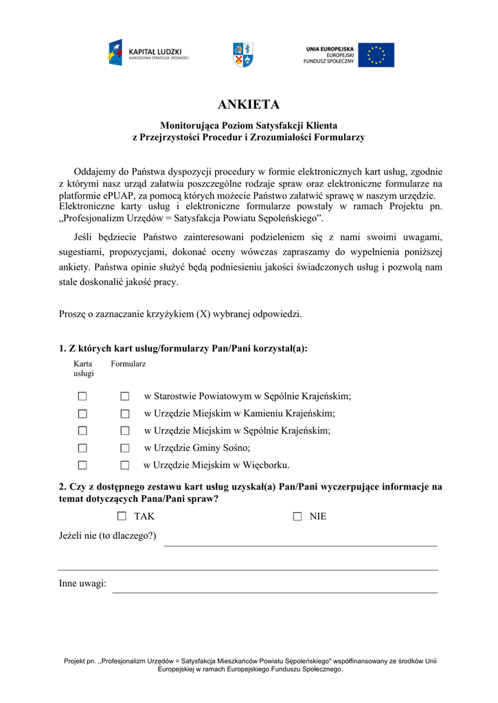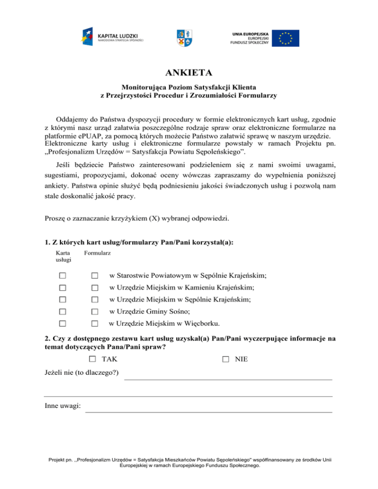 ANKIETA Monitorująca Poziom Satysfakcji Klienta z Przejrzystości Procedur i Zrozumiałości Formularzy Oddajemy do Państwa dyspozycji procedury w formie elektronicznych kart usług, zgodnie z którymi nasz urząd załatwia poszczególne rodzaje spraw oraz elektroniczne formularze na platformie ePUAP, za pomocą których możecie Państwo załatwić sprawę w naszym urzędzie. Elektroniczne karty usług i elektroniczne formularze powstały w ramach Projektu pn. „Profesjonalizm Urzędów = Satysfakcja Powiatu Sępoleńskiego”. Jeśli będziecie Państwo zainteresowani podzieleniem się z nami swoimi uwagami, sugestiami, propozycjami, dokonać oceny wówczas zapraszamy do wypełnienia poniższej ankiety. Państwa opinie służyć będą podniesieniu jakości świadczonych usług i pozwolą nam stale doskonalić jakość pracy. Proszę o zaznaczanie krzyżykiem (X) wybranej odpowiedzi. 1. Z których kart usług/formularzy Pan/Pani korzystał(a): Karta usługi Formularz w Starostwie Powiatowym w Sępólnie Krajeńskim; w Urzędzie Miejskim w Kamieniu Krajeńskim; w Urzędzie Miejskim w Sępólnie Krajeńskim; w Urzędzie Gminy Sośno; w Urzędzie Miejskim w Więcborku. 2. Czy z dostępnego zestawu kart usług uzyskał(a) Pan/Pani wyczerpujące informacje na temat dotyczących Pana/Pani spraw? TAK NIE Jeżeli nie (to dlaczego?) Inne uwagi: Projekt pn. ,,Profesjonalizm Urzędów = Satysfakcja Mieszkańców Powiatu Sępoleńskiego'' współfinansowany ze środków Unii Europejskiej w ramach Europejskiego Funduszu Społecznego. 3. Czy z karty usługi uzyskał(a) Pan/Pani wszystkie niezbędne informacje potrzebne Panu/Pani do załatwienia konkretnej sprawy? TAK NIE Której karty usługi dotyczy ocena: Jeżeli nie (to dlaczego?) Inne uwagi: 4. Czy wykorzystanie elektronicznego formularza dla załatwienia konkretnej sprawy sprawiło Panu/Pani jakieś problemy? TAK NIE Którego formularza dotyczy ocena: Jeżeli tak (to dlaczego?) Inne uwagi: 5. Czy formularz, z którego Pan/Pani korzystała był zbudowany czytelnie, zawierał jasno określone pola do wypełnienia? TAK NIE Którego formularza dotyczy ocena: Jeżeli nie (to dlaczego?) Inne uwagi: 6. Czy uważa Pan/Pani, że utworzone elektroniczne karty usług oraz elektroniczne formularze poprawiły jakość, czas i wygodę załatwianych spraw? TAK NIE Jeżeli nie (to dlaczego?) Inne uwagi: Projekt pn. ,,Profesjonalizm Urzędów = Satysfakcja Mieszkańców Powiatu Sępoleńskiego'' współfinansowany ze środków Unii Europejskiej w ramach Europejskiego Funduszu Społecznego. 7. Państwa ewentualne inne sugestie dotyczące funkcjonowania kart usług i formularzy: Serdecznie dziękujemy za wypełnienie ankiety. Ankietę można wydrukować i pozostawić w skrzynce przeznaczonej na ankiety, w Biurze Obsługi Klienta lub przesłać na adres: Starostwo Powiatowe w Sępólnie Krajeńskim ul. Kościuszki 11, 89-400 Sępólno Krajeńskie z dopiskiem: „BOK - ankieta” þÿ W y c z y [ þÿ D r u k u j Projekt pn. ,,Profesjonalizm Urzędów = Satysfakcja Mieszkańców Powiatu Sępoleńskiego'' współfinansowany ze środków Unii Europejskiej w ramach Europejskiego Funduszu Społecznego.