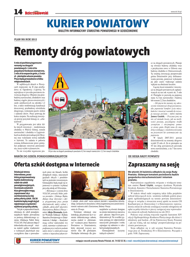 14 www.td-24.pl KURIER POWIATOWY BIULETYN INFORMACYJNY STAROSTWA POWIATOWEGO W DZIERŻONIOWIE PLAN NA ROK 2012 Remonty dróg powiatowych 5 mln zł pochłoną tegoroczne remonty na drogach powiatowych. 1 mln zł to pozyskane fundusze zewnętrzne, 1 mln zł to wsparcie gmin, a 3 mln zł - pieniądze własne powiatu. Prace będą prowadzone w kilku miejscowościach. W najbliższych dniach w Pieszycach rozpocznie się II etap przebudowy ul. Ogrodowej i Lipowej. To największa w tym roku powiatowa inwestycja drogowa. Obejmie ona przebudowę nawierzchni, chodników oraz budowę ciągów pieszo-rowerowych i zatok autobusowych na odcinku 1,2 km, a także modernizację kanalizacji deszczowej, przebudowę oświetlenia drogowego, wykonanie pasów zieleni i sadzenie drzew. Prace potrwają do końca sierpnia. Na realizację inwestycji powiat pozyskał dotację ze „schetynówek”. W przygotowaniu jest także kilka innych inwestycji – modernizacja chodnika w Piławie Górnej, remont nawierzchni i chodnika w Łagiewnikach na drodze prowadzącej do Olesznej oraz wykonanie nowej nakładki w Jaźwinie. Te zadania w połowie zostaną dofinansowane przez gminy. Już podpisano stosowne porozumienia, rusza wybór wykonawców. To nie wszystkie tegoroczne pra- W tym roku na drogach powiatowych powstanie 4,2 km nowych nawierzchni i 2,2 km nowych chodników ce na drogach powiatowych. Planuje się również budowę chodnika wraz z przykryciem rowu w Gilowie oraz budowę chodnika w Ostroszowicach. Tę ostatnią inwestycję przeprowadzi gmina Dzierżoniów przy dofinansowaniu powiatu, ponieważ wykonanie jej jako części większego zadania wpłynie na obniżenie kosztów. Łączny koszt remontów i inwestycji na drogach powiatowych zaplanowanych na ten rok wynosi ok. 5 mln zł. Pieniądze te pozwolą na poprawę stanu 4,2 km nawierzchni i budowę lub remont 2,2 km chodników. – Od pięciu lat staramy się sukcesywnie remontować drogi powiatowe, aby poprawiać komfort życia mieszkańców i stwarzać warunki do rozwoju naszego powiatu – mówi starosta Janusz Guzdek. – Przeznaczymy na ten cel niemałe kwoty, jak na możliwości powiatu, pozyskujemy środki zewnętrzne i otrzymujemy pomoc ze strony gmin. Dzięki temu zły stan dróg wynikający z niedoinwestowania na przestrzeni lat systematycznie się poprawia. W latach 2007-2011 powiat dzierżoniowski na remonty drogowe wydał 25 mln zł. Za te pieniądze na 55 km dróg powiatowych powstała nowa nawierzchnia, a na 7 km nowe chodniki. NABÓR DO SZKÓŁ PONADGIMNAZJALNYCH XX SESJA RADY POWIATU Oferta szkół dostępna w Internecie Zapraszamy na sesję Działa już strona internetowa, przez którą przeprowadzany będzie elektroniczny nabór do szkół ponadgimnazjalnych. Uczniowie ostatnich klas gimnazjów mogą zapoznawać się z zamieszczoną na niej pełną ofertą szkół. Od 30 kwietnia będą mogli się już rejestrować w systemie i wybierać przyszłą szkołę. Tak jak w poprzednich latach, rekrutacja do szkół ponadgimnazjalnych będzie prowadzona za pomocą elektronicznego systemu vEdukacja Nabór firmy VULCAN. Pod adresem https:// dolnoslaskie.edu.com.pl/ można znaleźć ogólne wiadomości o wybranych placówkach oraz szczegółowe dane o prowadzo- nych przez nie klasach, liczbie dostępnych miejsc, nauczanych językach obcych i przedmiotach na poziomie rozszerzonym. Gimnazjaliści będą mogli się rejestrować w systemie i wybierać przyszłą szkołę od 30 kwietnia. – Rekrutację w systemie firmy VULCAN prowadzi blisko połowa powiatów z Dolnego Śląska, dlatego chcąc skorzystać z oferty przygotowanej przez powiat dzierżoniowski, należy wybrać z zakładki „oferta szkół” placówki z Dzierżoniowa, Bielawy i Pieszyc – mówi Alicja Hromada, dyrektor Wydziału Edukacji i Kultury Starostwa Powiatowego w Dzierżoniowie. I dodaje: – Kandydaci mogą wybrać maksymalnie trzy szkoły, natomiast wydrukowane i podpisane przez rodziców podanie należy złożyć w szkole pierwszego wyboru w nieprzekraczalnym ter- KURIER POWIATOWY BIULETYN INFORMACYJNY STAROSTWA POWIATOWEGO W DZIERŻONIOWIE Z zakładki „oferta szkół” można wybierać placówki z województwa dolnośląskiego. Zachęcamy do skorzystania z oferty przygotowanej przez powiat dzierżoniowski i wybrania szkół z Dzierżoniowa, Bielawy i Pieszyc minie do 28 maja. Terminarz rekrutacji oraz instrukcję, jak poruszać się w systemie elektronicznego naboru, można znaleźć w „Informatorze” wydanym przez Starostwo Powiatowe w Dzierżoniowie, który otrzymali wszyscy uczniowie klas III gimnazjum. Niezbędne informacje dla gim- nazjalistów są również dostępne na stronie internetowej starostwa pod adresem http://www.pow. dzierzoniow.pl. Na wszelkie pytania pomogą też odpowiedzieć nauczyciele gimnazjum i osoby zajmujące się naborem w szkołach ponadgimnazjalnych. Gimnazjalistom życzymy trafnych wyborów! We wtorek 24 kwietnia odbędzie się sesja Rady Powiatu. Głównym tematem posiedzenia będzie gospodarka nieruchomościami i mieniem powiatu. Najważniejsze zagadnienia związane z wiodącym tematem omówi Paweł Głąbik, zastępca dyrektora Wydziału Geodezji, Katastru i Nieruchomości Starostwa Powiatowego w Dzierżoniowie. W trakcie obrad radni rozpatrzą także kilka projektów uchwał dotyczących m.in.: ustalenia rozkładu godzin pracy aptek ogólnodostępnych na terenie powiatu dzierżoniowskiego w związku z otwarciem nowej apteki na terenie CH Kaufland przy ul. Diorowskiej 1 w Dzierżoniowie; wprowadzenia zmian do uchwały ustalającej warunki odstąpienia od opłat za pobyt dziecka w pieczy zastępczej oraz wprowadzenia zmian do uchwały budżetowej na rok 2012. Podczas sesji zostaną wręczone nagrody laureatom XIV edycji Ogólnopolskiego Konkursu Plastycznego dla dzieci i młodzieży pod hasłem „20 lat Państwowej Straży Pożarnej – jak nas widzą, tak nas malują” przeprowadzonego na poziomie powiatowym. Sesja odbędzie się w sali ses