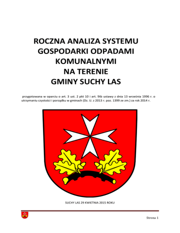 ROCZNA ANALIZA SYSTEMU GOSPODARKI ODPADAMI KOMUNALNYMI NA TERENIE GMINY SUCHY LAS przygotowana w oparciu o art. 3 ust. 2 pkt 10 i art. 9tb ustawy z dnia 13 września 1996 r. o utrzymaniu czystości i porządku w gminach (Dz. U. z 2013 r. poz. 1399 ze zm.) za rok 2014 r. SUCHY LAS 29 KWIETNIA 2015 ROKU Strona 1 Spis treści 1. Cel przygotowania Analizy .............................................................................. 3 2. Podstawa prawna sporządzenia Analizy ......................................................... 3 3. Ogólna charakterystyka systemu gospodarowania odpadami komunalnymi na terenie gminy Suchy Las ........................................................................... 3 4. Analiza możliwości przetwarzania zmieszanych odpadów komunalnych, odpadów zielonych oraz pozostałości z sortowania odpadów komunalnych przeznaczonych do składowania .......................................................................... 5 5. Analiza potrzeb inwestycyjnych związanych z gospodarowaniem odpadami komunalnymi ................................................................................................ 6 6. Analiza kosztów poniesionych w związku z odbieraniem, odzyskiem, recyklingiem i unieszkodliwianiem odpadów komunalnych (wg stanu na dzień 31 grudnia 2014 r.) ................................................................................................... 7 7. Liczba ludności…………………………………………………………………………………………… 7 8. Postępowanie wobec właścicieli nieruchomości, którzy nie złożyli deklaracji o wysokości opłaty za gospodarowanie odpadami komunalnym.............................................................................................................. 7 9. Analiza ilości odpadów komunalnych wytworzonych na terenie gminy ...... 7 10. Poziomy recyklingu, przygotowania do ponownego użycia i odzysku innymi metodami niektórych frakcji odpadów komunalnych, osiągnięte przez Gminę Suchy Las w 2014 r. ................................................................................... 10 11. Podsumowanie .................................................................................... 11 Strona 2 1. Cel przygotowania Analizy Analiza została przygotowana w celu weryfikacji możliwości technicznych i organizacyjnych gminy Suchy Las w zakresie gospodarowania odpadami komunalnymi. 2. Podstawa prawna sporządzenia Analizy Analiza została przygotowana w oparciu o art. 3 ust. 2 pkt 10 i art. 9tb ustawy z dnia 13 września 1996 r. o utrzymaniu czystości i porządku w gminach (t. jedn. Dz. U. z 2013 r. poz. 1399 ze zm.) – powoływanej dalej jako u.c.p.g., gdzie określony został wymagany zakres przedmiotowej analizy. 3. Ogólna charakterystyka systemu gospodarowania odpadami komunalnymi na terenie gminy Suchy Las Rok 2014 był ponownie rokiem przełomowym dla gospodarki odpadami na terenie gminy Suchy Las. Do 1 lipca 2013 r. obowiązywał stary system gospodarowania odpadami komunalnymi, oparty na umowach zawieranych przez mieszkańców i firmy z dobrowolnie wybranymi podmiotami mającymi zezwolenie wydanie przez Wójta Gminy na odbiór i transport odpadów komunalnych z terenu gminy Suchy Las. W okresie od dnia 1 lipca 2013 roku do 31 grudnia 2013 roku gospodarka odpadami komunalnymi na terenie gminy Suchy Las prowadzona była przez Związek Międzygminny „Gospodarka Odpadami Aglomeracji Poznańskiej” (GOAP). Od dnia 1 stycznia 2014 roku Gmina Suchy Las samodzielnie prowadzi gospodarkę odpadami komunalnymi. Szczegółowe zasady odnoszące się do sposobu postępowania z poszczególnymi frakcjami odpadów, rodzaju/pojemności pojemników przeznaczonych do zbierania odpadów oraz częstotliwości ich opróżniania wynikające z art. 4 ust. 2 ustawy o u.c.p.g reguluje uchwała Rady Gminy Suchy Las z dnia 23 września 2013 roku XXXIX/394/13 w sprawie „Regulaminu utrzymania czystości i porządku na terenie Gminy Suchy Las” (zwana dalej „Regulaminem”) zmieniona uchwałą nr LII/579/14 z dnia 30 października 2014 roku. Systemem gospodarki odpadami objęte zostały nieruchomości, na których zamieszkują mieszkańcy, natomiast właściciele nieruchomości niezamieszkałych obowiązani są do zawarcia stosownych umów na odbiór odpadów z uprawnionymi podmiotami wymienionymi w Rejestrze Działalności Regulowanej dla Gminy Suchy Las. Gmina w zamian za uiszczaną przez mieszkańców stawkę opłaty gospodaruje odpadami komunalnymi. Gmina, po uwzględnieniu przesłanek, o których mowa w art. 6d ust. 2 ustawy o u.c.p.g. – została podzielona na dwa sektory odbioru odpadów komunalnych z nieruchomości na których zamieszkują mieszkańcy: sektor I obejmujący obszar miejscowości Biedrusko oraz sektor II obejmujący pozostały teren Gminy. Odbiór, transport i zagospodarowanie odpadów w 2014 roku od 1 marca do 31 grudnia na podstawie przeprowadzonego przetargu prowadziło konsorcjum firm w składzie: Zakład Gospodarki Komunalnej Suchy Las sp. z o.o Suchy Las oraz Remondis Sanitech PoStrona 3 znań sp. z o.o. (do czasu skutecznego rozstrzygnięcia przetargu przez pierwsze dwa miesiące 2014 r. – Zakład Gospodarki Komunalnej Suchy Las Sp. z o.o.). W ramach obowiązującego systemu selektywną zbiórką odpadów zostały objęte wszystkie wymagane prawem frakcje odpadów komunalnych wytwarzane na terenie nieruchomości, na których zamieszkują mieszkańcy. Regulamin wprowadził następującą częstotliwość odbioru odpadów komunalnych z nieruchomości, na których zamieszkują mieszkańcy: Rodzaj odpadów Odpady komunalne zmieszane Odpady komunalne selektywnie zebrane: 1.Papier i tektura 2. Szkło kolorowe 3. Szkło białe 4. Tworzywa sztuczne, metale Zabudowa jednorodzinna Raz na 2 tygodnie Raz na 4 tygodnie Raz na 4 tygodnie Raz na 4 tygodnie Raz na 2 tygodnie (w okresie od 1 maja do 30 września) Raz na 4 tygodnie (w okresie od 1 października do 30 kwiet