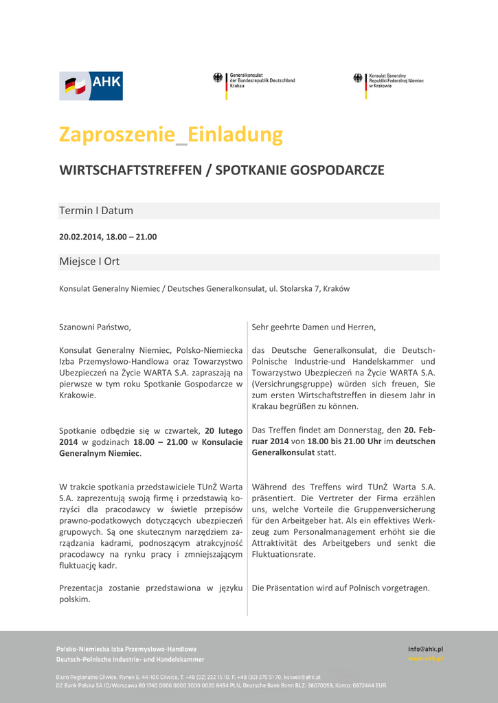Zaproszenie_Einladung WIRTSCHAFTSTREFFEN / SPOTKANIE GOSPODARCZE Termin I Datum 20.02.2014, 18.00 – 21.00 Miejsce I Ort Konsulat Generalny Niemiec / Deutsches Generalkonsulat, ul. Stolarska 7, Kraków Szanowni Państwo, Sehr geehrte Damen und Herren, Konsulat Generalny Niemiec, Polsko-Niemiecka Izba Przemysłowo-Handlowa oraz Towarzystwo Ubezpieczeń na Życie WARTA S.A. zapraszają na pierwsze w tym roku Spotkanie Gospodarcze w Krakowie. das Deutsche Generalkonsulat, die DeutschPolnische Industrie-und Handelskammer und Towarzystwo Ubezpieczeń na Życie WARTA S.A. (Versichrungsgruppe) würden sich freuen, Sie zum ersten Wirtschaftstreffen in diesem Jahr in Krakau begrüßen zu können. Spotkanie odbędzie się w czwartek, 20 lutego Das Treffen findet am Donnerstag, den 20. Feb2014 w godzinach 18.00 – 21.00 w Konsulacie ruar 2014 von 18.00 bis 21.00 Uhr im deutschen Generalkonsulat statt. Generalnym Niemiec. W trakcie spotkania przedstawiciele TUnŻ Warta S.A. zaprezentują swoją firmę i przedstawią korzyści dla pracodawcy w świetle przepisów prawno-podatkowych dotyczących ubezpieczeń grupowych. Są one skutecznym narzędziem zarządzania kadrami, podnoszącym atrakcyjność pracodawcy na rynku pracy i zmniejszającym fluktuację kadr. Während des Treffens wird TUnŻ Warta S.A. präsentiert. Die Vertreter der Firma erzählen uns, welche Vorteile die Gruppenversicherung für den Arbeitgeber hat. Als ein effektives Werkzeug zum Personalmanagement erhöht sie die Attraktivität des Arbeitgebers und senkt die Fluktuationsrate. Prezentacja zostanie przedstawiona w języku Die Präsentation wird auf Polnisch vorgetragen. polskim. Podczas spotkania rozlosujemy upominki ufun- Während des Treffens werden die von TUnŻ dowane przez TUnŻ Warta S.A. Warta S.A. gestifteten Preise verlost. Serdecznie zapraszamy także Państwa niemiec- Auch Ihre deutschen Kollegen und polnischen kich kolegów oraz polskich partnerów bizneso- Geschäftspartner, die Sie mitbringen können, wych. sind uns herzlich willkommen. Udział w spotkaniu jest bezpłatny. Każdy z gości Die Teilnahme ist kostenfrei. Jeder Gast wird będzie proszony o noszenie identyfikatora - pro- gebeten, ein Namensschild zu tragen – bitte simy o zabranie wizytówek. vergessen Sie Ihre Visitenkarten nicht. Prosimy o potwierdzenie Państwa udziału na załączonym formularzu mailem na adres: [email protected] do dnia 14.02.2014. Prosimy traktować Państwa zgłoszenie zobowiązująco, organizatorzy i pozostali Goście liczą na Państwa przybycie. Bitte teilen Sie uns Ihr Erscheinen per E-Mail auf dem beigefügten Formular an die Adresse [email protected] bis zum 14.02.2014 mit. Betrachten Sie bitte Ihre Anmeldung zu diesem Termin als verbindlich. Auf Ihr Erscheinen verlassen sich die Veranstalter und andere Gäste. Prosimy o przesłanie do dnia 17.02.2014 pisem- Absagen der angemeldeten Personen erbitten nej informacji na adres [email protected] - jeśli pomi- wir bis zum 17.02.2014 schriftlich an [email protected] mo zgłoszenia nie będziecie Państwo mogli przybyć na nasze spotkanie. Dziękujemy / Mit herzlichem Dank an Kontakt AHK Polska / AHK Polen Biuro Regionalne / Regionalbüro Tel. 32 232 15 10 Potwierdzenie udziału_Anmeldung Wirtschaftstreffen, 20.02.2014 Potwierdzenie udziału prosimy przesłać do dnia 14.02.2014 mailem na adres: Bitte senden Sie Ihre Anmeldung bis zum 14.02.2014 per E-Mail an: [email protected] Imię i Nazwisko / Vor- und Nachname …………………………………………………………………………………………………………………………………………………..…..……… Stanowisko / Position ..………………………………………………………………………………………………………………………………………….………………… Firma / Instytucja / Institution ...…………………………………………………………………….……………………………………………………………………………………… Ulica i numer / Straße, Nummer …………………………………………………………………………………………………………………………………………………………….… Kod i miejscowość / PLZ, Ort ……………………………………………………………………………………………..……………………………………………………….………. Tel. ………………………………………………….….…….… Mail ………….………………….…….…………………………………..…… Data i podpis / Datum und Unterschrift ………………………………………………..…………………..…………………………