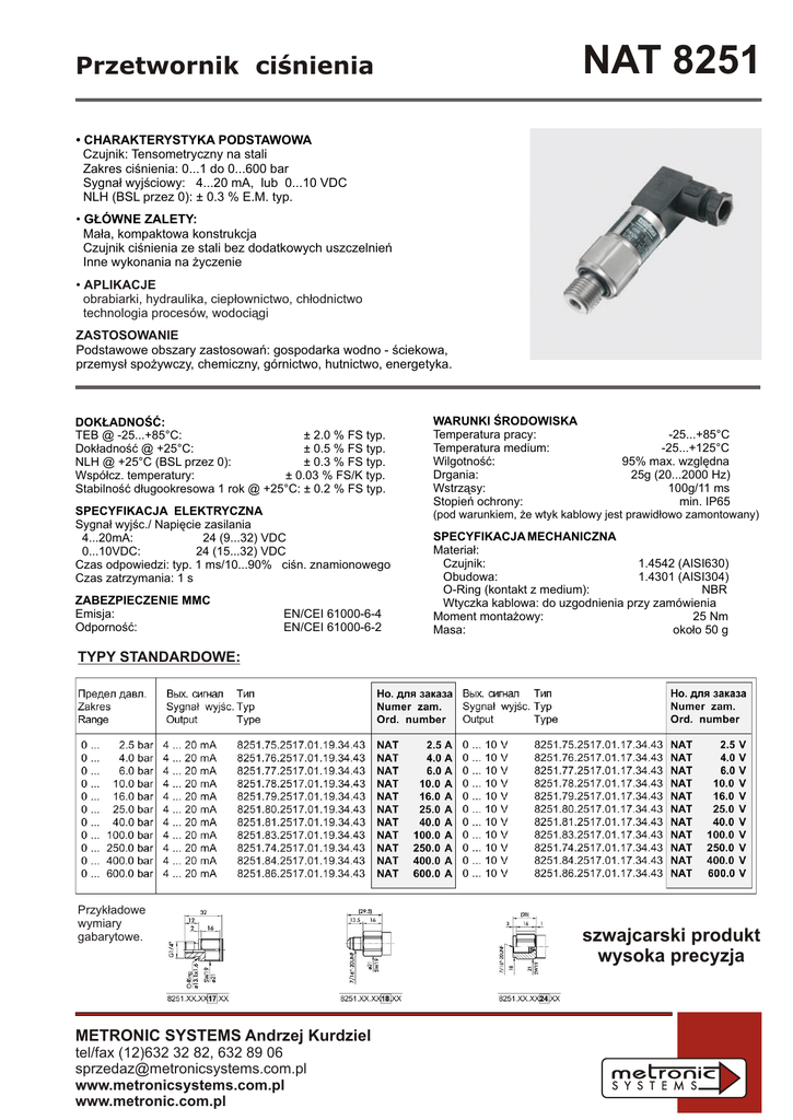 NAT 8251 Przetwornik ciœnienia • CHARAKTERYSTYKA PODSTAWOWA Czujnik: Tensometryczny na stali Zakres ciœnienia: 0...1 do 0...600 bar Sygna³ wyjœciowy: 4...20 mA, lub 0...10 VDC NLH (BSL przez 0): ± 0.3 % E.M. typ. . • G£ÓWNE ZALETY: Ma³a, kompaktowa konstrukcja Czujnik ciœnienia ze stali bez dodatkowych uszczelnieñ Inne wykonania na ¿yczenie . • APLIKACJE obrabiarki, hydraulika, ciep³ownictwo, ch³odnictwo technologia procesów, wodoci¹gi . ZASTOSOWANIE Podstawowe obszary zastosowañ: gospodarka wodno - œciekowa, przemys³ spo¿ywczy, chemiczny, górnictwo, hutnictwo, energetyka. DOK£ADNOŒÆ: TEB @ -25...+85°C: ± 2.0 % FS typ. Dok³adnoœæ @ +25°C: ± 0.5 % FS typ. NLH @ +25°C (BSL przez 0): ± 0.3 % FS typ. Wspó³cz. temperatury: ± 0.03 % FS/K typ. Stabilnoœæ d³ugookresowa 1 rok @ +25°C: ± 0.2 % FS typ. . SPECYFIKACJA ELEKTRYCZNA Sygna³ wyjœc./ Napiêcie zasilania 4...20mA: 24 (9...32) VDC 0...10VDC: 24 (15...32) VDC Czas odpowiedzi: typ. 1 ms/10...90% ciœn. znamionowego Czas zatrzymania: 1 s . ZABEZPIECZENIE MMC Emisja: Odpornoœæ: EN/CEI 61000-6-4 EN/CEI 61000-6-2 WARUNKI ŒRODOWISKA Temperatura pracy: Temperatura medium: Wilgotnoœæ: Drgania: Wstrz¹sy: Stopieñ ochrony: -25...+85°C -25...+125°C 95% max. wzglêdna 25g (20...2000 Hz) 100g/11 ms min. IP65 (pod warunkiem, ¿e wtyk kablowy jest prawid³owo zamontowany) . SPECYFIKACJA MECHANICZNA Materia³: Czujnik: 1.4542 (AISI630) Obudowa: 1.4301 (AISI304) O-Ring (kontakt z medium): NBR Wtyczka kablowa: do uzgodnienia przy zamówienia Moment monta¿owy: 25 Nm Masa: oko³o 50 g TYPY STANDARDOWE: Przyk³adowe wymiary gabarytowe. METRONIC SYSTEMS Andrzej Kurdziel tel/fax (12)632 32 82, 632 89 06 [email protected] www.metronicsystems.com.pl www.metronic.com.pl szwajcarski produkt wysoka precyzja