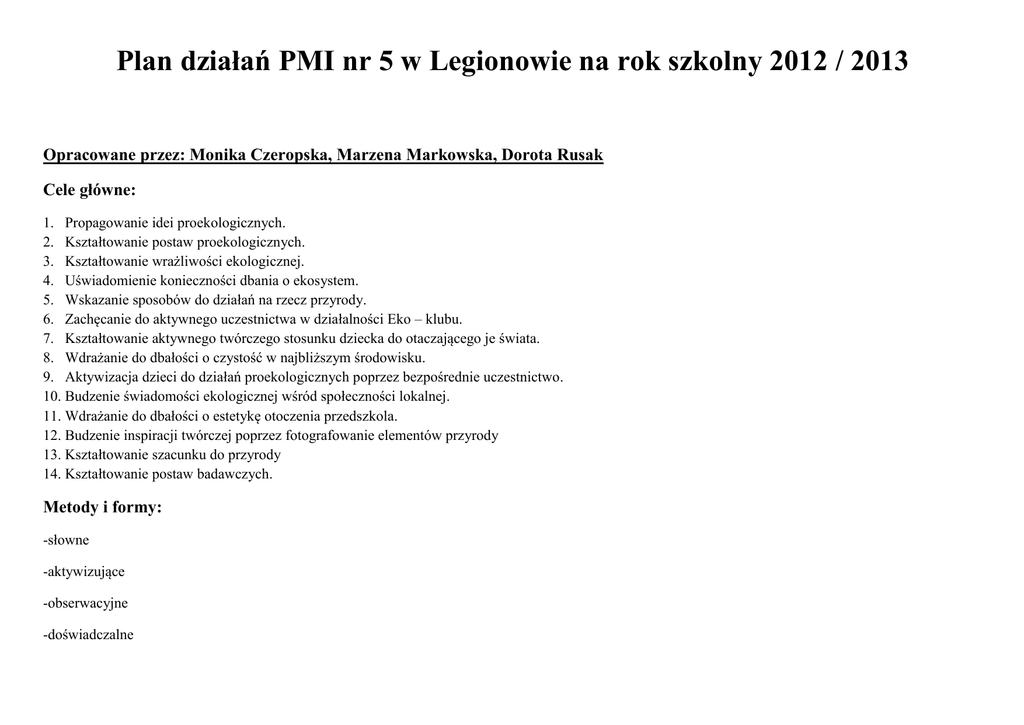 Plan działań PMI nr 5 w Legionowie na rok szkolny 2012 / 2013 Opracowane przez: Monika Czeropska, Marzena Markowska, Dorota Rusak Cele główne: 1. Propagowanie idei proekologicznych. 2. Kształtowanie postaw proekologicznych. 3. Kształtowanie wrażliwości ekologicznej. 4. Uświadomienie konieczności dbania o ekosystem. 5. Wskazanie sposobów do działań na rzecz przyrody. 6. Zachęcanie do aktywnego uczestnictwa w działalności Eko – klubu. 7. Kształtowanie aktywnego twórczego stosunku dziecka do otaczającego je świata. 8. Wdrażanie do dbałości o czystość w najbliższym środowisku. 9. Aktywizacja dzieci do działań proekologicznych poprzez bezpośrednie uczestnictwo. 10. Budzenie świadomości ekologicznej wśród społeczności lokalnej. 11. Wdrażanie do dbałości o estetykę otoczenia przedszkola. 12. Budzenie inspiracji twórczej poprzez fotografowanie elementów przyrody 13. Kształtowanie szacunku do przyrody 14. Kształtowanie postaw badawczych. Metody i formy: -słowne -aktywizujące -obserwacyjne -doświadczalne Zasięg oddziaływania: -przedszkole -domy rodzinne dzieci -społeczność lokalna Obszar działań Działania i sposób realizacji Osoby odpowiedzialne Termin realizacji Kontynuacja Programu EKO-klubu Misia Uszatka PMI 5 - Przypomnienie założeń Programu ekozespołów na Radzie Pedagogicznej - wyłonienie chętnych nauczycieli do współpracy Koordynatorzy nauczyciele dyrektor pracownicy przedszkola wrzesień Koordynatorzy nauczyciele wrzesień - zapoznanie z programem dzieci i rodziców - opracowanie celów pracy ekozespołów w poszczególnych obszarach -opracowanie harmonogramu działań - przeprowadzenie audytu początkowego - podejmowanie działań wrzesień Koordynatorzy nauczyciele Koordynatorzy Praca ciągła Koordynatorzy nauczyciele marzec Koordynatorzy Praca ciągła proekologicznych i ich dokumentowanie - promowanie działań na rzecz środowiska naturalnego poprzez: tablice edukacyjno – informacyjne, gazetkę przedszkolną, ulotki, lokalne media, portal społecznościowy Facebook - pozyskiwanie partnerów do współpracy - przeprowadzenie audytu końcowego - opracowanie formularza aplikacji - spotkania ekozespołów – planowanie i omawianie podejmowanych działań - podsumowanie pracy ekozespołów nauczyciele dzieci rodzice Koordynatorzy Praca ciągła Koordynatorzy Dyrektor Koordynatorzy nauczyciele dyrektor pracownicy przedszkola Koordynatorzy Praca ciągła Koordynatorzy ekozespoły Praca ciągła Koordynatorzy czerwiec czerwiec czerwiec Ochrona różnorodności biologicznej, praw zwierząt i przyrody nieożywionej Obszar działań Działania i sposób realizacji Pomiar śladu ekologicznego Wstępny Końcowy Akcja promocyjna zachęcająca rodziców do mierzenia śladu ekologicznego 1. Rozmowa o konieczności ochrony środowiska w ramach akcji „Sprzątanie świata”. 2. Wycieczka po najbliższej okolicy – ocena stanu środowiska. 3. Sprzątanie pobliskiego terenu. 1. Zamieszczenie na łamach gazetki ekologicznej informacji o planowanym „Święcie drzewa”. 2. Zajęcia edukacyjne z leśnikiem na temat: „ Rola człowieka dla ochrony ekosystemu leśnego” 3. Sadzenie drzew w Nadleśnictwie Jabłonna 4. Zgłoszenie do uczestnictwa w programie „Święto drzewa”. 1. Zapoznanie dzieci z warunkami bytowania wybranego zwierzęcia. 2. Założenie hodowli przy udziale specjalisty 3. Systematyczna obserwacja hodowanego zwierzątka. 4. Wykonanie przez dzieci prac plastycznych pt. „Nasza hodowla”. Cykliczne spotkania z leśnikami Uczestnictwo w akcji „Sprzątanie Świata -2012” „Święto drzewa” Założenie nowych hodowli: - rybka bojownik - żółw wodny Współpraca z Nadleśnictwo Jabłonna Osoby odpowiedzialne Termin realizacji Koordynatorzy ekozespołu Koordynatorzy ekozespołu Nauczyciele Październik Kwiecień Październik i kwiecień Nauczyciele Dzieci Pracownicy przedszkola Wrzesień Nauczyciele Dzieci Październik Nauczyciele Dzieci Grudzień/marzec Nauczyciele Dyrektor Praca ciągła Wielkie Kasztanobranie II Międzyprzedszkolny Quiz Ekologiczny „Nasza Ziemia” Ogólnopolski program „ Czyste powietrze wokół nas” Kubusiowi Przyjaciele natury Bezpieczne przedszkole Zbiórka kasztanów Zajęcia edukacyjne „Ratujmy Kasztanowce” „Podziwianie piękna kasztanowców” wycieczka do parku miejskiego Organizacja międzyprzedszkolnego Quizu Ekologicznego „Nasza Ziemia” podsumowującego Międzynarodowy Rok Lasu Zaproszenie dzieci z przedszkoli powiatu legionowskiego Zaproszenie przedstawiciela Nadleśnictwa Jabłonna – Pani leśnik Ewy Grzywacz (nadzór merytoryczny) Opracowanie treści quizu i materiałów pomocniczych Przygotowanie statuetek i dyplomów Zorganizowanie zdrowego poczęstunku dla uczestników imprezy Zorganizowanie i przeprowadzenie zajęć, w przedszkolu i terenie, o tematyce antynikotynowej. Wykonanie tablic informujących rodziców o szkodliwości palenia tytoniu. Cykl zajęć według programu „Kubusiowi Przyjaciele Natury” Cykl zajęć obejmujący następujące treści tematyczne: m.in bezpieczne zabawy, bezpiecznie z prądem itp Nauczyciele Dzieci Rodzice Październik/listopad Nauczyciele Dzieci Rodzice Dyrektor Przedstawiciel Nadleśnictwa listopad Nauczyciele Dzieci Rodzice listopad Nauczyciele Dzieci Rodzice Szkoła Podstawowa nr 1 Nauczyciele Dzieci Dyrektor Rodzice Powiatowa Komenda Policji w Legionowie Straż Miejska Inspektor BHP Komenda Powiatowa Państwowej Straży Pożarnej w Praca ciągła Praca ciągła Legionowie Przeprowadzenie zbiórki funduszy poprzez aukcje akcja „Pełna miska dla schroniska” i zbiórka artykułów pierwszej pomocy dla zwierząt ze schroniska. Zorganizowanie konkursu fotograficznego „Zwierzęta oczami dzieci” Wycieczka do schroniska dla zwierząt w Józefowie lub w Nowym Dworze Mazowieckim. Zabawy edukacyjno – badawcze w sali „Bzyk” Nauczyciele Dzieci Rodzice Styczeń/Marzec Nauczyciele Dzieci Dyrektor luty Nauczyciele Dzi