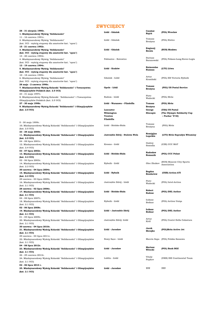 ZWYCIĘZCY 28 - 31 sierpnia 1990r. 1. Międzynarodowy Wyścig "Solidarności" Łódź - Gdańsk Czesław Rajch (POL) Wrocław Łódź - Gdańsk Tomasz Brożyna (POL) Kielce Łódź - Gdańsk Ewgienij Berzin (RUS) Moskwa Pabianice - Katowice Dariusz Baranowski (POL) Pekaes-Lang-Rover-Legia Łódź - Kraków Raimondas Rumsas (LTU) Litwa Gdańsk - Łódź Artur Krasiński (POL) EB Victoria Rybnik Opole - Łódź Tomasz Brożyna (POL) US Postal Service Radom - Łódź Piotr Wadecki (POL) Mróz Łódź - Warszawa – Filadelfia Tomasz (POL) Mróz 11 - 16 czerwca 1991r. 2. Międzynarodowy Wyścig "Solidarności" (kat. UCI - wyścig etapowy dla amatorów kat. "open") 15 - 21 czerwca 1992r. 3. Międzynarodowy Wyścig "Solidarności" (kat. UCI - wyścig etapowy dla amatorów kat. "open") 14 - 20 czerwca 1993r. 4. Międzynarodowy Wyścig "Solidarności" (kat. UCI - wyścig etapowy dla amatorów kat. "open") 13 - 19 czerwca 1994r. 5. Międzynarodowy Wyścig "Solidarności" (kat. UCI - wyścig etapowy dla amatorów kat. "open") 10 - 18 czerwca 1995r. 6. Międzynarodowy Wyścig "Solidarności" (kat. UCI - wyścig etapowy dla amatorów kat. "open") 28 maja - 2 czerwca 1996r. 7. Międzynarodowy Wyścig Kolarski "Solidarności" i Towarzystwa Olimpijczyków Polskich (kat. 2.5 UCI) 23 - 31 maja 1997r. 8. Międzynarodowy Wyścig Kolarski "Solidarności" i Towarzystwa Olimpijczyków Polskich (kat. 2.5 UCI) 27 - 30 maja 1998r. 9. Międzynarodowy Wyścig Kolarski "Solidarności" i Olimpijczyków (kat. 2.5 UCI) Brożyna Lancaster George (USA) US Postal Wilmington Hincapie (The Olympic Solidarity Cup Trenton – Puchar "S"iO) Filadelfia 5 - 30 maja 1999r. 10. Międzynarodowy Wyścig Kolarski "Solidarności" i Olimpijczyków Łódź - Bielsko-Biała Tomasz Brożyna (POL) Mróz Jastrzębie Zdrój - Stalowa Wola Remigijus Lupeikis (LTU) Mróz Supradyn Witaminy Krosno - Łódź Ondrej Sosenka (CZE) CCC MAT Łódź - Bielsko-Biała Radosław Romanik (POL) CCC Polsat Rybnik - Łódź Olec Zhukov (RUS) Moscow City Sports Association Łódź - Rybnik Bogdan Bondariew (UKR) Action-ATI Jastrzębie Zdrój - Łódź Piotr Wadecki (POL) Intel-Action Łódź - Bielsko-Biała Robert Radosz (POL) DHL Author Rybnik - Łódź Łukasz Bodnar (POL) Action Uniqa Łódź – Jastrzębie Zdrój Łukasz Bodnar (POL) DHL Author Jastrzębie Zdrój- Łódź Artur Król (POL) Centri Della Calzatura Łódź - Jarosław Jacek Morajko (POL)Mróz Active Jet Nowy Sącz - Łódź Marcin Sapa (POL) Polska Szosowa Łódź - Jarosław Mariusz Witecki (POL) Bank BGZ Lublin - Łódź Vitaly Popkov (UKR) ISD Continental Team Łódź - Jarosław ??? ??? (kat. 2.5 UCI) 23 - 28 maja 2000r. 11. Międzynarodowy Wyścig Kolarski "Solidarności" i Olimpijczyków (kat. 2.5 UCI) 04 - 08 lipca 2001r. 12. Międzynarodowy Wyścig Kolarski "Solidarności" i Olimpijczyków (kat. 2.4 UCI) 03 - 07 lipca 2002r. 13. Międzynarodowy Wyścig Kolarski "Solidarności" i Olimpijczyków (kat. 2.3 UCI) 02 - 06 lipca 2003r. 14. Międzynarodowy Wyścig Kolarski "Solidarności" i Olimpijczyków (kat. 2.3 UCI) 30 czerwca - 04 lipca 2004r. 15. Międzynarodowy Wyścig Kolarski "Solidarności" i Olimpijczyków (kat. 2.3 UCI) 29 czerwca - 03 lipca 2005r. 16. Międzynarodowy Wyścig Kolarski "Solidarności" i Olimpijczyków (kat. 2.1 UCI) 28 czerwca - 02 lipca 2006r. 17. Międzynarodowy Wyścig Kolarski "Solidarności" i Olimpijczyków (kat. 2.1 UCI) 04 - 08 lipca 2007r. 18. Międzynarodowy Wyścig Kolarski "Solidarności" i Olimpijczyków (kat. 2.1 UCI) 02 - 06 lipca 2008r. 19. Międzynarodowy Wyścig Kolarski "Solidarności" i Olimpijczyków (kat. 2.1 UCI) 01 - 05 lipca 2009r. 20. Międzynarodowy Wyścig Kolarski "Solidarności" i Olimpijczyków (kat. 2.1 UCI) 30 czerwca - 04 lipca 2010r. 21. Międzynarodowy Wyścig Kolarski "Solidarności" i Olimpijczyków (kat. 2.1 UCI) 29 czerwca - 04 lipca 2011r. 22. Międzynarodowy Wyścig Kolarski "Solidarności" i Olimpijczyków (kat. 2.1 UCI) 04 - 08 lipca 2012r. 23. Międzynarodowy Wyścig Kolarski "Solidarności" i Olimpijczyków (kat. 2.1 UCI) 26 - 29 czerwca 2013r. 24. Międzynarodowy Wyścig Kolarski "Solidarności" i Olimpijczyków (kat. 2.1 UCI) 02 - 06 lipca 2014 r. 25. Międzynarodowy Wyścig Kolarski "Solidarności" i Olimpijczyków (kat. 2.1 UCI)