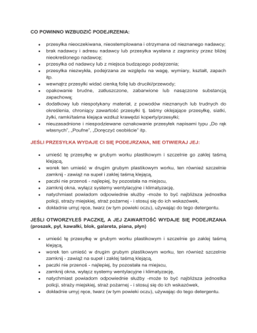 CO POWINNO WZBUDZIĆ PODEJRZENIA: przesyłka nieoczekiwana, nieostemplowana i otrzymana od nieznanego nadawcy; brak nadawcy i adresu nadawcy lub przesyłka wysłana z zagranicy przez bliżej nieokreślonego nadawcę; przesyłka od nadawcy lub z miejsca budzącego podejrzenia; przesyłka niezwykła, podejrzana ze względu na wagę, wymiary, kształt, zapach itp. wewnątrz przesyłki widać cienką folię lub druciki/przewody; opakowanie brudne, zatłuszczone, zabarwione lub nasączone substancją zapachową; dodatkowy lub niespotykany materiał, z powodów nieznanych lub trudnych do określenia, chroniący zawartość przesyłki tj. taśmy oklejające przesyłkę, siatki, żyłki, ramki/taśma klejąca wzdłuż krawędzi koperty/przesyłki; nieuzasadnione i niespodziewane oznakowanie przesyłek napisami typu „Do rąk własnych”, „Poufne”, „Doręczyć osobiście” itp. JEŚLI PRZESYŁKA WYDAJE CI SIĘ PODEJRZANA, NIE OTWIERAJ JEJ: umieść tę przesyłkę w grubym worku plastikowym i szczelnie go zaklej taśmą klejącą, worek ten umieść w drugim grubym plastikowym worku, ten również szczelnie zamknij - zawiąż na supeł i zaklej taśmą klejącą, paczki nie przenoś - najlepiej, by pozostała na miejscu, zamknij okna, wyłącz systemy wentylacyjne i klimatyzację, natychmiast powiadom odpowiednie służby -może to być najbliższa jednostka policji, straży miejskiej, straż pożarnej - i stosuj się do ich wskazówek, dokładnie umyj ręce, twarz (w tym powieki oczu), używając do tego detergentu. JEŚLI OTWORZYŁEŚ PACZKĘ, A JEJ ZAWARTOŚĆ WYDAJE SIĘ PODEJRZANA (proszek, pył, kawałki, blok, galareta, piana, płyn) umieść tę przesyłkę w grubym worku plastikowym i szczelnie go zaklej taśmą klejącą, worek ten umieść w drugim grubym plastikowym worku, ten również szczelnie zamknij - zawiąż na supeł i zaklej taśmą klejącą, paczki nie przenoś - najlepiej, by pozostała na miejscu, zamknij okna, wyłącz systemy wentylacyjne i klimatyzację, natychmiast powiadom odpowiednie służby -może to być najbliższa jednostka policji, straży miejskiej, straż pożarnej - i stosuj się do ich wskazówek, dokładnie umyj ręce, twarz (w tym powieki oczu), używając do tego detergentu. Jeżeli wykonanie opisanych wyżej czynności nie jest możliwe, nie rób nic z przesyłką, opuść pomieszczenie, zabezpiecz przed dostępem osób postronnych. O przesyłce powiadom Policję, Państwową Straż Pożarną, Straż Miejską lub Wojewódzką Stację Sanitarno-Epidemiologiczną. Telefony alarmowe 112 – ogólnopolski numer ratunkowy 999 – Pogotowie Ratunkowe 998 – Straż Pożarna 997 – Policja