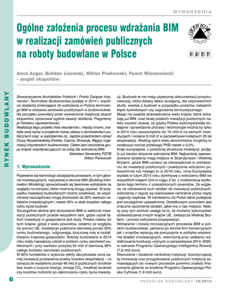 WYDA RZEN I A Ogólne założenia procesu wdrażania bim w realizacji zamówień publicznych na roboty budowlane w Polsce ® R YNE K BUDOWLANY Anna Anger, Bohdan Lisowski, Wiktor Piwkowski, Paweł Wierzowiecki – zespół ekspertów Stowarzyszenie Architektów Polskich i Polski Związek Inżynierów i Techników Budownictwa podjęły w 2014 r. wspólne działania zmierzające do wdrożenia w Polsce technologii BIM w obszarze zamówień publicznych w budownictwie. Na początku powołany przez wymienione instytucje zespół ekspertów, opracował ogólne zasady działania. Pragniemy je Państwu zaprezentować. Realizacja tego projektu trwa nieustannie i, między innymi, znalazła swój wyraz w projekcie nowej ustawy o zamówieniach publicznych oraz, w październiku br., będzie przedmiotem obrad Grupy Wyszehradzkiej (Polska, Czechy, Słowacja, Węgry) organizacji inżynierskich budownictwa. Celem jest utworzenie grupy krajów współpracujących ze sobą dla wdrożenia BIM. Sekretarz Generalny PZITB Wiktor Piwkowski 1. Wprowadzenie Pojawienie się technologii zarządzania procesami, w tym głównie inwestycyjnymi, nazywanej w skrócie BIM (Building Information Modeling) spowodowało jej lawinowe wdrażanie ze względu na korzyści, które można tą drogą uzyskać. W przypadku inwestycji budowlanych można oczekiwać, że wspominane oszczędności mogą dochodzić do 20% wartości nakładów inwestycyjnych i nawet 35% w skali kosztów całego cyklu życia budowli. Szczególnie istotne jest stosowanie BIM w sektorze inwestycji publicznych przede wszystkim tam, gdzie udział takich inwestycji w gospodarce jest duży. Polska należy do tych krajów, gdzie z wielu powodów, ostatnio ze względu na pomoc UE, inwestycje publiczne stanowią ponad 50% rynku budowlanego, odgrywając kluczową rolę w kształtowaniu krajowej gospodarki. Roboty budowlane w 2014 roku miały największy udział w polskim rynku zamówień publicznych i przy wartości powyżej 54 mld zł stanowią 38% całego budżetu zamówień publicznych. W 92% kontaktów o wyborze oferty decydowała cena samej inwestycji pozbawiona analizy kosztów eksploatacji – co oznacza że wydaliśmy ponad 49 mld zł publicznych środków bez troski o zużycie energii, emisję CO2, trwałość budowli czy kosztów rozbiórki po zakończeniu cyklu życia inwesty- 6 cji. Budowle te nie mają użytecznej dokumentacji powykonawczej, która dałaby łatwo dostępną, dla odpowiednich służb, wiedzę o budowli w przypadku pożarów, katastrof, klęsk żywiołowych czy zagrożenia terrorystycznego. Mając na uwadze doświadczenia wielu krajów, które wdrażają już BIM, oraz skalę polskich inwestycji publicznych należy wyrazić obawę, że gdyby Polska wykorzystywała dostępne i sprawdzone procesy i technologie można by tylko w 2014 roku zaoszczędzić do 10 mld zł na samych inwestycjach i kolejne 8 mld zł w perspektywie kolejnych 25 lat eksploatacji. Według opinii wielu ekonomistów mogłoby to zwiększyć wzrost polskiego PKB nawet o 0,5%. Kraje europejskie, o podobnej strukturze inwestycji, podjęły już bardzo aktywnie wdrożenie BIM. Najbardziej zaawansowane działania mają miejsce w Skandynawii i Wielkiej Brytanii, gdzie BIM uznano za obowiązkowe w odniesieniu do inwestycji publicznych i praktycznie wdrożono powszechnie lub nastąpi to w 2016 roku. Unia Europejska wydała w lutym 2014 roku dyrektywę o wdrożeniu BIM we wszystkich krajach Unii w ciągu 2 lat, z możliwością wydłużenia tego terminu z uzasadnionych powodów. Ze względu na odniesienie tych działań do inwestycji publicznych, wdrożenia z reguły są realizowane centralnie przez rządy i agendy rządowe. W odniesieniu do Polski takie podejście jest szczególnie uzasadnione. Dodatkowym powodem jest znaczne opóźnienie działań, jakie ma u nas miejsce. Należy przy tym zwrócić uwagę na to, że możemy wykorzystać doświadczenia innych krajów UE, zwłaszcza Wielkiej Brytanii, i proces wdrożenia przyspieszyć. Wdrażanie i rozwój innowacyjnych procesów BIM w polskim budownictwie, zarówno po stronie firm komercyjnych jak i urzędów wpisują się precyzyjnie w politykę wspierania działań innowacyjnych, stworzoną przy ustalaniu wydatkowania funduszy unijnych w perspektywie 2014–2020, w zakresie Programu Operacyjnego Inteligentny Rozwój (7,6 mld euro). Stworzenie i działanie centralnej instytucji, koordynującej tą innowację oraz przygotowanie publicznych instytucji zamawiających do nowych procesów powinno znaleźć finasowanie głównie ze środków Programu Operacyjnego Polska Cyfrowa (1,9 mld euro). PRzeg l Ąd bu d owl any 10/2015 WYDAR ZEN I A Przedkładany w dalszej części materiał, będący produktem zespołu ekspertów utworzonego w wyniku inicjatywy głównego inspektora nadzoru budowlanego, Stowarzyszenia Architektów Polskich i Polskiego Związku Inżynierów i Techników Budownictwa ma charakter propozycji modelu postępowania we wdrożeniu BIM w Polsce, który należy uwzględnić w aktualnie przygotowywanym projekcie nowej ustawy o zamówieniach publicznych. programów dotacji UE z budżetu 2015/20 na wdrożenie BIM w Polsce oraz realizację przynajmniej kilkudziesięciu projektów pilotażowych. 2. Proces 3. Wyzwania Inicjacja procesu wdrożeniowego BIM w zamówieniach publicznych w Polsce wymaga zaangażowania w prace podmiotów najbardziej decyzyjnych i zainteresowanych oraz stworzenia bazy merytorycznej dla dalszego rozwoju BIM w Polsce. Kluczowe wydają się poniższe wyzwania. • Uświadomienie polityków, urzędników, ubezpieczycieli i środowiska prawniczego. Najistotniejsze jest zrozumienie przez dysponentów majątku publicznego, jakie profity daje BIM dla budżetu państwa i jaki ma wpływ na wzrost konkurencyjności polskiej gospodarki w wymiarze nie tylko inwestycji bezpośrednich. Technologie BIM dają ogromny potencjał rozwojowy dla polskiej nauki i przemysłu w zakresie zaawansowanych technologii z zakresu e