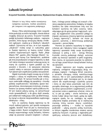 Lubuski kryminał Krzysztof Koziołek, Święta tajemnica, Wydawnictwo Kropka, Zielona Góra 2009, 288 s. Odważni to tacy, którzy realnie rozważywszy następstwa wyzwania, możliwe powodzenie, jak i związane z nim zagrożenie, podejmują je. Słowa z filmu zatytułowanego Kate i Leopold, które posłużyły za motto tej książki, równie dobrze mogłyby dotyczyć jej autora. Krzysztof Koziołek podjął się bowiem niełatwego zadania – napisania powieści, która łącząc sensacyjną fabułę z thrillerem sądowym, osadza ją w lokalnych, lubuskich realiach. Zaznaczmy od razu, że w tym wypadku „lokalność” trzeba wziąć w cudzysłów, gdyż w Świętej tajemnicy ze świecą szukać trzeba znaków rozpoznawczych regionu. Radio „Moje Miasto FM”, gazeta „Głos Naszego Miasta”, kawiarnia pod nazwą Czar Namiętności, podobnie jak inne przywoływane w książce toponimy (a obok nich także mówiące nazwiska) wskazują raczej, że mamy do czynienia z typem paraboli czy też powieści z kluczem, i że opisywane zdarzenia osadzić należy w szerszym, pozalubuskim planie. Tym planem jest współczesna polska rzeczywistość. Wątek kryminalny książki rozwija się w ścisłym związku z satyrą na współczesny świat władzy, mediów, polityki. W narracji Koziołka jak w krzywym zwierciadle odbijają się paradoksy i choroby polskiej współczesności: bezwładny aparat bezpieczeństwa, skorumpowane instytucje, zmanipulowana (za sprawą mediów) opinia publiczna etc. W tym świecie jedyną szansą, że zatriumfować może sprawiedliwość, a do głosu dojść prawda, jest solidarność małej grupy osób i jej determinacja, by stanąć w obronie niesprawiedliwie osądzonego detektywa – ofiary. Tym, co wyróżnia Świętą tajemnicę na tle innych realizacji gatunku, jest sposób rozwiązania zagadki, bowiem finał nie jest tu równoznaczny z happy endem. Rysem szczególnym jest również kreacja wspomnianego wyżej bohatera, któremu udaje się pozostać zarazem księdzem i człowie- 122 kiem, i którego postać odbiega od znanych z literatury popularnej wizerunków. Dodajmy, że księdza Sambora (bo takie nietuzinkowe imię nosi ów bohater) wyróżnia nie tylko sutanna, także, włączająca go do grona postaci tragicznych, sytuacja. Jej wyjątkowość (clou powieści) polega na impasie: poznawszy straszną tajemnicę spowiedzi („świętą tajemnicę”), bohater nie może jej ujawnić; samotnie, z determinacją podejmuje wyzwanie i… ponosi klęskę. Pomimo że zarówno wyzyskany tu tragiczny schemat, jak i fabularny (nieco naciągany) wątek tajemnicy spowiedzi miały swoje wcześniejsze realizacje (z jedną z nich – wersją filmową Koziołek zresztą podejmuje dialog), autorowi udało się stworzyć opowieść w pełni oryginalną. Rzec można, że wyzwanie pisarskie (w odróżnieniu od tego, przed którym stanął bohater) kończy się sukcesem. Święta tajemnica jest książką sprawnie napisaną: umiejętnie rozgrywającą akcję, stopniującą napięcie i budującą klimat osaczenia, a ponadto oferującą rodzaj metafizycznego dreszczu. Nie w tym upatrywałabym jednak jej największych zalet. Cenniejsze jest to, że stawia ważne dla współczesnego czytelnika pytania i mimo że zbyt łatwo przechodzi nad nimi do porządku dziennego, że w argumentacji posiłkuje się nieraz uproszczeniem i uogólnieniami, a w kreacji postaci ociera o papierowy schemat, mimo że to, co jest jej zaletą – strona techniczna, pod koniec kuleje (akcja traci impet, gubią się wątki, napięcie spada, bo np. nasilający się wątek udręczenia księdza przeradza się w stylistyczną manierę, którą narrator dręczy czytelnika), pozostaje ambitną i – trzeba to wyraźnie podkreślić – udaną pisarsko próbą kryminału, w którym zagadka morderstwa otwiera szerszy społeczny horyzont. A patrząc z regionalnej perspektywy, wskażmy jeszcze atut dodatkowy: oto bowiem obok „kryminału krakowskiego” (reprezentowanego przez tryptyk Jedenaście, Dwanaście, Trzynaście Marcina Świetlickiego), obok kryminału wrocławskiego (którego twórcą jest Marek Krajewski), obok wreszcie innych osadzonych regionalnie realizacji gatunku pojawił się dobrze napisany – kryminał lubuski. Warto to docenić, nawet jeśli jego lubuskość wyraża się tylko w kilku przywołaniach topografii regionu. Małgorzata Mikołajczak RECENZJE I OMÓWIENIA 123
