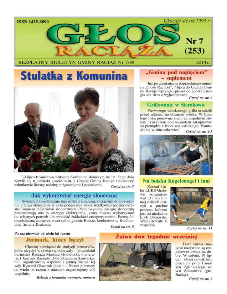 Stulatka z Komunina „Gmina pod napięciem” – suplement Już po zamknięciu poprzedniego numeru „Głosu Raciąża”, 7 lipca do Urzędu Gminy Raciąż wpłynęło pismo od spółki Energia dla firm z wyjaśnieniami. Czytaj na str. 9 Grillowanie w Sierakowie Pierwszego wioskowego grilla urządzili przed rokiem, na otwarcie boiska. W lipcu tego roku ponownie siedli za wspólnym stołem, tym razem pod namiotem zakupionym za pieniądze z funduszu sołeckiego. Pomieści się w nim cała wieś. Czytaj na str. 4-5 30 lipca Bronisława Kutyła z Komunina skończyła sto lat. Tego dnia zjawili się u jubilatki goście m.in. z Urzędu Gminy Raciąż i niektórzy członkowie licznej rodziny z życzeniami i podarkami. Czytaj na str. 3 Jak wykorzystać energię słoneczną Systemy fotowoltaiczne (nie mylić z solarami, służącymi do pozyskania energii słonecznej w celu podgrzania wody użytkowej) można określić mianem elektrowni słonecznych. Przechwyconą energię słoneczną przetwarzają one w energię elektryczną, którą można wykorzystać do własnych potrzeb lub sprzedać zakładowi energetycznemu. Farmę fotowoltaiczną zamierza stworzyć w gminie Raciąż, konkretnie w Kodłutowie, firma z Krakowa. Czytaj na str. 8 Po raz pierwszy od wielu lat razem Jarmark, który łączył – Chcemy nawiązać do tradycji jarmarków, które niegdyś w rynku się odbywały – powiedział burmistrz Raciąża Mariusz Godlewski, otwierając I Jarmark Raciąski „Pod Skrzatami Szuwarkami”, organizowany wspólnie z gminą Raciąż. Jej wójt Ryszard Giszczak dodał: – Po raz pierwszy od wielu lat razem z miastem organizujemy coś wspólnie. Relacja z jarmarku wewnątrz numeru Na boisku Kogel-mogel i inni Zarząd klubu LUKS Gralewo zorganizował 13 lipca turniej dzikich drużyn o puchar prezesa, którym jest od niedawna Eryk Olszewski. Wystartowało 6 zespołów. Czytaj na str. 11 Żniwa dwa tygodnie wcześniej Duże żniwa (małymi nazywane są rzepakowe) trwają na dobre. W sobotę, 19 lipca, obserwowaliśmy prace na polu Tomasza Zglinickiego we wsi Zdunówek (gm. Raciąż). Czytaj na str. 9 AKTUALNOŚCI 2 „G∏os Racià˝a” nr 7/2014 Po raz pierwszy od wielu lat razem Jarmark, który łączył – Chcemy nawiązać do tradycji jarmarków, które niegdyś w rynku się odbywały – powiedział burmistrz Raciąża Mariusz Godlewski, otwierając I Jarmark Raciąski „Pod Skrzatami Szuwarkami”, organizowany wspólnie z gminą Raciąż. Jej wójt Ryszard Giszczak dodał: – Po raz pierwszy od wielu lat razem z miastem organizujemy coś wspólnie. Dużo nas łączy: znajomi, rodziny, interesy... Podczas imprezy odbywała się sprzedaż na stoiskach wystawienniczych, na których oferowano produkty regionalne, rękodzieło (m. in. rzeźby, obrazy, wyroby ze szkła, metalu, wikliny, także „papierowej”, korzeni oraz innych naturalnych materiałów), starocie, pamiątki, żywność ekologiczną, tradycyjne wędliny, pieczywo, miody, słodycze, nalewki, owoce, warzywa i wiele innych. W programie znalazło się szereg pokazów artystycznych m. in. spektakl teatru Makata i teatru ognia Surturis, występy taneczne, koncerty. Gwiazdą jarmarku był zespół Brathanki. Dla najmłodszych zorganizowano sektor zabaw z wieloma atrakcjami, wśród których był konkurs plastyczny na portret skrzata Szuwarka. Wystawcy rywalizowali o miano najlepszego stoiska. Tytuł ten przypadł piekarni rodziny Wiejskich z Raciąża. Natomiast Polmlek Raciąż zwyciężył w kategorii produkt. Przez dwa dni imprezy, 19 i 20 lipca, „mały” park w Raciążu, gdzie odbywał się jarmark, odwiedziło wielu mieszkańców miasta i gminy. – Organizatorem I Raciąskiego Jar marku było Miejskie Centrum Kultury Spor tu i Rekreacji im. Ry- szarda Kaczorowskiego w Raciążu w partnerstwie z miastem Raciąż i gminą Raciąż. Do realizacji wydarzenia przyczyniły się także Starostwo Powiatowe w Płońsku, miasto Płońsk, OSP Raciąż, MCK Płońsk, MGOK Glinojeck, MODR Poświętne, LGD – Przyjazne Mazowsze, PGKiM Raciąż. W ramach wspólnej promocji wydarzenia podczas jarmarku po okolicy jeździł autobus, dowożący bezpłatnie mieszkańców chętnych do uczestnictwa w imprezie. Projekt był współfinansowany ze środków unijnych w ramach PROW przy pomocy Lokalnej Grupy Działania „Przyjazne Mazowsze” – poinformował nas dyrektor MCKSiR Ar tur Adamski. r-r Fotorelacja z jarmarku na str. 6-7 Zawody sportowo-pożarnicze Krajkowo na czele Jak już informowaliśmy w poprzednim wydaniu „GR”, w zawodach sportowo-pożarniczych, zorganizowanych przez gminę Raciąż w Jeżewie Wesel, w grupie A zwyciężyła drużyna OSP Krajkowo z wynikiem 50,87. To niewątpliwie niespodzianka, jeśli się zważy, że druhowie z Krajkowa pokonali m. in. ekipy z Uniecka i Kaczorowów. Jednostki OSP z tych miejscowości wchodzą w skład Kra- jowego Systemu Ratowniczo-Gaśniczego. W poprzednim numerze „GR” zaprezentowaliśmy też fotoreportaż z zawodów, ale bez podania pełnych wyników. Nadrabiamy tę zaległość. W zawodach w Jeżewie Wesel wystartowało 15 drużyn: 9 drużyn z grupy A (mężczyźni), jeden zespół kobiecy – z OSP Raciąż, jedna drużyna chłopców w wieku 16–18 lat – tak- że z OSP Raciąż, dziewczęca (do lat 16) Młodzieżowa Drużyna Pożarnicza z Jeżewa Wesel oraz trzy ekipy chłopców do lat 16: OSP Koziebrody, OSP Jeżewo Wesel, OSP Unieck (taka była kolejność tych drużyn). Klasyfikacja generalna zawodów w grupie A przedstawia się następująco: 1. OSP Krajkowo 50,87 2. OSP Szapsk 53,56 3. OSP Kaczorowy 54,50 4. OSP Koziebrody 56,81 5. OSP Raciąż 57,04 6. OSP Jeżewo Wesel 57,66 7. OSP Unieck 59,11 8. OSP Bogucin 60,65 9. OSP Dobrska Kolonia 70,80 Gmina ufundowało puchary i dyplomy oraz nagrody pieniężne. Druhów honorowali i gratulacje składali wójt gminy Ryszard Giszczak i przewodniczący Rady Gminy Raciąż Jarosław Jaworski. Sędzią głównym był niezawodny star