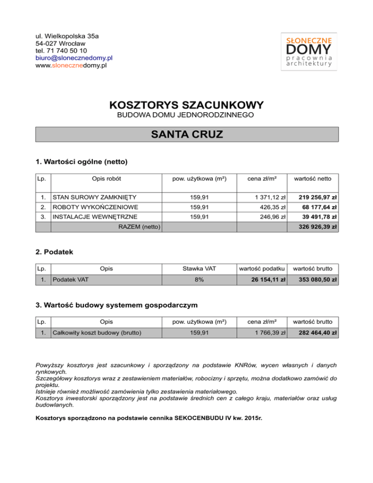 ul. Wielkopolska 35a 54-027 Wrocław tel. 71 740 50 10 [email protected] www.slonecznedomy.pl KOSZTORYS SZACUNKOWY BUDOWA DOMU JEDNORODZINNEGO SANTA CRUZ 1. Wartości ogólne (netto) Lp. Opis robót pow. użytkowa (m²) cena zł/m² wartość netto 1. STAN SUROWY ZAMKNIĘTY 159,91 1 371,12 zł 219 256,97 zł 2. ROBOTY WYKOŃCZENIOWE 159,91 426,35 zł 68 177,64 zł 3. INSTALACJE WEWNĘTRZNE 159,91 246,96 zł 39 491,78 zł RAZEM (netto) 326 926,39 zł 2. Podatek Lp. 1. Opis Podatek VAT Stawka VAT 8% wartość podatku 26 154,11 zł wartość brutto 353 080,50 zł 3. Wartość budowy systemem gospodarczym Lp. 1. Opis Całkowity koszt budowy (brutto) pow. użytkowa (m²) 159,91 cena zł/m² 1 766,39 zł wartość brutto 282 464,40 zł Powyższy kosztorys jest szacunkowy i sporządzony na podstawie KNRów, wycen własnych i danych rynkowych. Szczegółowy kosztorys wraz z zestawieniem materiałów, robocizny i sprzętu, można dodatkowo zamówić do projektu. Istnieje również możliwość zamówienia tylko zestawienia materiałowego. Kosztorys inwestorski sporządzony jest na podstawie średnich cen z całego kraju, materiałów oraz usług budowlanych. Kosztorys sporządzono na podstawie cennika SEKOCENBUDU IV kw. 2015r.