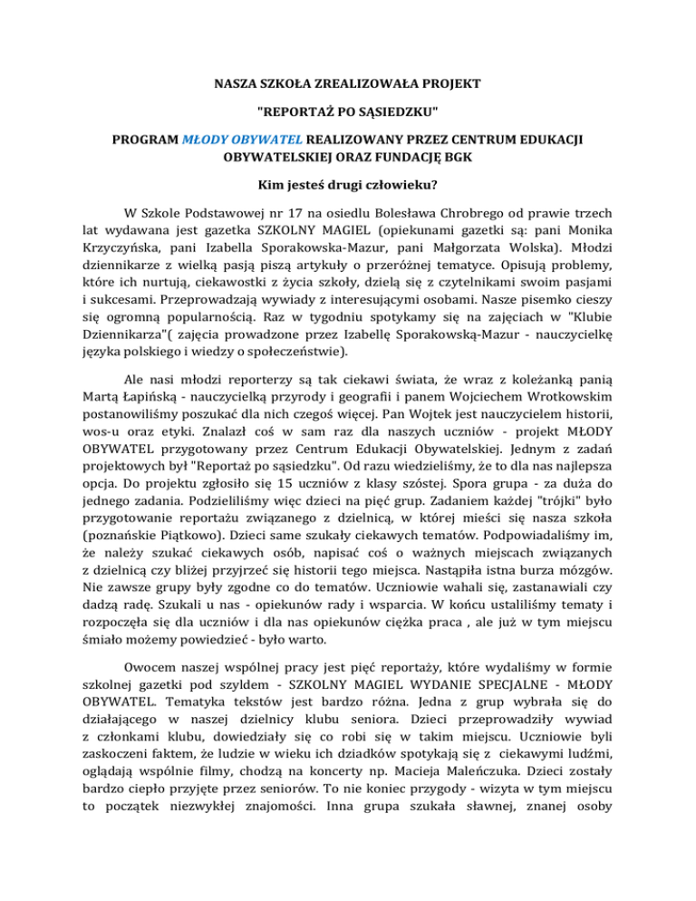NASZA SZKOŁA ZREALIZOWAŁA PROJEKT "REPORTAŻ PO SĄSIEDZKU" PROGRAM MŁODY OBYWATEL REALIZOWANY PRZEZ CENTRUM EDUKACJI OBYWATELSKIEJ ORAZ FUNDACJĘ BGK Kim jesteś drugi człowieku? W Szkole Podstawowej nr 17 na osiedlu Bolesława Chrobrego od prawie trzech lat wydawana jest gazetka SZKOLNY MAGIEL (opiekunami gazetki są: pani Monika Krzyczyńska, pani Izabella Sporakowska-Mazur, pani Małgorzata Wolska). Młodzi dziennikarze z wielką pasją piszą artykuły o przeróżnej tematyce. Opisują problemy, które ich nurtują, ciekawostki z życia szkoły, dzielą się z czytelnikami swoim pasjami i sukcesami. Przeprowadzają wywiady z interesującymi osobami. Nasze pisemko cieszy się ogromną popularnością. Raz w tygodniu spotykamy się na zajęciach w "Klubie Dziennikarza"( zajęcia prowadzone przez Izabellę Sporakowską-Mazur - nauczycielkę języka polskiego i wiedzy o społeczeństwie). Ale nasi młodzi reporterzy są tak ciekawi świata, że wraz z koleżanką panią Martą Łapińską - nauczycielką przyrody i geografii i panem Wojciechem Wrotkowskim postanowiliśmy poszukać dla nich czegoś więcej. Pan Wojtek jest nauczycielem historii, wos-u oraz etyki. Znalazł coś w sam raz dla naszych uczniów - projekt MŁODY OBYWATEL przygotowany przez Centrum Edukacji Obywatelskiej. Jednym z zadań projektowych był "Reportaż po sąsiedzku". Od razu wiedzieliśmy, że to dla nas najlepsza opcja. Do projektu zgłosiło się 15 uczniów z klasy szóstej. Spora grupa - za duża do jednego zadania. Podzieliliśmy więc dzieci na pięć grup. Zadaniem każdej "trójki" było przygotowanie reportażu związanego z dzielnicą, w której mieści się nasza szkoła (poznańskie Piątkowo). Dzieci same szukały ciekawych tematów. Podpowiadaliśmy im, że należy szukać ciekawych osób, napisać coś o ważnych miejscach związanych z dzielnicą czy bliżej przyjrzeć się historii tego miejsca. Nastąpiła istna burza mózgów. Nie zawsze grupy były zgodne co do tematów. Uczniowie wahali się, zastanawiali czy dadzą radę. Szukali u nas - opiekunów rady i wsparcia. W końcu ustaliliśmy tematy i rozpoczęła się dla uczniów i dla nas opiekunów ciężka praca , ale już w tym miejscu śmiało możemy powiedzieć - było warto. Owocem naszej wspólnej pracy jest pięć reportaży, które wydaliśmy w formie szkolnej gazetki pod szyldem - SZKOLNY MAGIEL WYDANIE SPECJALNE - MŁODY OBYWATEL. Tematyka tekstów jest bardzo różna. Jedna z grup wybrała się do działającego w naszej dzielnicy klubu seniora. Dzieci przeprowadziły wywiad z członkami klubu, dowiedziały się co robi się w takim miejscu. Uczniowie byli zaskoczeni faktem, że ludzie w wieku ich dziadków spotykają się z ciekawymi ludźmi, oglądają wspólnie filmy, chodzą na koncerty np. Macieja Maleńczuka. Dzieci zostały bardzo ciepło przyjęte przez seniorów. To nie koniec przygody - wizyta w tym miejscu to początek niezwykłej znajomości. Inna grupa szukała sławnej, znanej osoby z Piątkowa. Uczniowie myśleli o sportowcach, pisarzach, planowali nawet zrobić wywiad z modelką z naszej dzielnicy. W końcu jednogłośnie wybrali do swojego reportażu zespół "Psychodrama". To muzycy przed czterdziestką, którzy od 20 lat wspólnie grają. Wychowali się w naszej dzielnicy i nadal tu mieszkają. Zespół zawitał do naszej szkoły. Młodzi reporterzy byli bardzo przejęci, jednak spotkanie szybko przerodziło się w miłą pogawędkę. Muzycy i dzieci chętnie robili sobie wspólne zdjęcia. Kolejna grupa na tematykę artykułu wybrała Piątkowskie Centrum Kultury "Dąbrówka". Dzieci nie tylko opisały historię tego miejsca, udało im się spotkać z jednym z pracowników działającej tam biblioteki. Na ciekawy pomysł wpadły dzieci z kolejnej naszej grupy. Uczniowie postanowili znaleźć trzy osoby, które od urodzenia mieszkają na Piątkowie. Pytania do wywiadu dotyczyły zabaw dzieci sprzed 20 lat (kiedy nie było komputerów i telefonów). Zaskoczeni uczniowie słuchali o graniu w linkę, skakaniu przez gumę czy grze w kule duńskie. Ostatni reportaż był w naszej ocenie najbardziej wzruszający. Trzy dziewczynki spotkały się z rodzicami niepełnosprawnego dziecka. Opisały historię tej rodziny. A przede wszystkim skupiły się na tym, w jaki sposób tym ludziom pomagają sąsiedzi. Nawet my, opiekunowie, osoby dorosłe byliśmy zaskoczeni ilu ludzi jest gotowych do bezinteresownej pomocy. Pięć reportaży - pięć historii, rozmaita tematyka. Projekt nie był tylko ćwiczeniem pisania, zbierania informacji. Dzieci poszerzyły horyzonty, wysłuchały przeróżnych opowieści. Co najważniejsze wyszły poza mury szkolne. A to ważne, ponieważ szkoła to nie tylko nauka, to także uwrażliwianie na drugiego człowieka, to pokazywanie, jak funkcjonują społeczności. Projekt był dla uczniów nietypowym, bardzo cennym doświadczeniem. Również dla nas nauczycieli była to dobra lekcja. Wiemy, że należy częściej robić takie akacje- pokazywać to czego na co dzień dzieci nie widzą. A kto inny, jak nie my dorośli ma im to pokazać? Marta Łapińska Izabella Sporakowska-Mazur Wojciech Wrotkowski