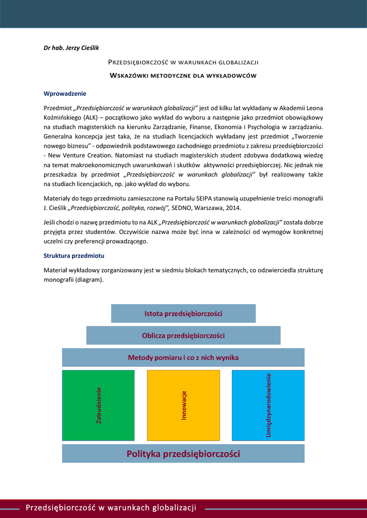 Dr hab. Jerzy Cieślik P RZEDSIĘBIORCZOŚĆ W WARUNKACH GLOBALIZACJI W SKAZÓWKI METODYCZNE DLA WYKŁADOWCÓW Wprowadzenie Przedmiot „Przedsiębiorczość w warunkach globalizacji” jest od kilku lat wykładany w Akademii Leona Koźmińskiego (ALK) – początkowo jako wykład do wyboru a następnie jako przedmiot obowiązkowy na studiach magisterskich na kierunku Zarządzanie, Finanse, Ekonomia i Psychologia w zarządzaniu. Generalna koncepcja jest taka, że na studiach licencjackich wykładany jest przedmiot „Tworzenie nowego biznesu” - odpowiednik podstawowego zachodniego przedmiotu z zakresu przedsiębiorczości - New Venture Creation. Natomiast na studiach magisterskich student zdobywa dodatkową wiedzę na temat makroekonomicznych uwarunkowań i skutków aktywności przedsiębiorczej. Nic jednak nie przeszkadza by przedmiot „Przedsiębiorczość w warunkach globalizacji” był realizowany także na studiach licencjackich, np. jako wykład do wyboru. Materiały do tego przedmiotu zamieszczone na Portalu SEIPA stanowią uzupełnienie treści monografii J. Cieślik „Przedsiębiorczość, polityka, rozwój”, SEDNO, Warszawa, 2014. Jeśli chodzi o nazwę przedmiotu to na ALK „Przedsiębiorczość w warunkach globalizacji” została dobrze przyjęta przez studentów. Oczywiście nazwa może być inna w zależności od wymogów konkretnej uczelni czy preferencji prowadzącego. Struktura przedmiotu Materiał wykładowy zorganizowany jest w siedmiu blokach tematycznych, co odzwierciedla strukturę monografii (diagram). Przedsiębiorczość w warunkach globalizacji Sposób prowadzenia zajęć W ramach zajęć prowadzonych w ALK testowane były różne warianty, poczynając od klasycznego wykładu po zajęcia warsztatowe, na których studenci prezentowali wyniki pracy w małych zespołach, natomiast podstawowe treści w poszczególnych blokach studenci studiowali we własnym zakresie, korzystając z monografii „Przedsiębiorczość, polityka, rozwój”. Wariantem pośrednim było podzielenie zajęć po połowie, gdzie w części wykładowej prowadzący omawiał najważniejsze kwestie w poszczególnych blokach tematycznych, wskazując studentom na co zwrócić szczególną uwagę w ramach studiów własnych. Zaliczenie Forma zaliczenia odpowiada zakładanym efektom kształcenia (patrz oddzielna zakładka). Podstawowy sprawdzian wiedzy jest przeprowadzony w formie testu zawierającego pytania wielokrotnego wybory. Na każdy blok tematyczny przypada ok. 10 pytań. Opracowany zestaw pytań testowych może być udostępniony zainteresowanym wykładowcom w trybie indywidualnym. Jeśli chodzi o sprawdzenie umiejętności, dotychczas były one weryfikowane w formie esejów bądź prezentacji dotyczących wybranego rodzaju przedsiębiorczości (w Bloku II omawiane są 24 rodzaje przedsiębiorczości). Ćwiczenie to jest realizowane w 2-3 osobowych zespołach, z wykorzystaniem dodatkowych materiałów umieszczonych w zakładce Literatura do prezentacji i esejów. Przykładowa struktura i forma eseju/prezentacji podane są w zakładce Prezentacje. Przewiduje się, że w roku akademickim 2015/2016 będą dodatkowo weryfikowane umiejętności dotyczące analizy porównawczej różnych aspektów przedsiębiorczości, z zastosowaniem metod ilościowych. Zadanie to będzie realizowane w odniesieniu do Bloku III z wykorzystaniem międzynarodowych baz danych Global Entrepreneurship Monitor i Eurostat a w odniesieniu do Bloku IV z wykorzystaniem specjalnie Opracowanej Bazy amerykańskich gazel Inc. Baza w Excel wraz z opisem znajduje się w oddzielnej zakładce. Materiały pomocnicze dla studentów i wykładowców Aktualnie dla studentów zamieszczone są prezentacje do poszczególnych bloków tematycznych w PDF. Ze względu na objętość Blok II Oblicza przedsiębiorczości został podzielony na dwie części. Te same prezentacje oraz dodatkowe dla wykładowców zamieszczone są w formie otwartej w PPT. Wykładowcy mają możliwość korzystania z tych przykładowych slajdów w dowolny sposób, ich dokonując modyfikacji, uzupełnienia czy też zmieniając format graficzny w zależności od wymogów uczelni. Mogą to zrobić bez konieczności powoływania się na źródło czy autorstwo bowiem zgodnie z generalnymi zasadami materiały zamieszczone na SEIPA znajdują się w domenie publicznej. Można jedynie dodać końcowy slajd z zaznaczeniem „W prezentacji wykorzystano materiały udostępnione przez dr hab. J. Cieślika na Portalu SEIPA”. Przewiduje się, że materiały dydaktyczne w poszczególnych blokach tematycznych będą stopniowo uzupełniane w dodatkowych zakładkach: Materiały, Linki, Narzędzia, Pytania kontrolne, itd. Przedsiębiorczość w warunkach globalizacji