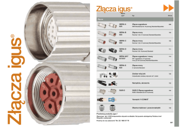 Złącza igus ® Złącza igus® Typ Strona Złącza igus ® Złącza SERIA A 623 Złącza sygnałowe SERIA B 923 Złącza mocy SERIA C 940 Złącza mocy SERIA D 958 Złącza mocy SERIA M17 617/917 SERIA S 623 698 M23 Standard [6 do 19-pinowy] Standard/Speedtec 703 Rozmiar 1 [6, 8 i 9-pinowe] Standard/Speedtec 708 Rozmiar 1 [6, 8 i 9-pinowe] Standard/Speedtec 711 Rozmiar 3 [6 i 8-pinowe] Standard Złącza sygnałowe i mocy 713 M17 sygnałowe- [17-pinowe] i mocy [4 do 9-pinowe] Standard/Speedtec Złącza mocy 718 [1-pinowe] Standard Zestaw wtyczek 720 Indywidualne zestawy wtyczek od 1 sztuki SUB-D Narzędzia, akcesoria 722 SUB-D Złącza sygnałowe 724 SUB-D Standard [9 do 44-pinowe] Yamaichi Y-CONKIT 728 Dławice kablowe i przeciwnakrętki 730 Przetestuj produkty igus ! ® Złącza igus® jak i 3.500 komponentów wtyczek na składzie. Na życzenie udostępnimy Państwu inne! Wszystko z jednej ręki! Prosimy do nas zadzwonić! Tel. 22 / 863 57 70 697 Seria A INTERCONTEC | Złącza Seria A | Standard/Speedtec Złącza sygnałowe M23 Standard, 6 do 19-pinowy Rodzaje l Złącze, wersja standardowa i push-pull, złącze kątowe l Wpusty kablowe l Łącznik standardowy lub z centralnym mocowaniem Wtyczka sygnałowa [9 do 19-pinowa] (Konstrukcja metalowa, osłona EMC) l Skrzynka instalacyjna PG 13,5 l Prosta skrzynka instalacyjna z kołnierzem l Kątowa i obrotowa skrzynka instalacyjna okablowana giętkim przewodem izolowanym z kołnierzem Ilustracja przykładowa. Nr art. Liczba pinów wkładki izolacyjnej Wkładka Styk gniazdo- izolacyjna wy zaciskany zagniatania wy zaciskany zagniatania l 6, 7, [8+1], 9, 10, 12, 16, 17, [16+3] MAT0179600 SERIA A dane techniczne Zakres temperatur Klasa ochrony Seria A INTERCONTEC | Złącza Seria A | Standard Typ P Wkład do Styk gniazdo- Wkład do [mm] [mm²] [mm] [mm²] 8x1,0 0,14-1,0 1x2,0 0,35-2,5 12x1,0 Pow. PLN/ karbowaniasztukę Zaciskarka ręczna + Wkładka [mm] 9,0-13,2 63,75 C+1+4 0,14-1,0 9,0-13,2 63,75 A 16x1,0 0,14-1,0 9,0-13,2 63,15 A 17x1,0 0,14-1,0 9,0-13,2 69,40 A 16x1,0 0,14-1,0 9,0-13,2 69,40 C+1+5 [8+1]-pinowe -20 °C do 130 °C IP 66/67 [z zaślepką] 3 rowki kodujące MAT0179601 Typ E 12-pinowe Dane techniczne – Sygnałowych – 6-12-pinowe Max. prąd znamionowy Napięcie znamionowe Napięcie probiercze (L-L) Oporność Wielokrotność połączeń 3 rowki kodujące 10 A 160 V (AC/DC) 2500 V < 5 mΩ > 50 MAT0179602 Typ P 16-pinowe 1 rowek kodujący MAT0179603 Typ P 17-pinowe 3 rowki kodujące Dane techniczne – Sygnałowych – 16-19-pinowe Max. prąd znamionowy Napięcie znamionowe Napięcie probiercze (L-L) Oporność Wielokrotność połączeń MAT0179604 9A 125 V (AC/DC) 2500 V < 5 mΩ > 50 Typ P 3x1,5 0,14-1,0 [16+3]-pinowe 1 rowek kodujący Gniazdo pulpitowe (Konstrukcja metalowa, uszczelka osiowa) Dane zgodnie z VDE 0110/EN 61984, klauzula 6.19.2.2 Stopień zanieczyszczenia Kategoria przepięcia Max. wysokość pracy 3 III 2000 m Zastosowane materiały Osłona Nakrętka łącząca Wkładka izolacyjna Piny Osłony Pierścień zaciskowy Ilustracja przykładowa. Ciśnieniowo odlewana cynkowa/mosiężna, niklowana Mosiężna, niklowana PA 6.6/PBT, UL 94/V0 Mosiężne, pozłacane FPM/HNBR Mosiężny, niklowany Nr art. Ilość pinów + www.igus.pl/quickpin igus® QuickPin – konfiguracja readycable® PLN/ Zaciskarka ręczna sztukę + Wkładka MAT0179605 [8+1] 63,20 C+1+4 MAT0179606 12 58,90 A MAT0179607 16 67,60 A MAT0179608 17 64,50 A MAT0179609 [16+3] 97,10 C+1+5 Zaciskarki ręczne i wkładki 698 Do montażu prostego odbiornika sygnału służą styki i izolacje. Zastosowanie mają odpowiednie specyfikacje techniczne. Konstrukcja nie wymaga użycia obejmy kablowej. Pierścień O-ring strona 722 ... bez minimalnej ilości zamówienia ... igus® Sp. z o. o. Polska | tel: 22 / 863 57 70 | faks: 22 / 863 61 69 | [email protected] 699 Seria A INTERCONTEC | Złącza Seria A | Speedtec Seria A INTERCONTEC | Złącza Seria A | Standard Wtyczka sygnałowa [9 - 19-pinowa] (Konstrukcja metalowa, osłona EMC) Wtyczka sygnałowa [9 - 19-pinowa] (Konstrukcja metalowa, osłona EMC) M 26 58 Ilustracja przykładowa. Nr art. Ilustracja przykładowa. Wkładka Styk gniazdo- izolacyjna wy zaciskany zagniatania wy zaciskany zagniatania karbowania sztukę MAT01723461 Typ P Wkład do Styk gniazdo- Wkład do [mm] [mm²] [mm] [mm²] 8x1,0 0,14-1,0 1x2,0 0,35-2,5 Pow. PLN/ Nr art. ręczna + Ochrona przed wibracją 63,75 C+1+4 MAT0179610 [8+1]-pinowe Zaciskarka Wkładka Styk do Wkład do Styk do izolacyjna zaciskania zagniatania zaciskania [mm] [mm²] [mm] [mm²] [mm] 8x1,0 0,14-1,0 1x2,0 0,35-2,5 9,0-13,2 61,90 C+1+4 12x1,0 0,14-1,0 9,0-13,2 61,90 A 16x1,0 0,14-1,0 9,0-13,2 66,25 A 17x1,0 0,14-1,0 9,0-13,2 67,50 A 16x1,0 0,14-1,0 9,0-13,2 69,40 C+1+5 Wkładka [mm] 9,0-13,2 Zaciskarka Typ E Wkład do Pow. PLN/ zagniatania karbowania sztukę ręczna + Wkładka [8+1]-pinowe 3 rowki kodujące 3 rowki kodujące MAT01723462 Typ E 12x1,0 0,14-1,0 9,0-13,2 63,75 A MAT0179611 Typ P 12-pinowe 12-pinowe 3 rowki kodujące 3 rowki kodujące MAT01723463 Typ P 16x1,0 0,14-1,0 9,0-13,2 63,15 A MAT0179612 Typ E 16-pinowe 16-pinowe 1 rowek kodujący 1 rowek kodujący MAT01723464 Typ P 17x1,0 0,14-1,0 9,0-13,2 69,40 A MAT0179613 Typ E 17-pinowe 17-pinowe 3 rowki kodujące 3 rowki kodujące MAT01723465 Typ P 16x1,0 0,14-1,0 3x1,5 0,14-1,0 9,0-13,2 69,40 C+1+5 MAT0179614 Typ E [16+3]-pinowe [16+3]-pinowe 1 rowek kodujący 1 rowek kodujący Gniazdo pulpitowe (Konstrukcja metalowa, uszczelka osiowa) 3x1,5 0,14-1,0 Gniazdo pulpitowe (Konstrukcja metalowa, uszczelka osiowa) 35 2,5 Ilustracja przykładowa. Nr art. M 26 M 19,8 1 PLN/ Zaciskarka ręczna sztukę + Wkładka Nr art. Do montażu prostego odbiornika sygnału służą styki i izolacje. Zastosowanie mają odpowiednie specyfikacje techniczne. Konstrukcja nie wymaga użycia obejmy kablowej. j493 Ilustracja przykładowa. PierścieńO-Ring O-ring Ilość biegunów Ochrona wibracyjna Do montażu prostego odbiornika sygnału służ