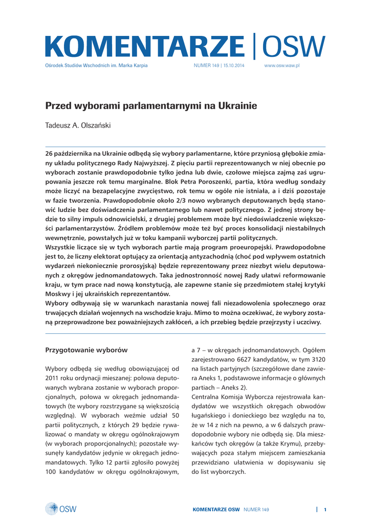 Ośrodek Studiów Wschodnich im. Marka Karpia NUMER 149 | 15.10.2014 www.osw.waw.pl Przed wyborami parlamentarnymi na Ukrainie Tadeusz A. Olszański 26 października na Ukrainie odbędą się wybory parlamentarne, które przyniosą głębokie zmiany układu politycznego Rady Najwyższej. Z pięciu partii reprezentowanych w niej obecnie po wyborach zostanie prawdopodobnie tylko jedna lub dwie, czołowe miejsca zajmą zaś ugrupowania jeszcze rok temu marginalne. Blok Petra Poroszenki, partia, która według sondaży może liczyć na bezapelacyjne zwycięstwo, rok temu w ogóle nie istniała, a i dziś pozostaje w fazie tworzenia. Prawdopodobnie około 2/3 nowo wybranych deputowanych będą stanowić ludzie bez doświadczenia parlamentarnego lub nawet politycznego. Z jednej strony będzie to silny impuls odnowicielski, z drugiej problemem może być niedoświadczenie większości parlamentarzystów. Źródłem problemów może też być proces konsolidacji niestabilnych wewnętrznie, powstałych już w toku kampanii wyborczej partii politycznych. Wszystkie liczące się w tych wyborach partie mają program proeuropejski. Prawdopodobne jest to, że liczny elektorat optujący za orientacją antyzachodnią (choć pod wpływem ostatnich wydarzeń niekoniecznie prorosyjską) będzie reprezentowany przez niezbyt wielu deputowanych z okręgów jednomandatowych. Taka jednostronność nowej Rady ułatwi reformowanie kraju, w tym prace nad nową konstytucją, ale zapewne stanie się przedmiotem stałej krytyki Moskwy i jej ukraińskich reprezentantów. Wybory odbywają się w warunkach narastania nowej fali niezadowolenia społecznego oraz trwających działań wojennych na wschodzie kraju. Mimo to można oczekiwać, że wybory zostaną przeprowadzone bez poważniejszych zakłóceń, a ich przebieg będzie przejrzysty i uczciwy. Przygotowanie wyborów Wybory odbędą się według obowiązującej od 2011 roku ordynacji mieszanej: połowa deputowanych wybrana zostanie w wyborach proporcjonalnych, połowa w okręgach jednomandatowych (te wybory rozstrzygane są większością względną). W wyborach weźmie udział 50 partii politycznych, z których 29 będzie rywalizować o mandaty w okręgu ogólnokrajowym (w wyborach proporcjonalnych); pozostałe wysunęły kandydatów jedynie w okręgach jednomandatowych. Tylko 12 partii zgłosiło powyżej 100 kandydatów w okręgu ogólnokrajowym, a 7 – w okręgach jednomandatowych. Ogółem zarejestrowano 6627 kandydatów, w tym 3120 na listach partyjnych (szczegółowe dane zawiera Aneks 1, podstawowe informacje o głównych partiach – Aneks 2). Centralna Komisja Wyborcza rejestrowała kandydatów we wszystkich okręgach obwodów ługańskiego i donieckiego bez względu na to, że w 14 z nich na pewno, a w 6 dalszych prawdopodobnie wybory nie odbędą się. Dla mieszkańców tych okręgów (a także Krymu), przebywających poza stałym miejscem zamieszkania przewidziano ułatwienia w dopisywaniu się do list wyborczych. KOMENTARZE OSW NUMER 149 1 Kampania wyborcza Inaczej niż w poprzednich wyborach, tegoroczna rywalizacja odbywa się przede wszystkim w ramach dwóch głównych grup: „patriotyczno-rewolucyjnej”, głównym wyznacznikiem której jest poparcie dla prezydenta Poroszenki oraz integralności terytorialnej kraju i „staroreżimowo-prorosyjskiej”, której wyznacznikiem jest zdecydowany sprzeciw wobec rewolucyjnej zmiany władzy z lutego 2014 roku. Są to izolowane od siebie grupy wyborców, a partie odwołujące się do jednej z nich nie dążą do rozszerzenia wpływów poza nią. Taki podział jest wynikiem rewolucji godności (jak na Ukrainie nazywa się protesty społeczne z listopada 2013–lutego 2014 roku) i późniejszej wojny, które przyczyniły się nie tylko do polaryzacji, ale też do liczebnego wzmocnienia pierwszej i osłabienia drugiej grupy wyborców. Większość liczących się partii odwołuje się do haseł patriotycznych i rewolucyjnych (tj. głównie lustracyjnych i antykorupcyjnych). Rywalizacja przebiega między Blokiem Petra Poroszenki i Frontem Ludowym z jednej strony, a Batkiwszczyną i Partią Radykalną z drugiej. Duże znaczenie ma też rywalizacja między Batkiwszczyną a Partią Radykalną. Blok i Front nie krytykują się nawzajem i zapowiadają podpisanie przed wyborami umowy koalicyjnej. Można zastanawiać się, czy bardziej stanowcze i wojownicze stanowisko polityków Frontu w sprawie Donbasu nie jest uzgodnionym z Blokiem Poroszenki elementem wspólnej taktyki. Natomiast Front Ludowy walczy z Batkiwszczyną nie tylko o elektorat, ale i o struktury partyjne, zaś Partia Radykalna apeluje do części tradycyjnego elektoratu Batkiwszczyny: słabo wykształconych mieszkańców wsi i małych miasteczek. Głównym elementem kampanii Bloku Petra Poroszenki są działania prezydenta, w tym przeforsowanie przezeń w parlamencie ustawy lustracyjnej i pakietu ustaw antykorupcyjnych (ostateczne ich uchwalenie nastąpiło 14 października). Jednocześnie patriotyczna retoryka Poroszenki ma ukryć fakt, że Ukraina przegrała wojnę (choć walki na ograniczoną skalę wciąż się toczą) i musi dostosować do tego faktu swą politykę. Ochotnicze bataliony walczące w Donbasie stały się bowiem istotnym elementem polityki wewnętrznej, a ich wycofywanie na wypoczynek w październiku zwiększa wpływ ich członków na elektorat w wielu regionach. Inaczej niż w poprzednich wyborach, tegoroczna rywalizacja odbywa się przede wszystkim w ramach dwóch głównych grup: „patriotyczno-rewolucyjnej” i „staroreżimowo-prorosyjskiej”. W niektórych okręgach jednomandatowych siły „obozu patriotycznego” uzgadniają kandydatury, tak by nie dopuścić do wygrania wyborów przez przedstawicieli „starego reżimu”. Blok Poroszenki nie wysunął kandydatów w części obwodów, gwarantując w ten sposób mandaty kilku członkom Swobody, ale np. i wieloletniemu przewodniczącemu Rady Najwyższej, Wołodymyrowi Łyt